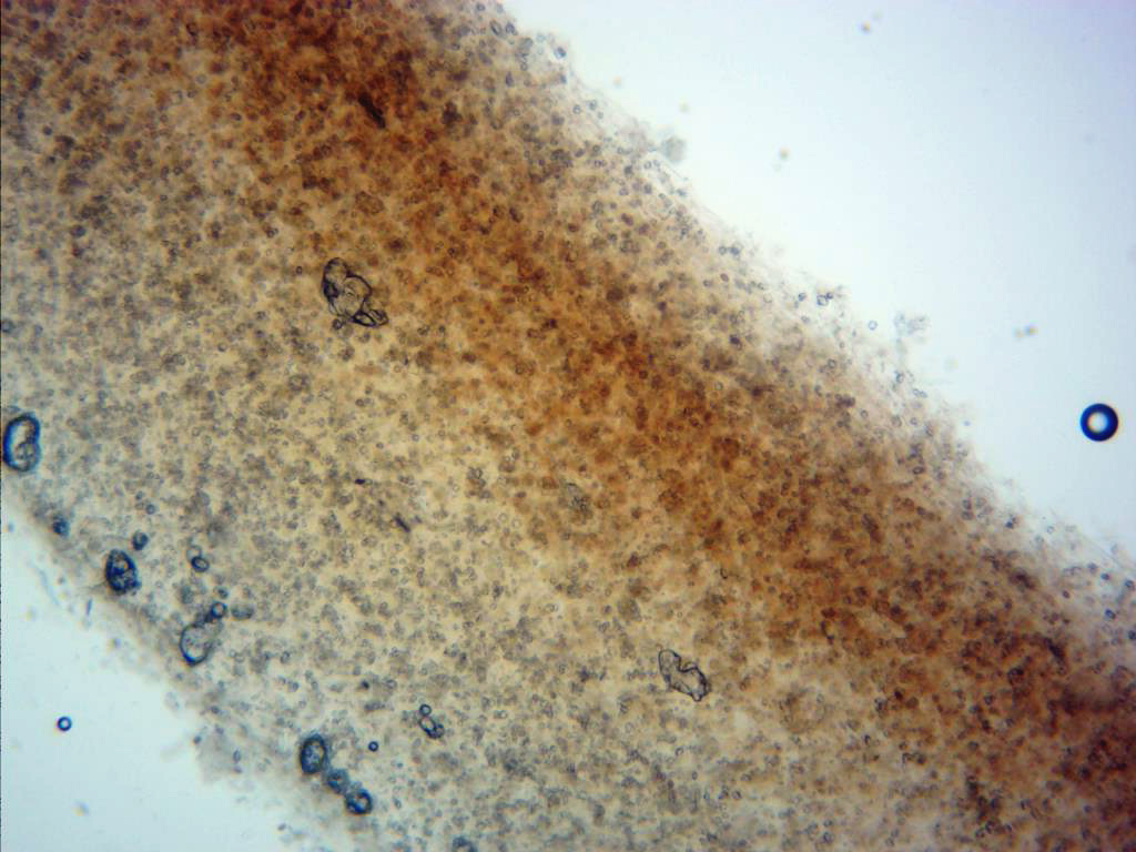 Esporas en reactivo de Melzer, con reacción dextrinoide.