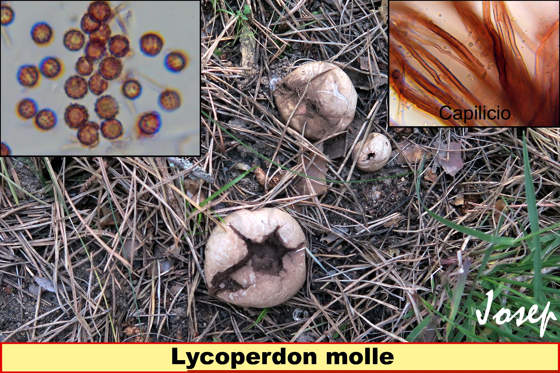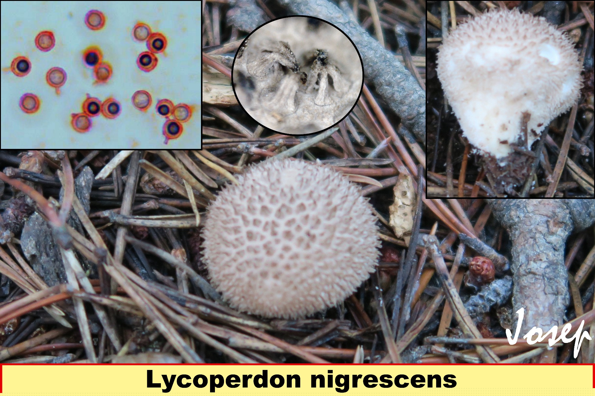 Descartaría el Lycoperdon molle ya que este presenta unas muy finas espinas que se desprenden fácilmente, descartaría asimismo el Lycoperdon umbrinum ya que a pesar de presentar una coloración muy parecida a tu propuesta al igual que el molle sus espinas se desprenden muy fácilmente, este detalle no lo observo en tus ejemplares. A mi modo de ver el mejor candidato para tu propuesta sería el Lycoperdon nigrescens.
