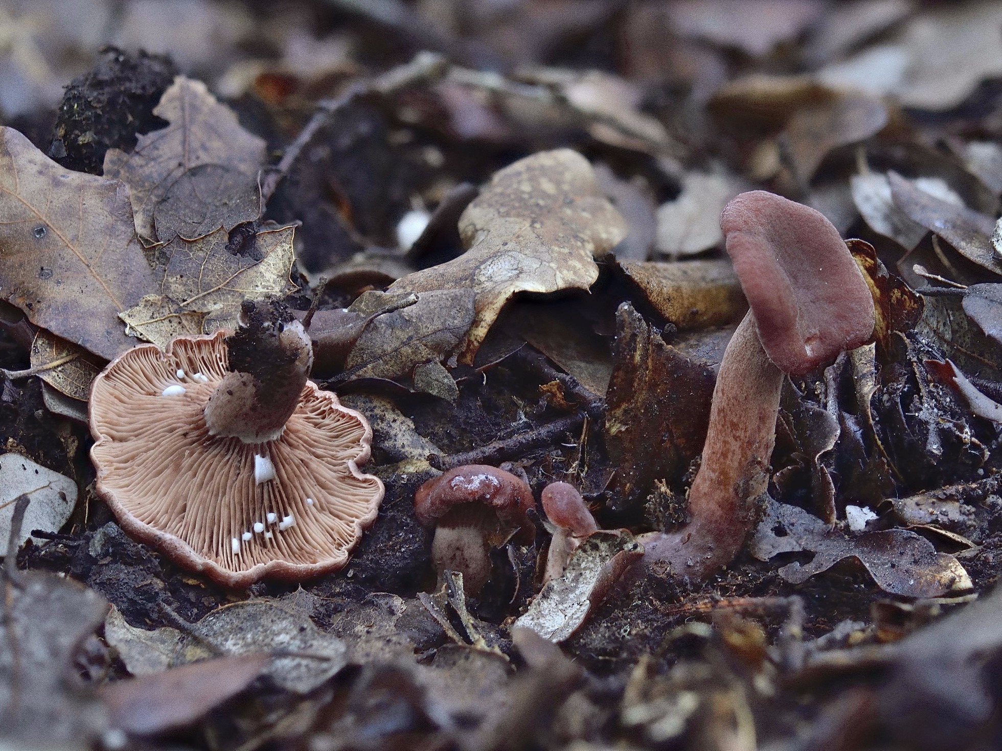 Propios de encinares, con látex blanco y que mas o menos encajen con tus imágenes se me ocurren de memoria al Lactarius decipiens, el Lactarius atlanticus y el Lactarius rugatus, estos últimos con coloraciones muy variables, aunque vamos a esperar a ver que opinan los maestros.