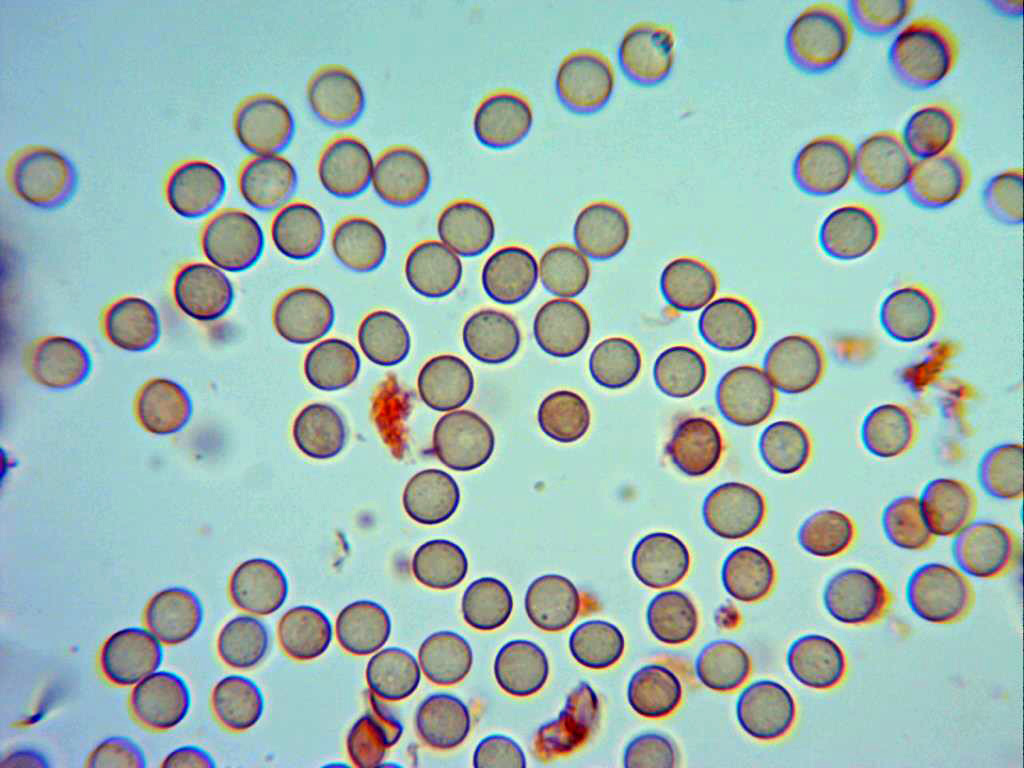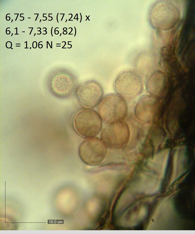 Esporas muy ligeramente y suavemente verrucosas y en mis mediciones de entre 5,5 y 6,7 micras.