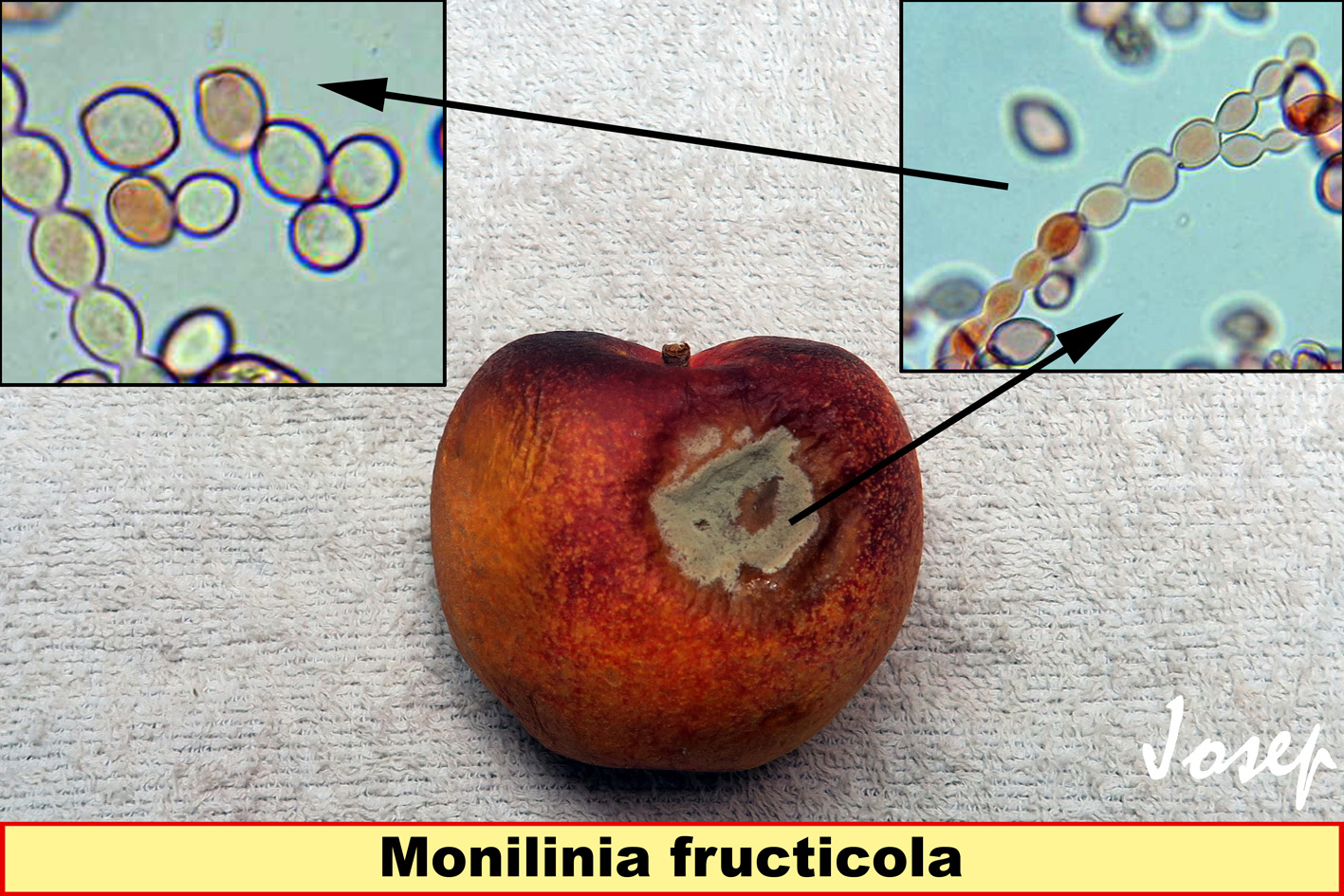 Pues................., no sé, siento en el alma el no estar de acuerdo con nuestro amigo Javier, la Monilinia fructigena que nos propone acostumbra a presentarse en círculos concéntricos, detalle que no aprecio para nada en tus imágenes, para mi que se trata de Monilinia fructicola, especie a la que he tenido el placer de pasarla por el micro. Te dejo una imagen mía de la especie así como unos enlaces de la misma.