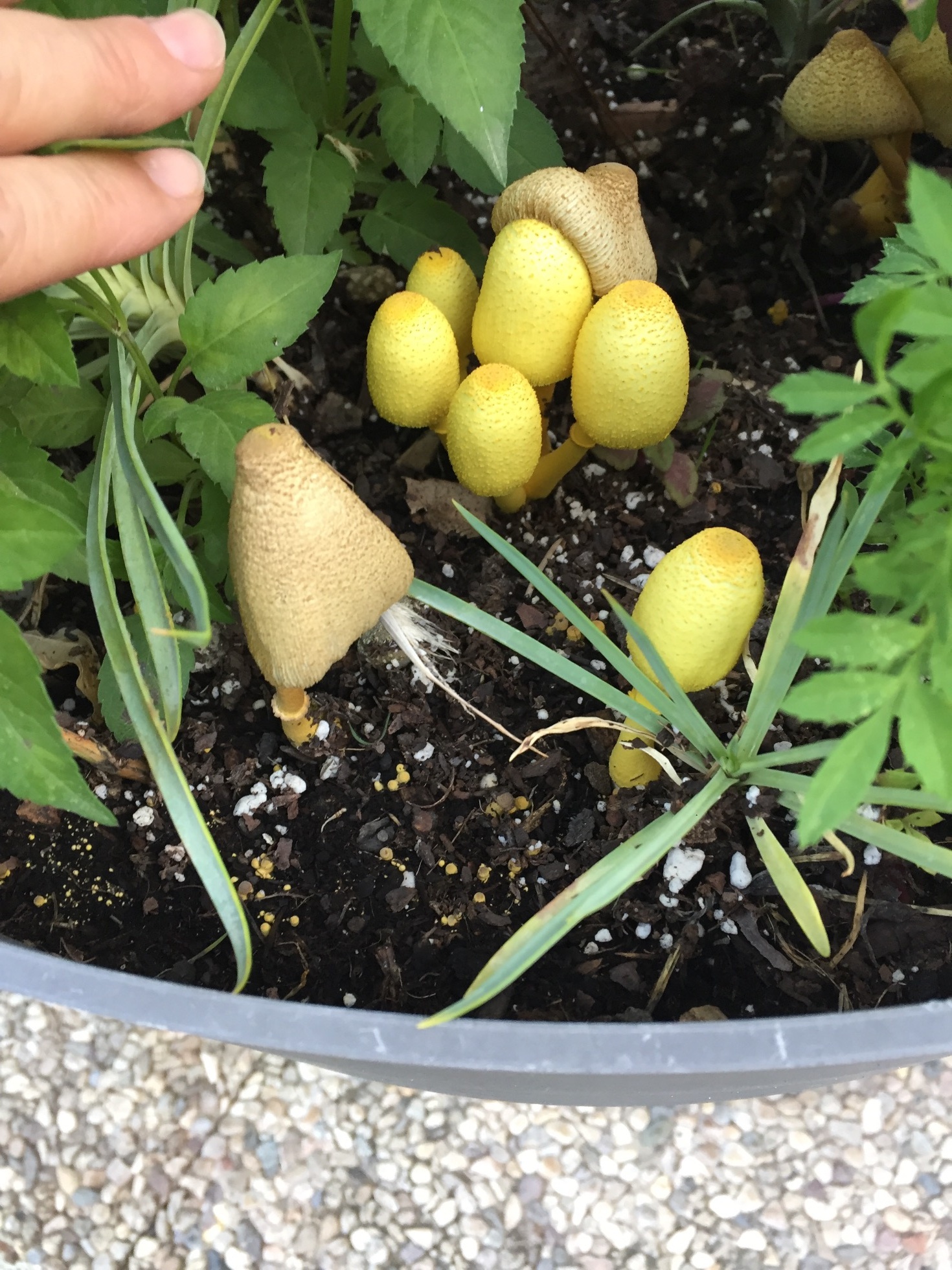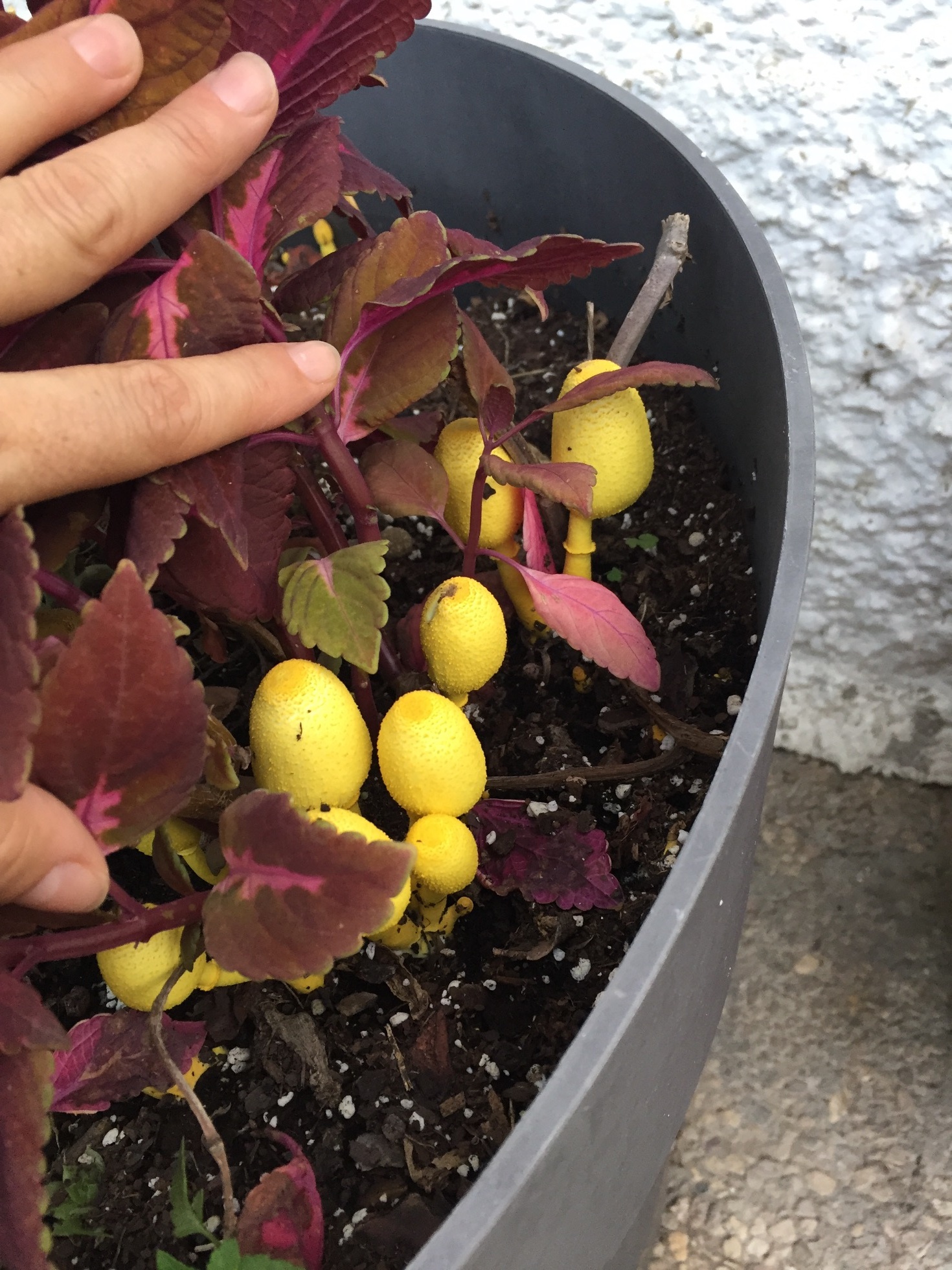 Hola de nuevo Rocio, las que te ha salido en tu maceta se tratan de Leucocoprinus birnbaumii muy común en esos sustratos.