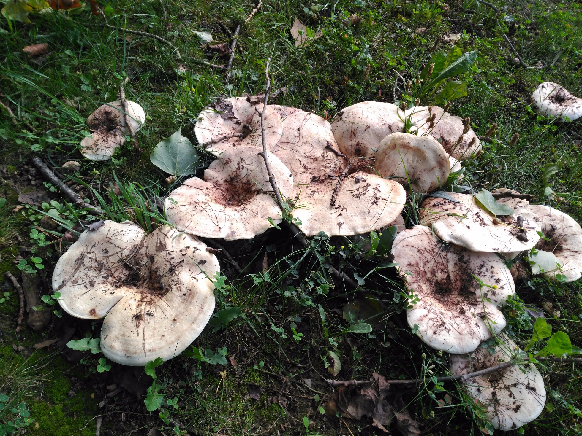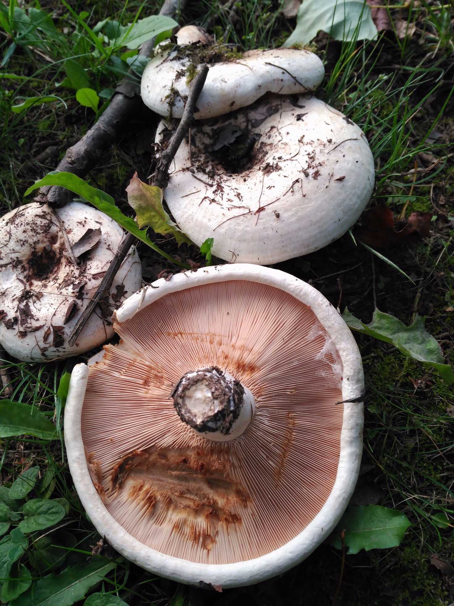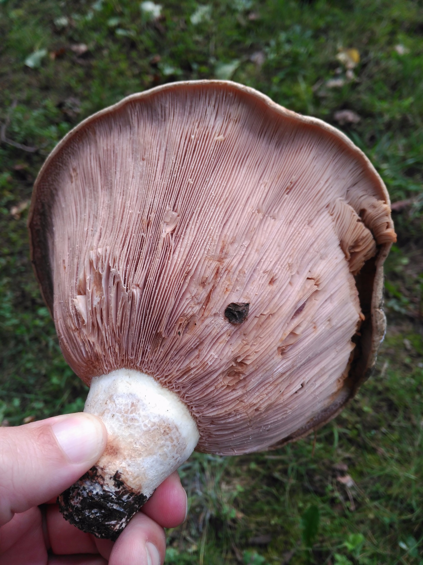 Hola Diego, con las medidas que nos indicas y con las láminas decurrentes que observo en tus imágenes, no se me ocurre otro que el Leucopaxillus candidus (puede llegar hasta los 30 cm.), o hasta incluso Leucopaxillus giganteus (hasta 45 cm.), lo que no termina de encajarme es el color de las láminas que se ven pardo rosadas y deberían ser mas blanquecinas, aunque algunos autores consideran que sí pueden adquirir un color rosado.