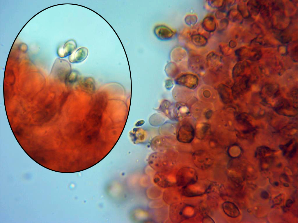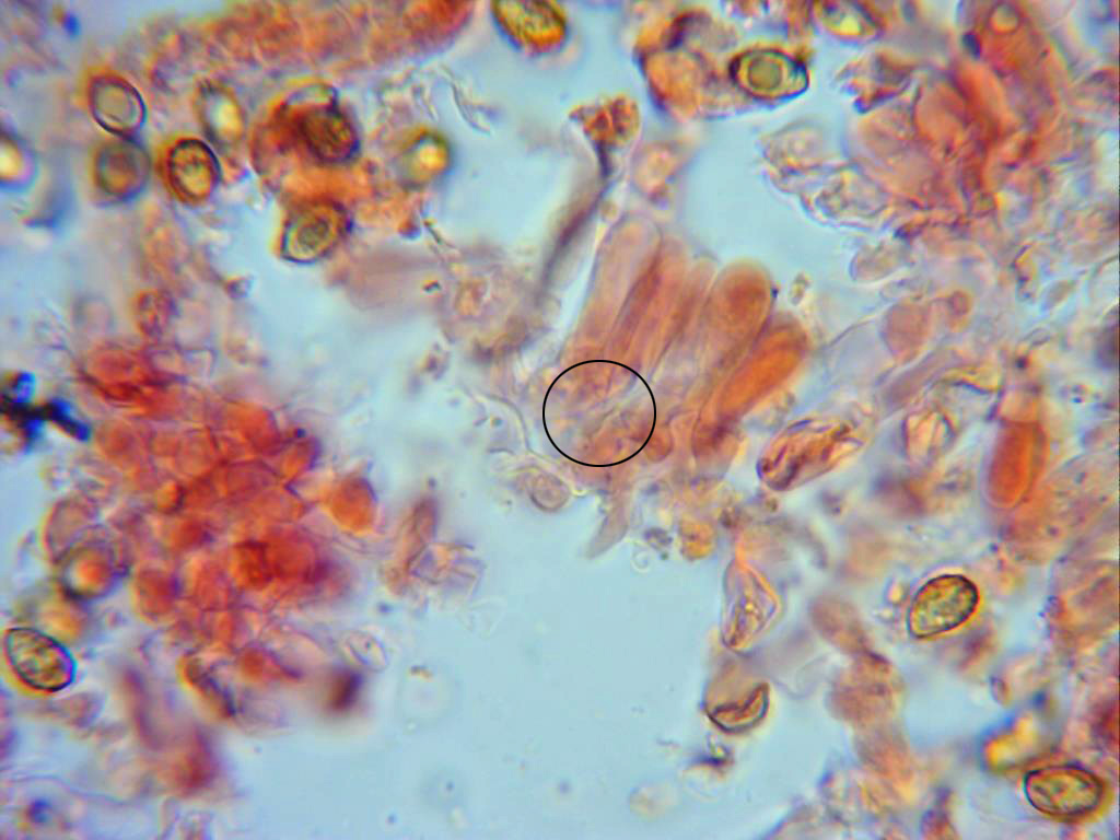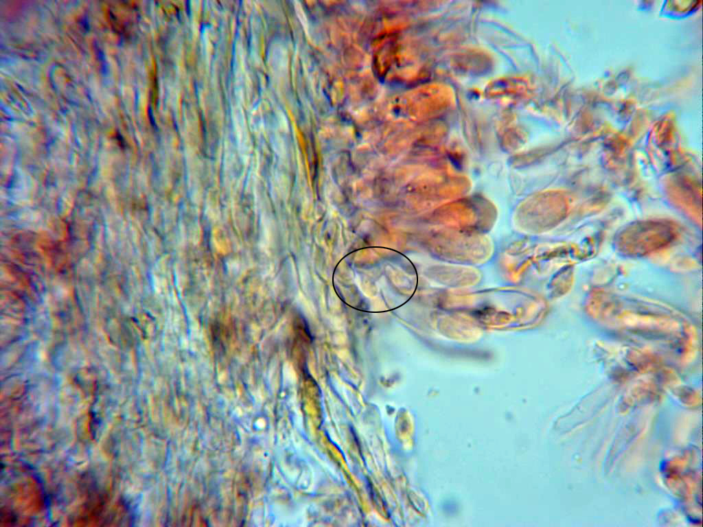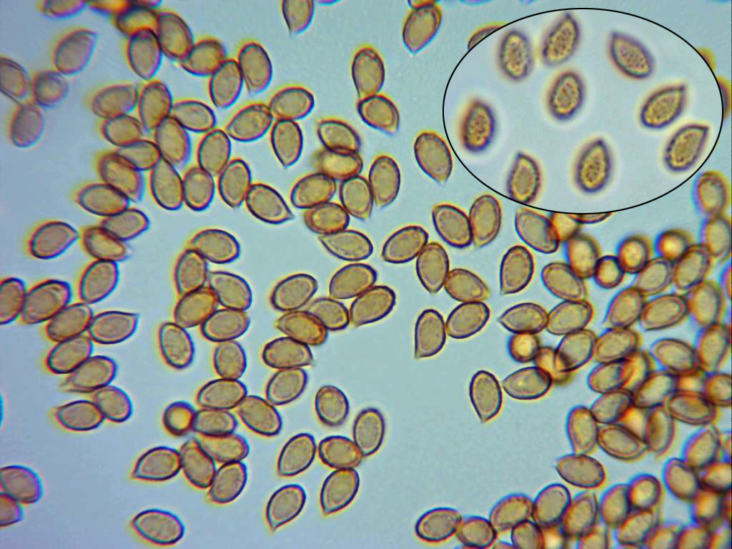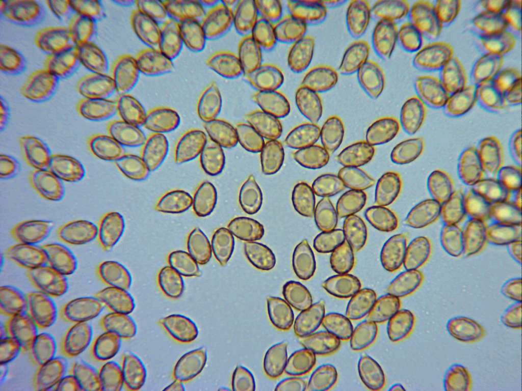 Esporas en rojo congo muy diluido, de pared gruesa, de forma entre almendrada y amigdaliforme, con una marcada apícula y mayoritariamente con una sola vacuola en su interior. Las medidas de estas de 6,4;8,4 X 4,2;5,2 µm.
