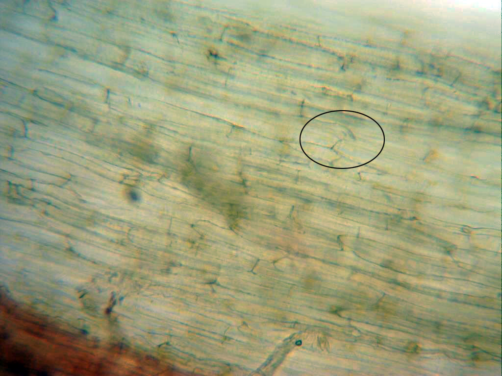 Sección de la cutícula a 400 aumentos, con hifas irregulares, bastante anchas y dispuestas mas o menos paralelamente.