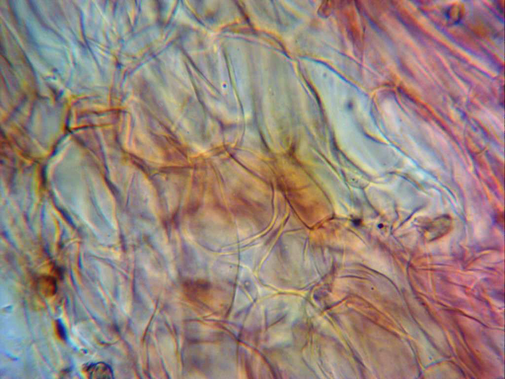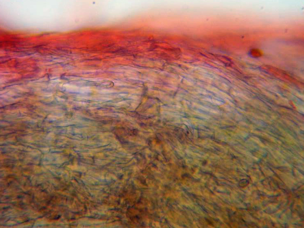 Estipitipellis a 400 aumentos, sin caulocistidios, con hifas anchas, dispuestas paralelamente y con alguna que otra fíbula.