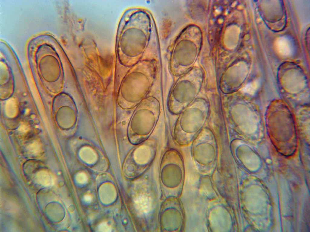 Ascas octospóricas de considerable tamaño, con las ascosporas dispuestas en fila.