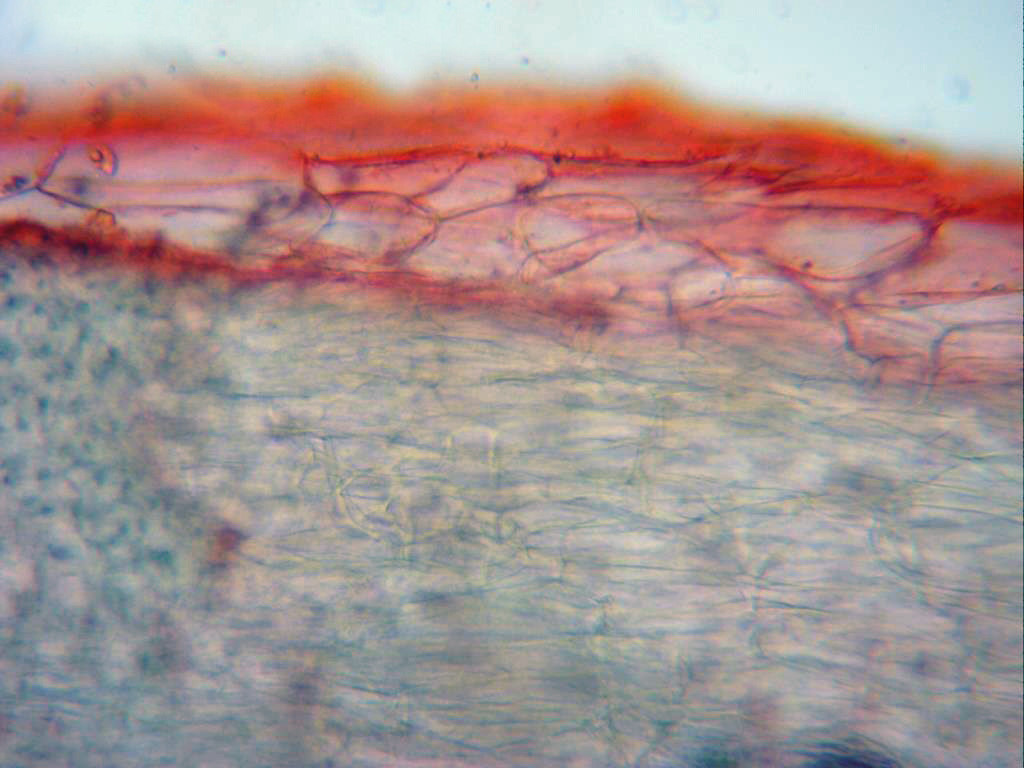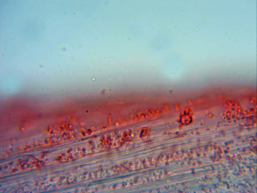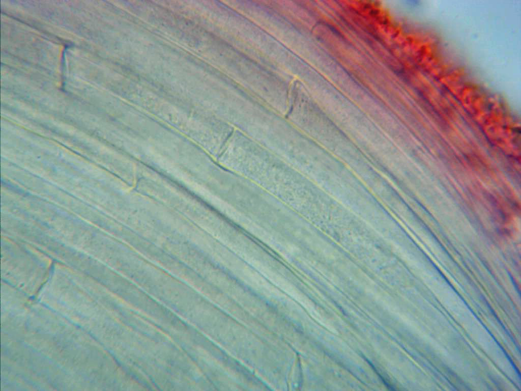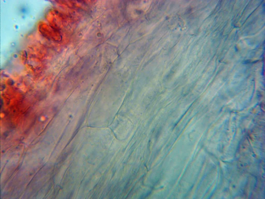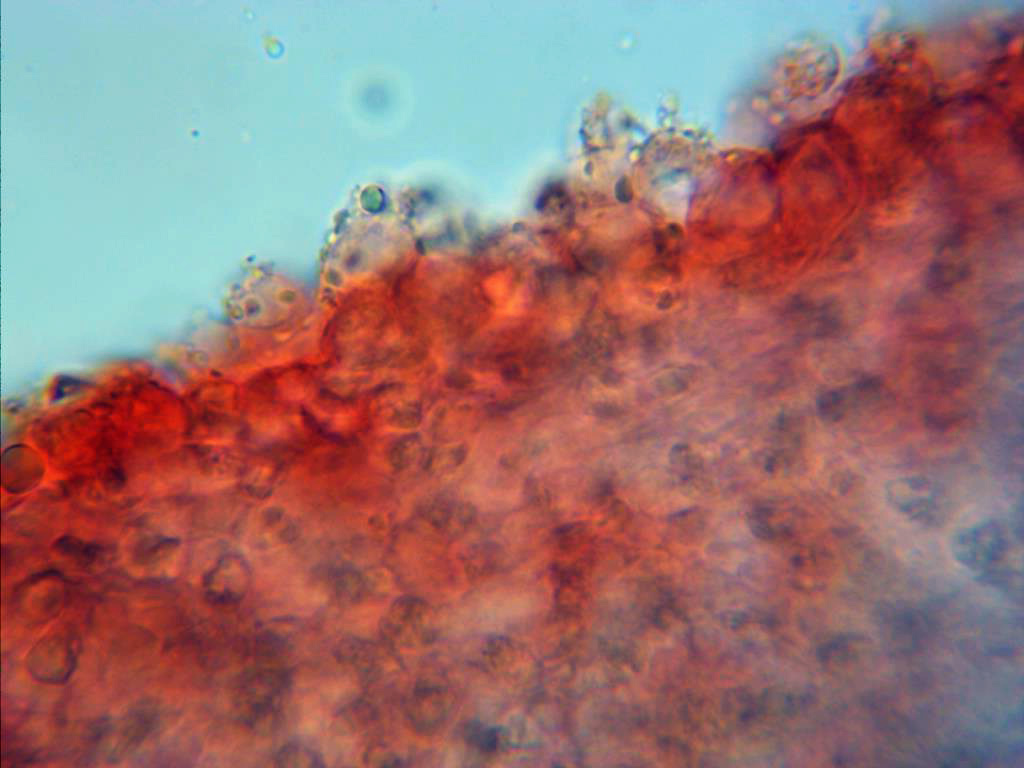 Sección de la pileipellis a 400 aumentos con una capa de hifas hialinas y bastante anchas en la superficie.