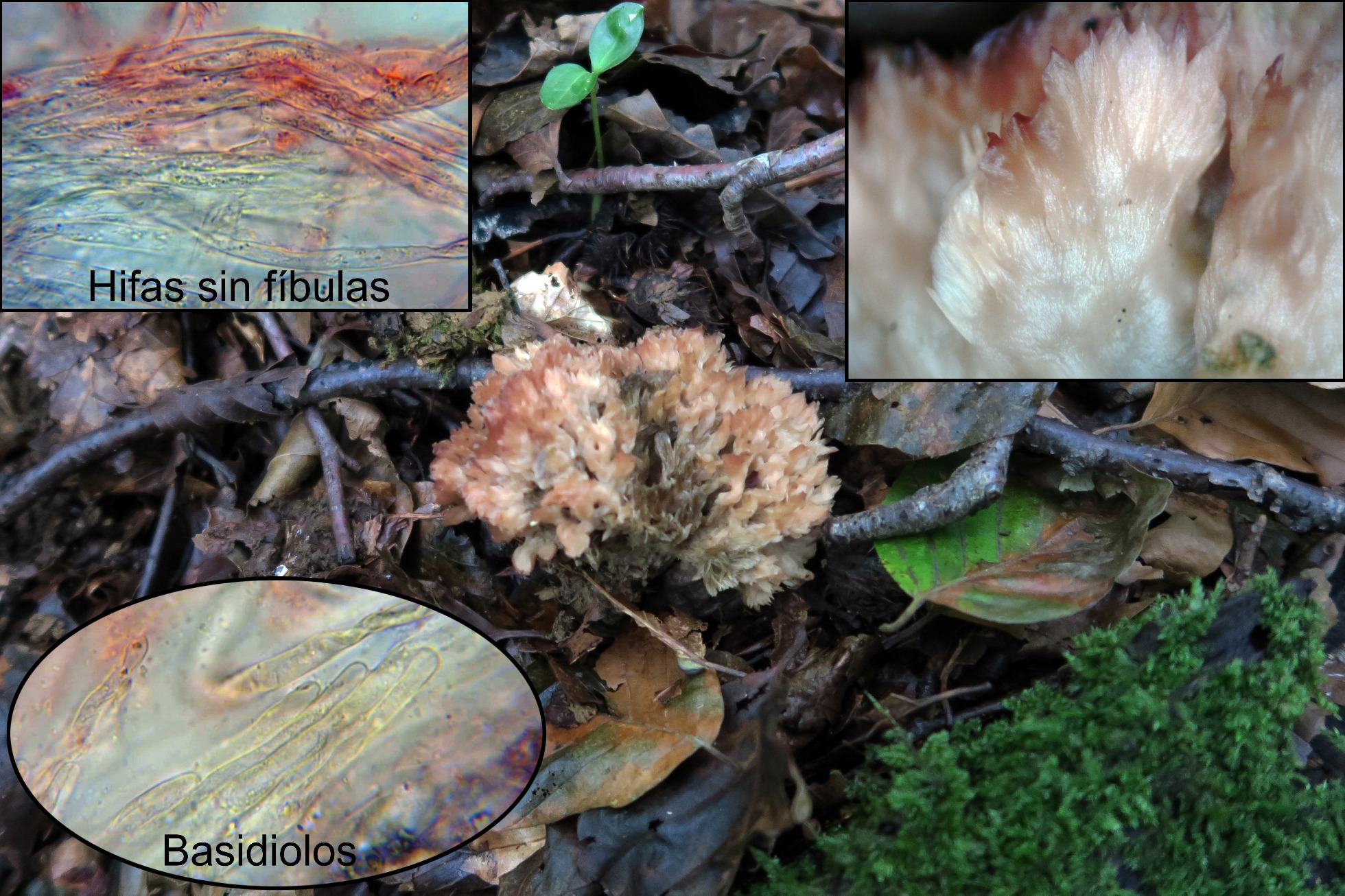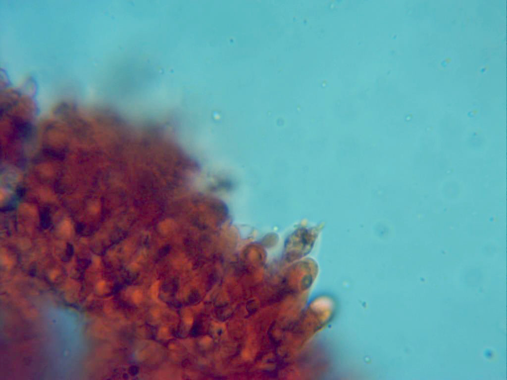 Esta última en el lugar consideramos una posible Telephora, a pesar de que no pude obtener ninguna imágen de sus esporas, por la ausencia de fíbulas y por la morfología de los basidiolos así como su aspecto macroscópico, debo suponer que se trata de Cotylidia pannosa, una especie bastante común en hayedos.