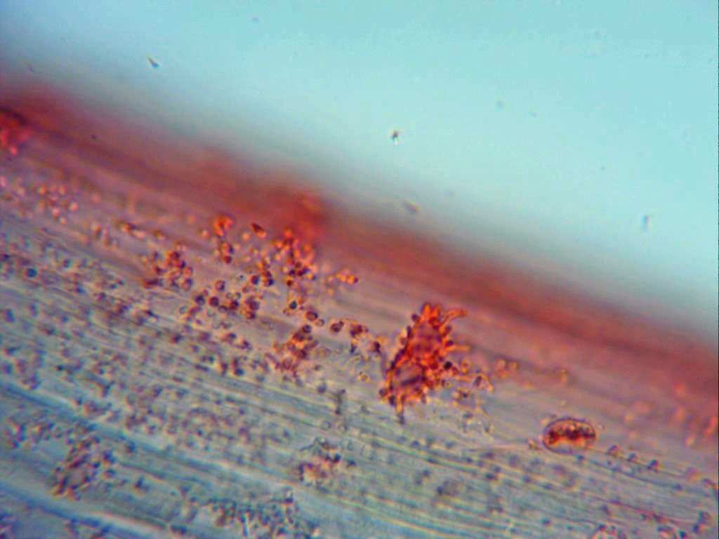 Un par de imágenes frontales de la capa superior de la pileipellis, a 1000 aumentos.
