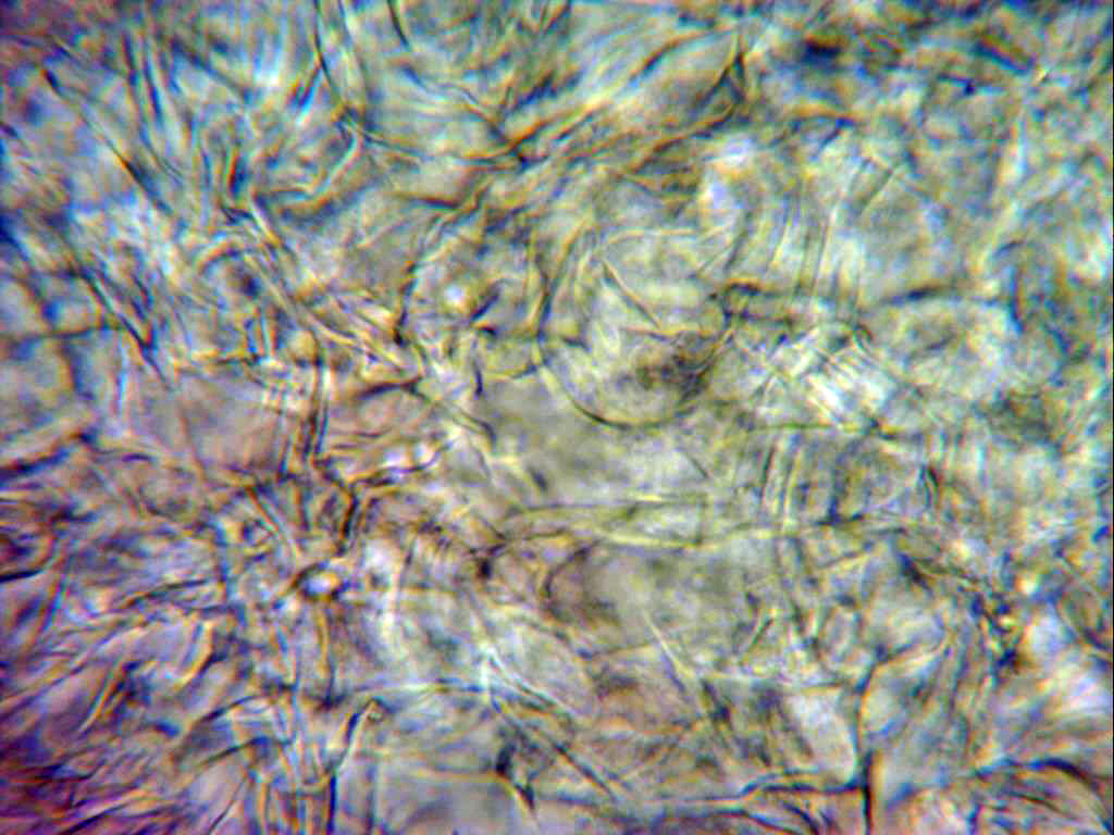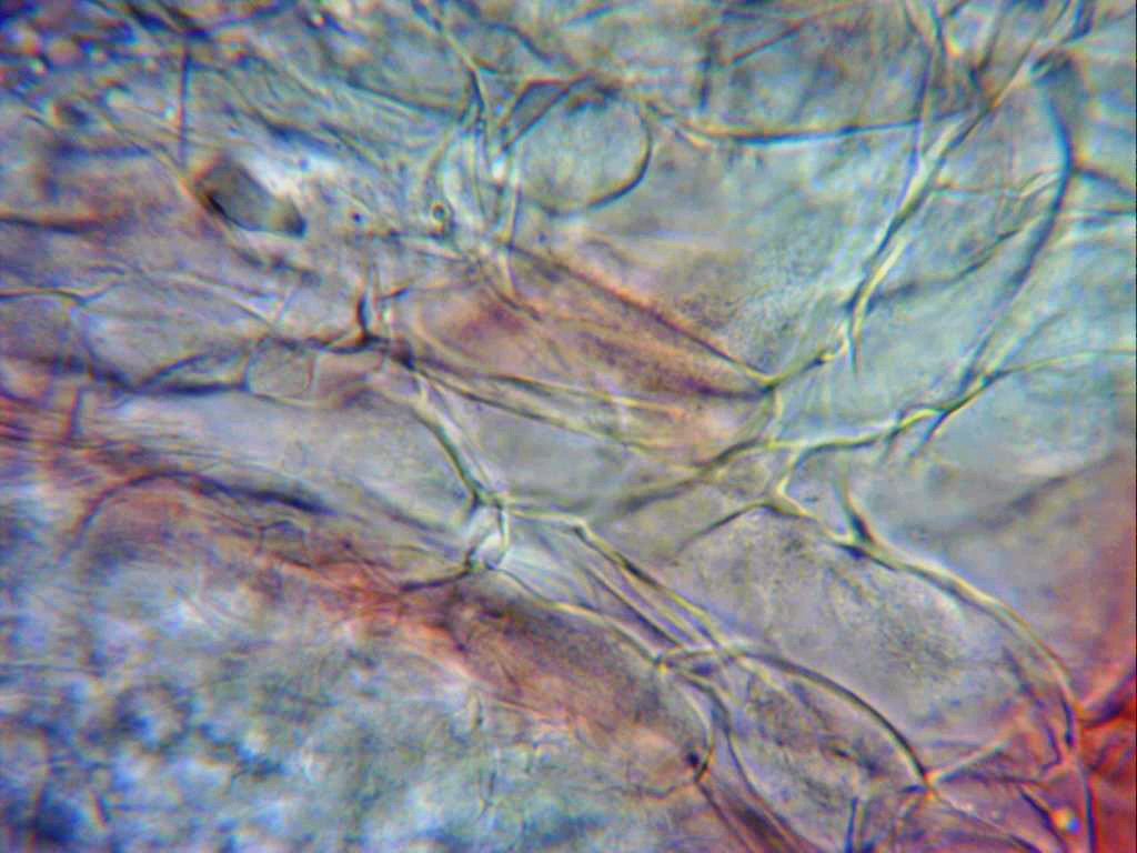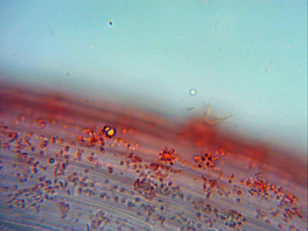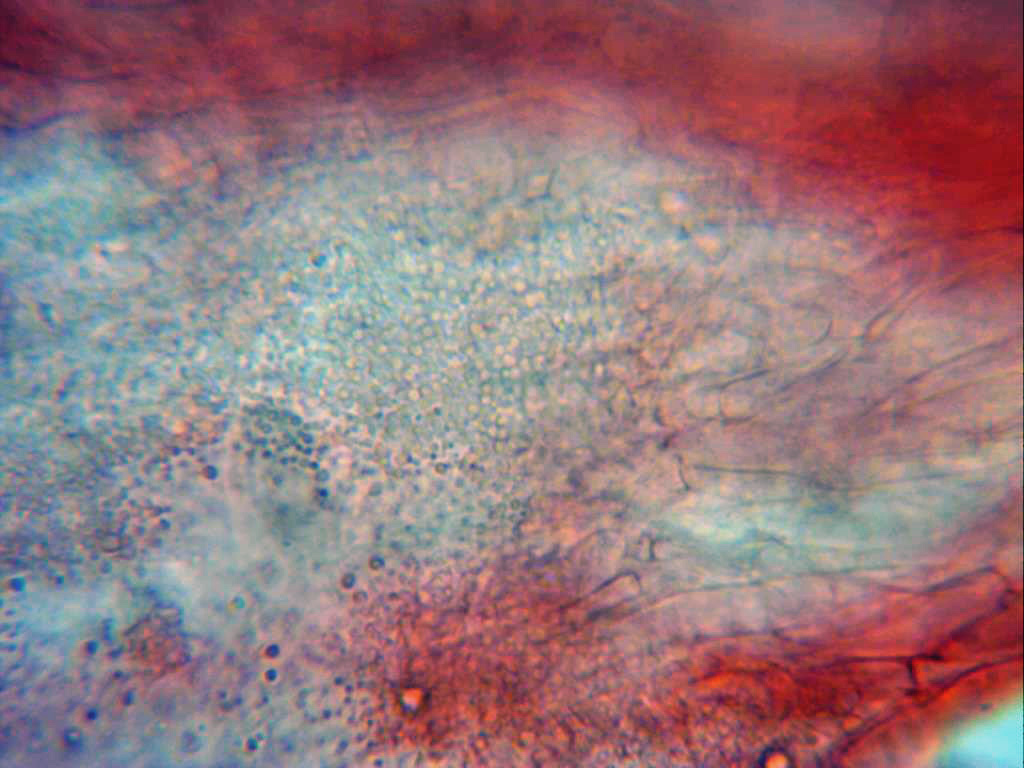 Pileipellis a 1000 aumentos, en este plano se pueden observar unas excrecencias a modo de granos en la parte exterior de las hifas.