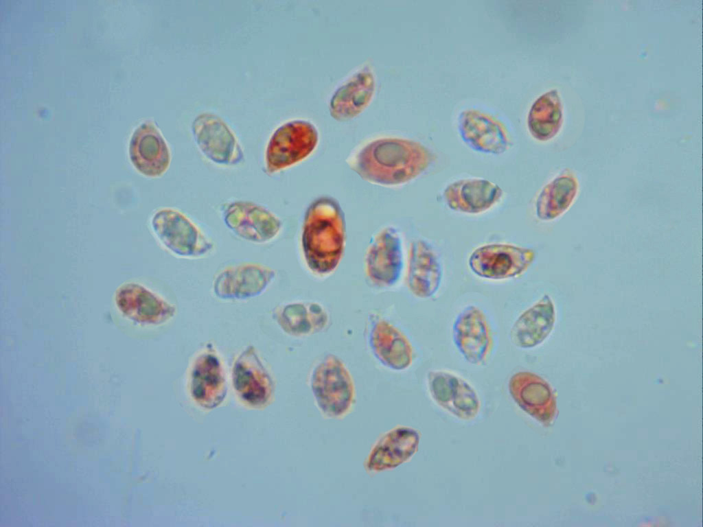 Esporas mayoritariamente elipsoidales, hialinas, con apícula, de pared fina y con un ligero contenido granuloso en su interior, con alguna de ellas que de medida se salía de madre. En mis mediciones de 8,2 (9,1;10,1) 12,5 X 4,8 (5,1;6,3) 7,8 µm.