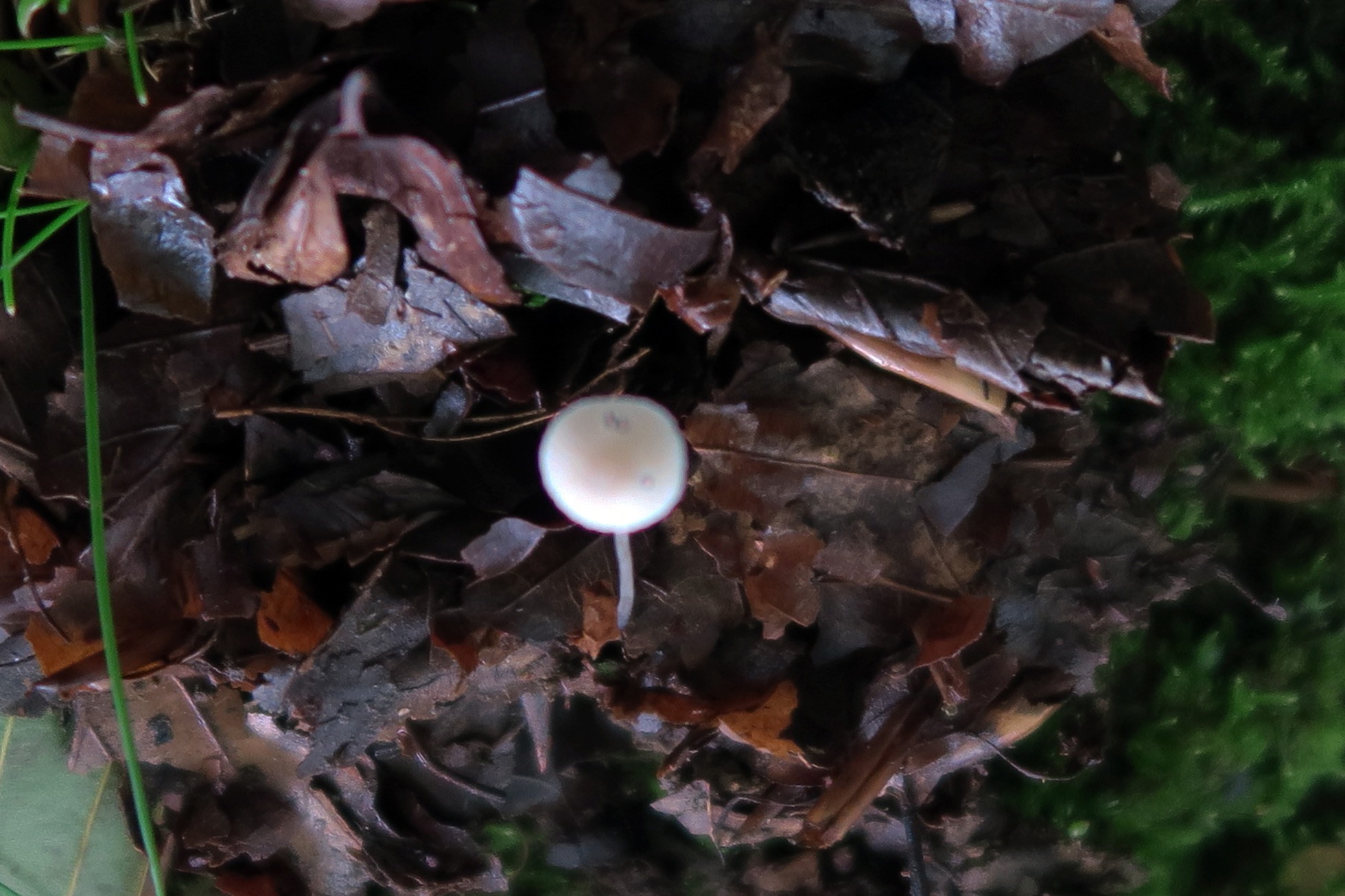 Una Mycena de pequeño tamaño brotando entre la hojarasca del hayedo, en el momento de la recogida de muestras consideramos que probablemente se trataba de Mycena vitilis.