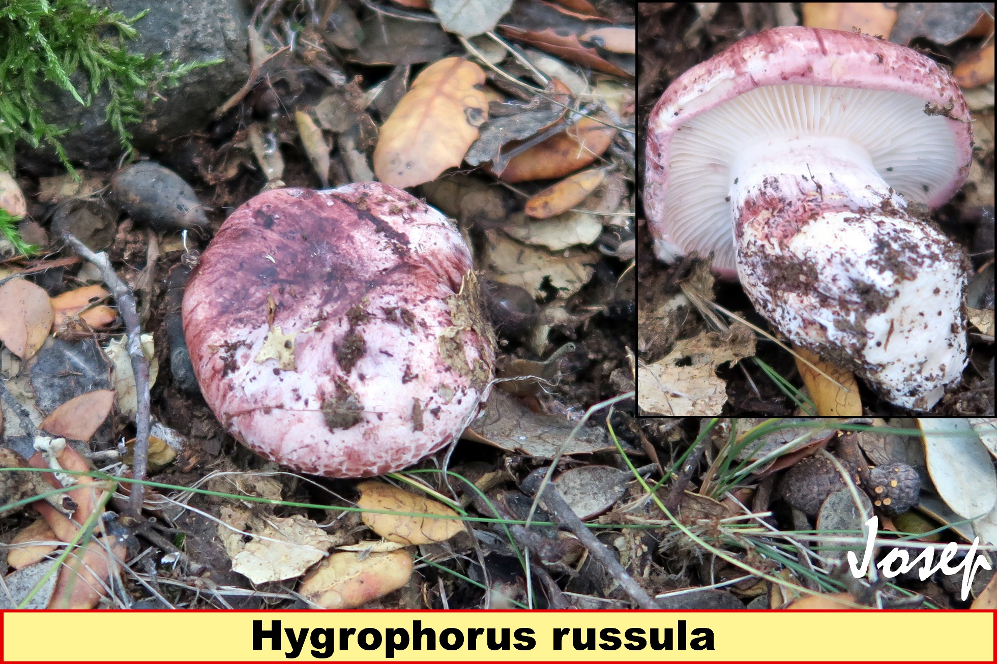 Hola Antonio, de acuerdo con Joseba y contigo con Hygrophorus russula, es una especie que no admite muchas confusiones, y bastante habitual bajo encinas, el pié del Hygrophorus russula no parte como tiza ya que no presenta esferocistos, si se llama así es solo por el parecido macroscópico con el género Russula, pero no porque comparta las características del mismo, es tal y como su nombre indica un Hygrophorus. Esta especie años atrás había llegado a consumirla, y por mi zona se sigue vendiendo en los mercados, aunque para disimular su sabor amargo hay que sacarles la cutícula, hervirlas y mucho trabajo para muy poca recompensa, ya hace muchos años que no la recojo, en el monte están bien