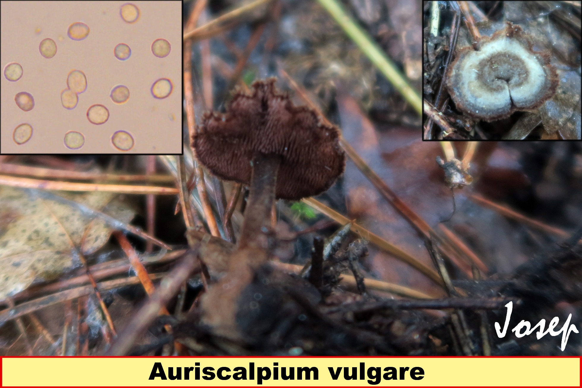 Aupa Juan Antonio, desde luego Auriscalpium vulgare, además la has pillado en estado joven, te dejo una imágen mía de la especie con el himenio ya más pardo negruzco, así como la excelente ficha de la especie de aquí en nuestra casa.