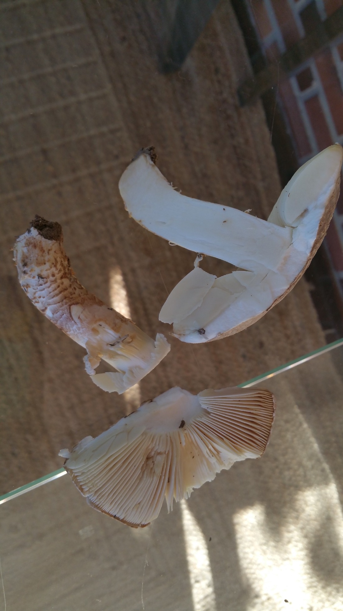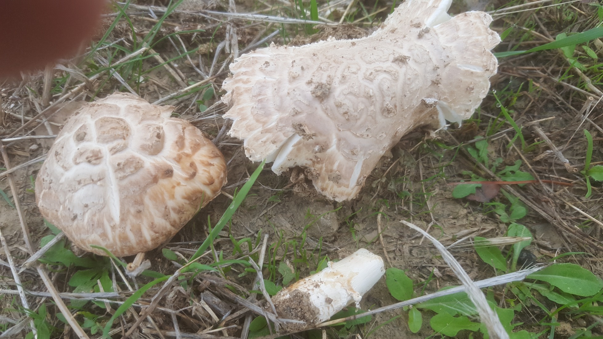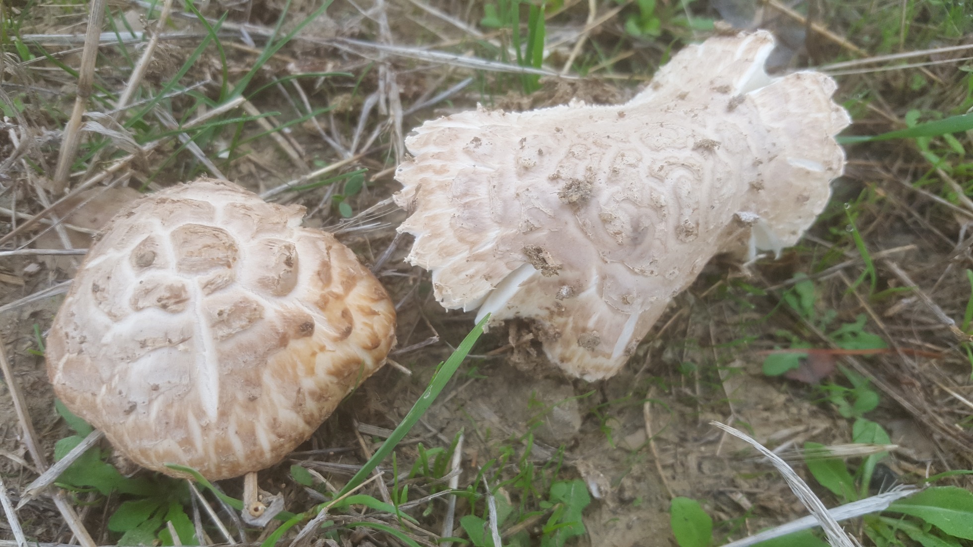 Hola Alfonso. Posiblemente la amanita vittadinii o la que propone Javier. Habría que ver el pie y anillo. La Codinae tiene más tonos marrones y el anillo oscuro. La vittadinii es más común y de color más blanco de jovén, pero por falta de humedad o de adultos pueden coger las escamas tonos más oscuros. En el sur aparece casi en todos los prados junto con agaricus.