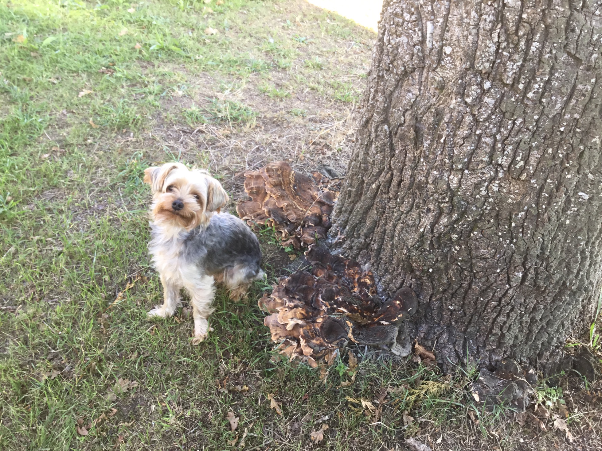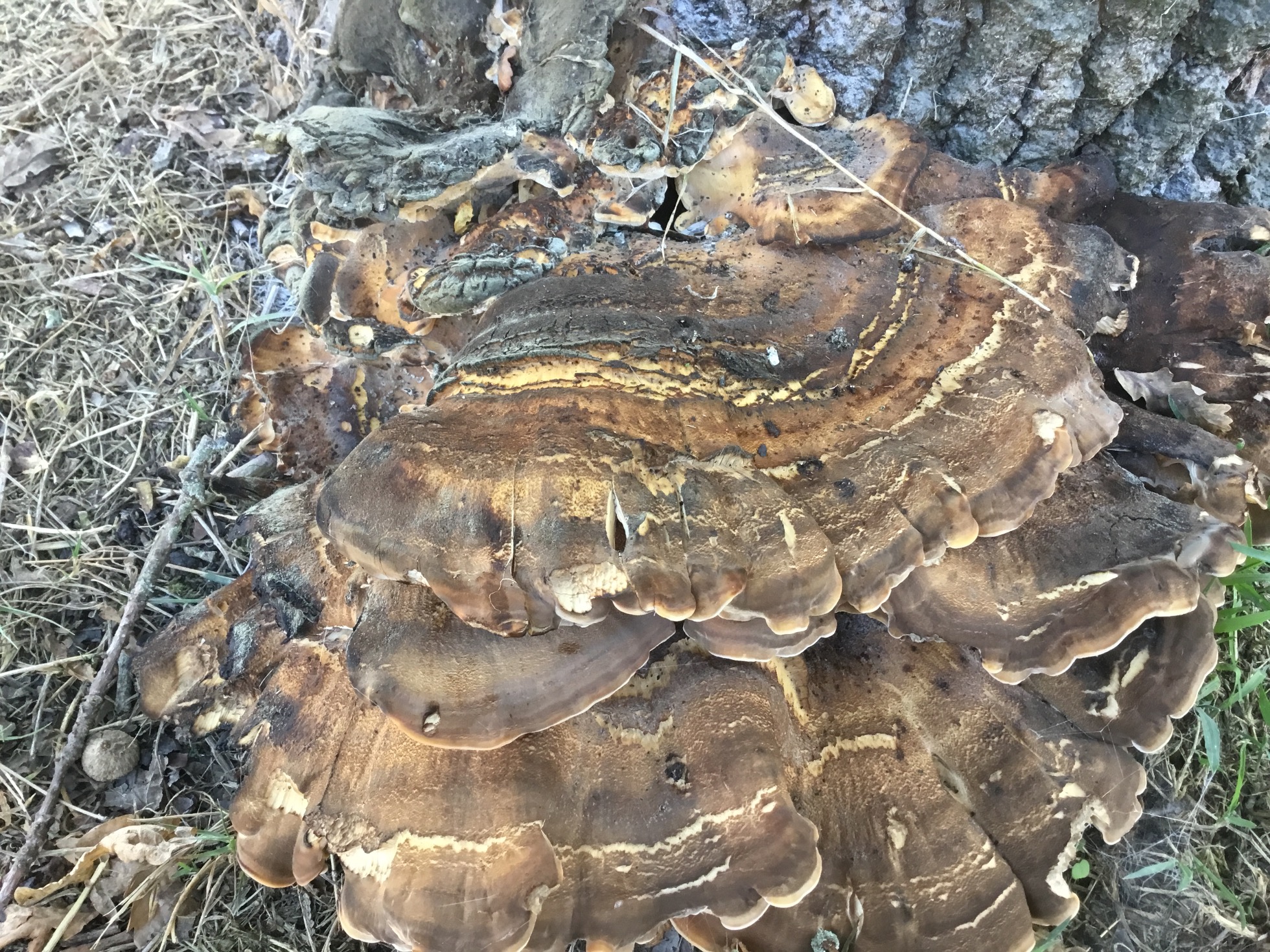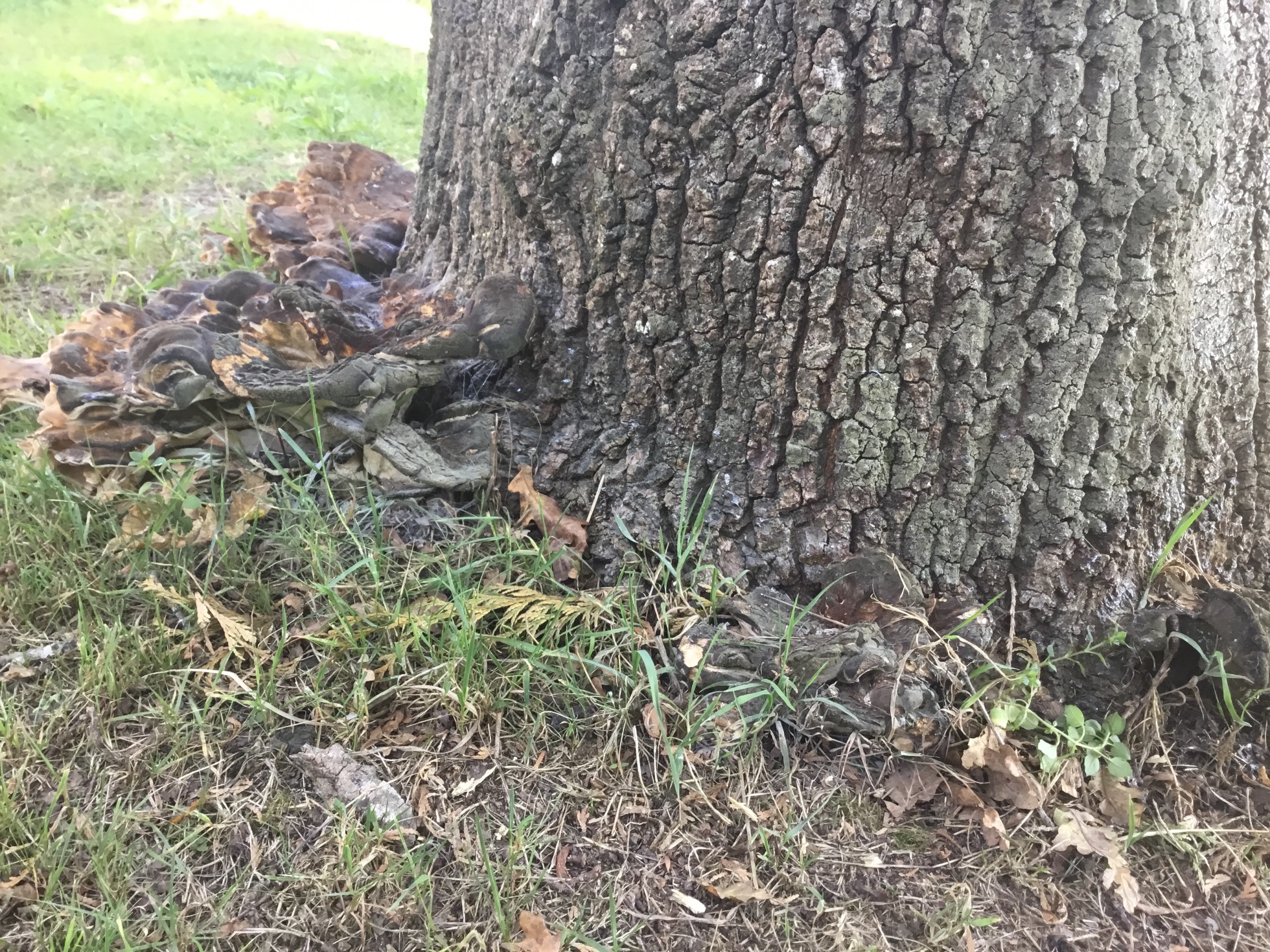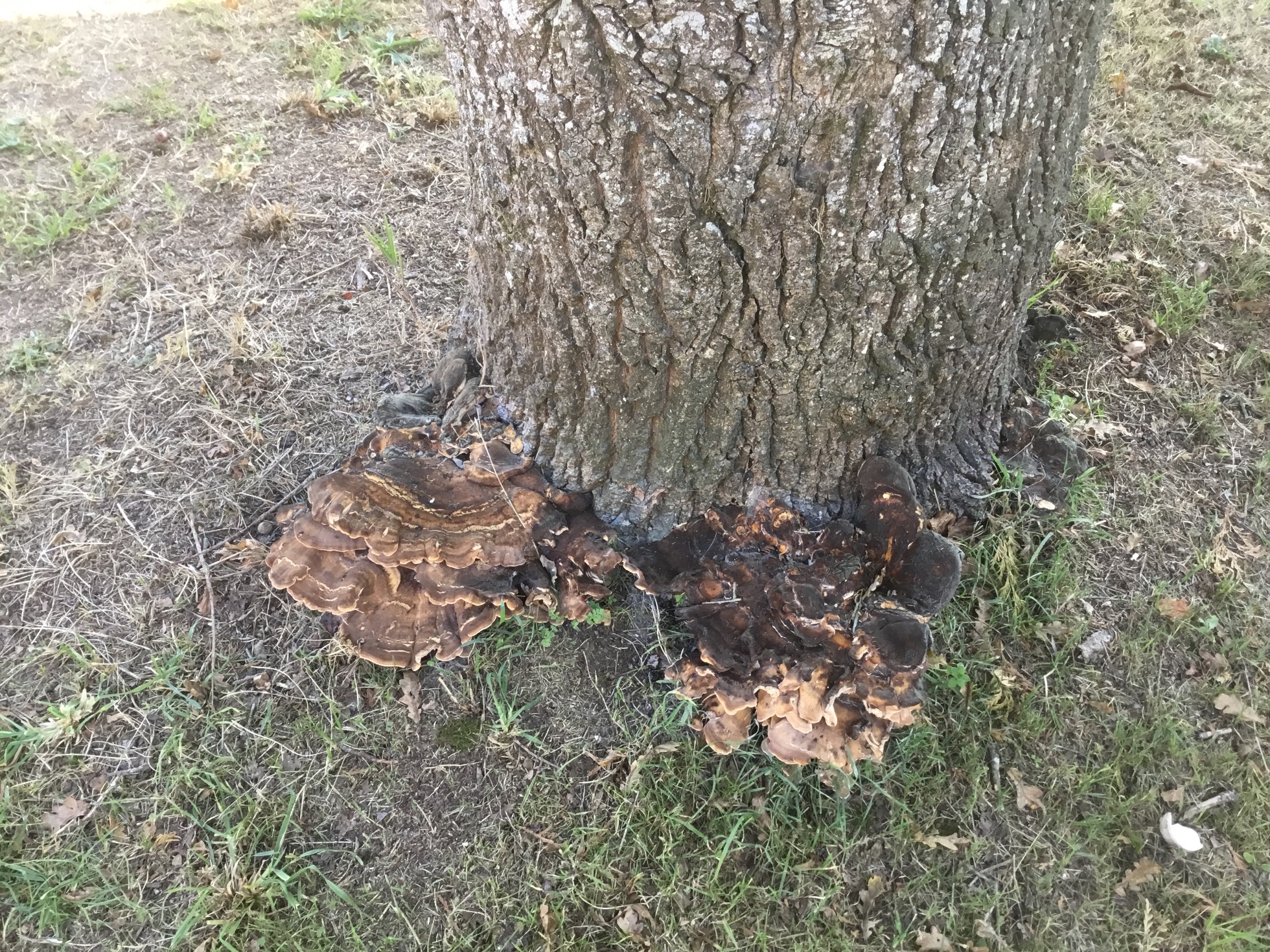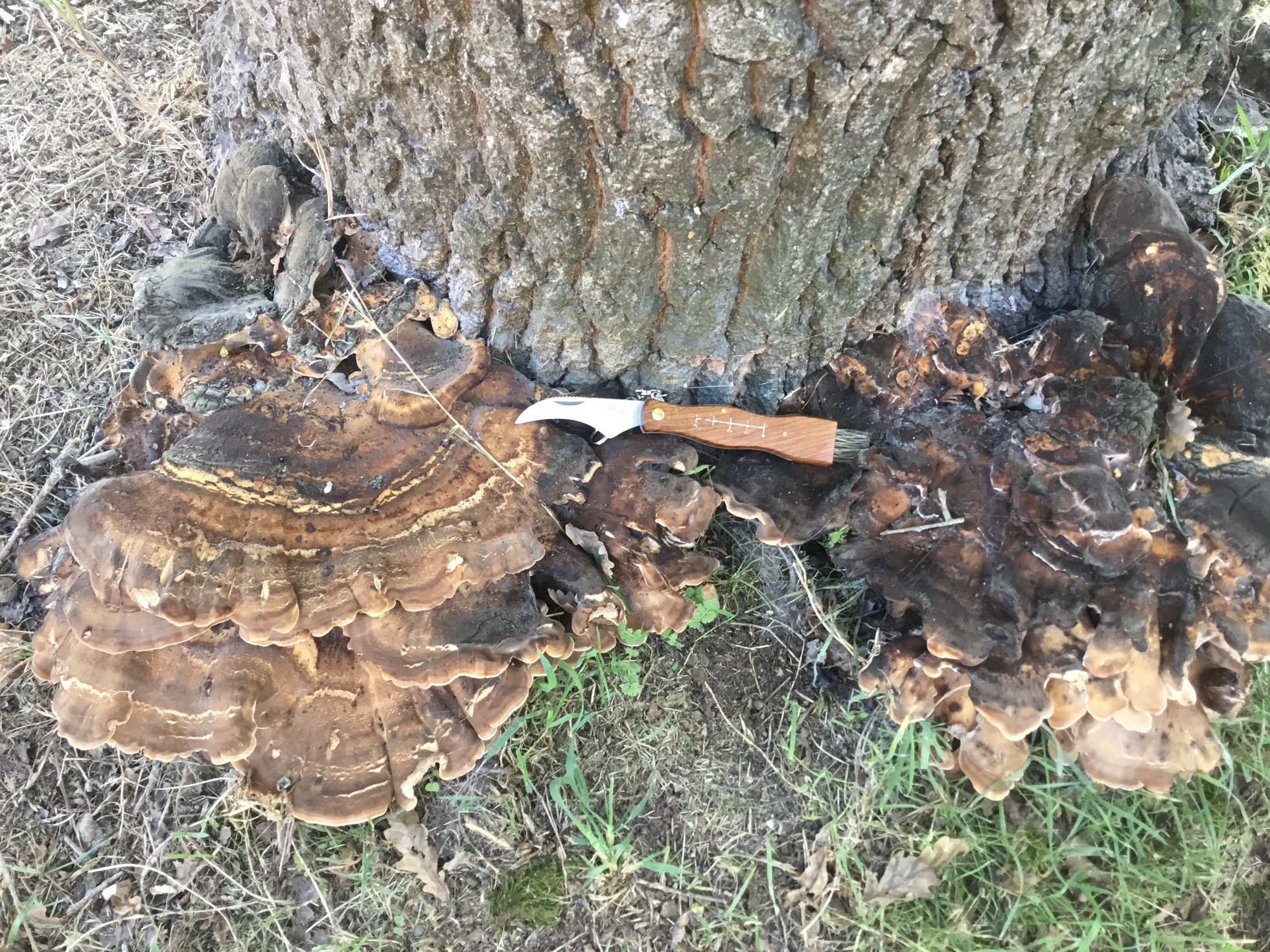Sí que coincide que nazcan sobre quercus, pero he leído que casi siempre sobre troncos muertos o árboles moribundos, y estas setas nacen de la base de un roble vivo y saludable, y las tengo visto otros años.