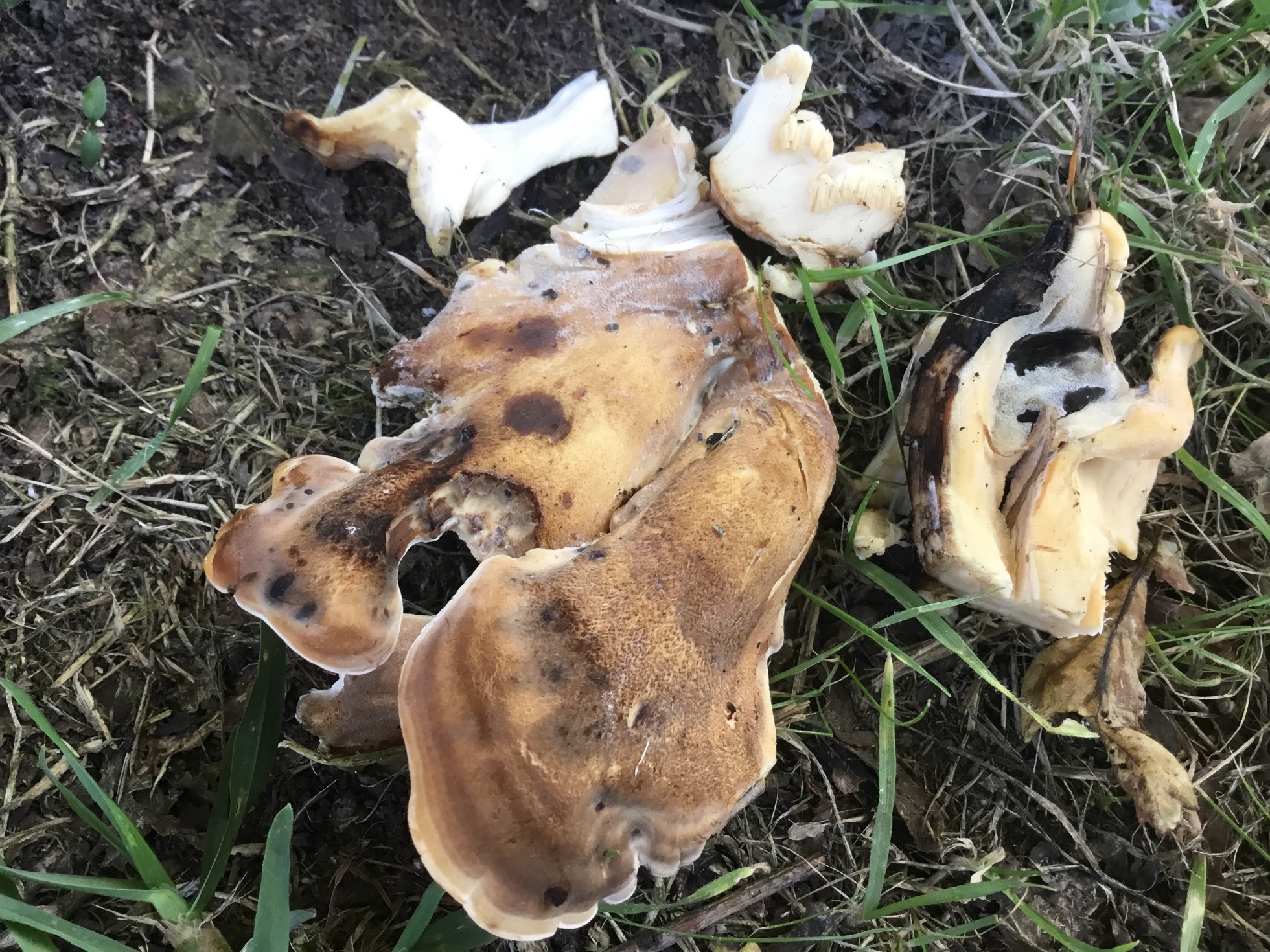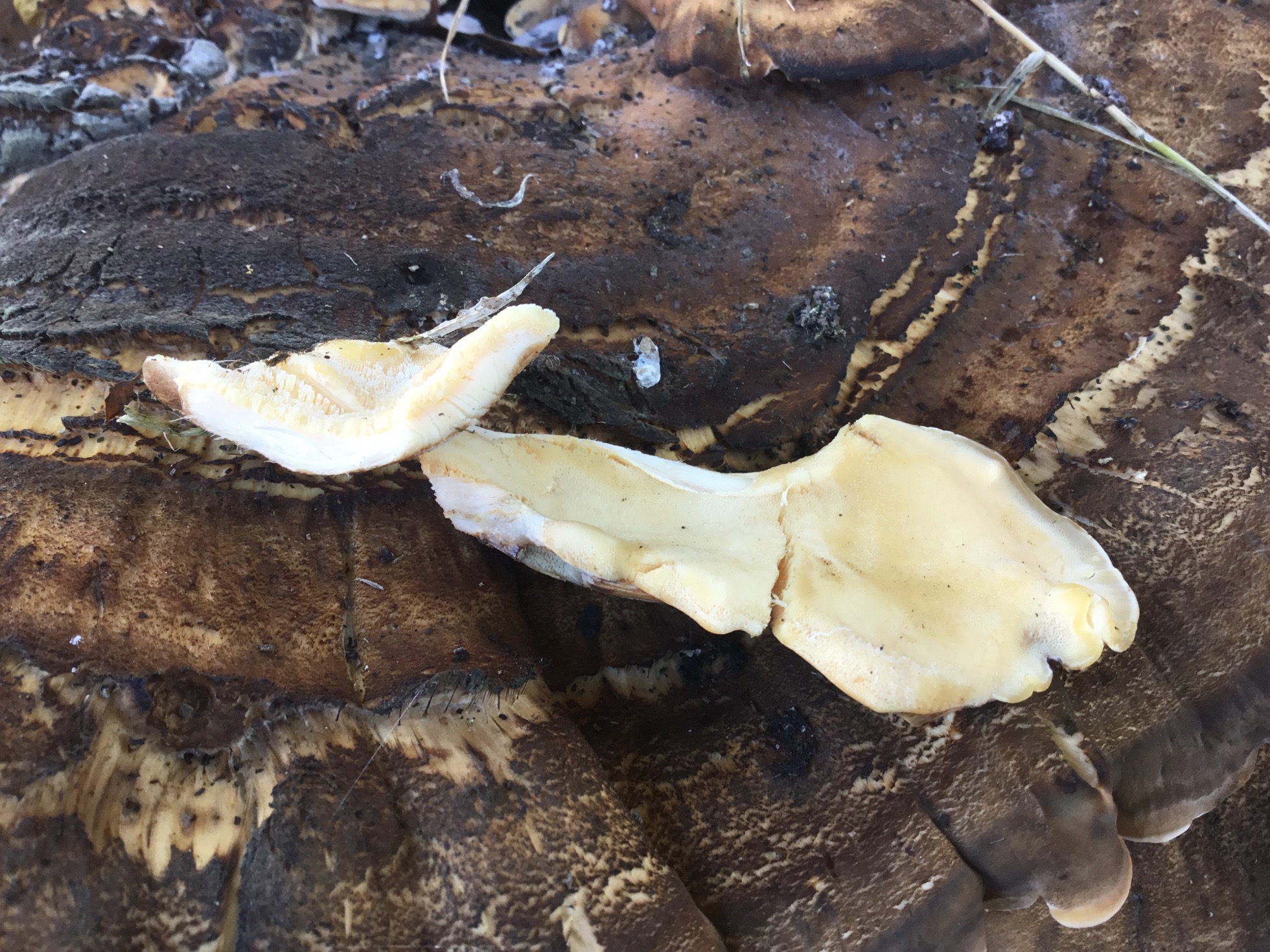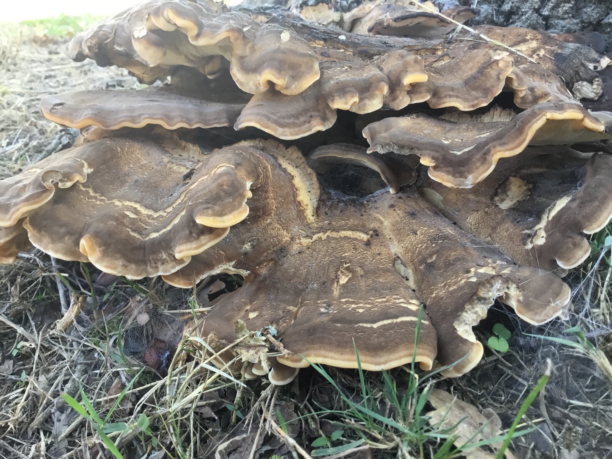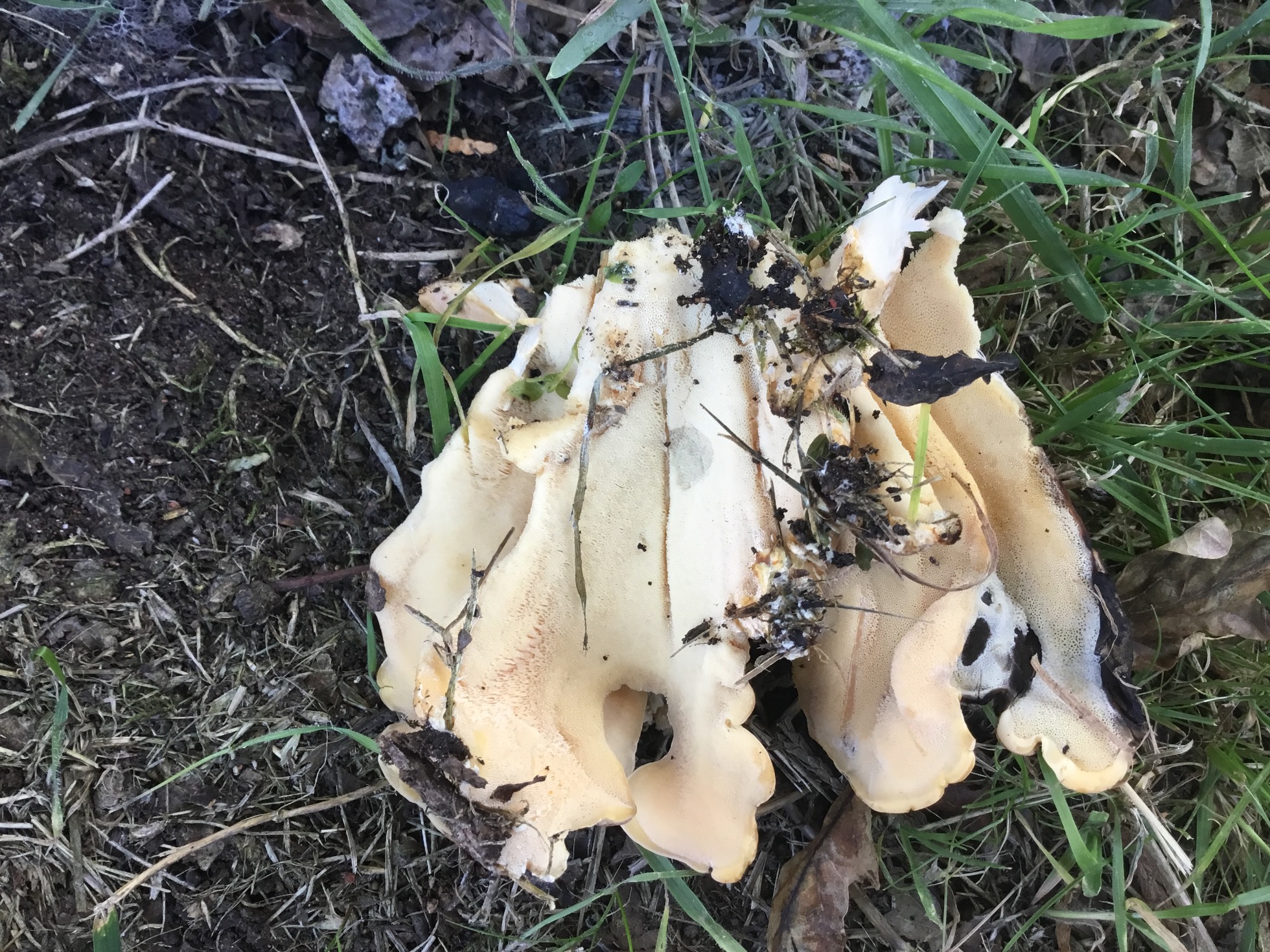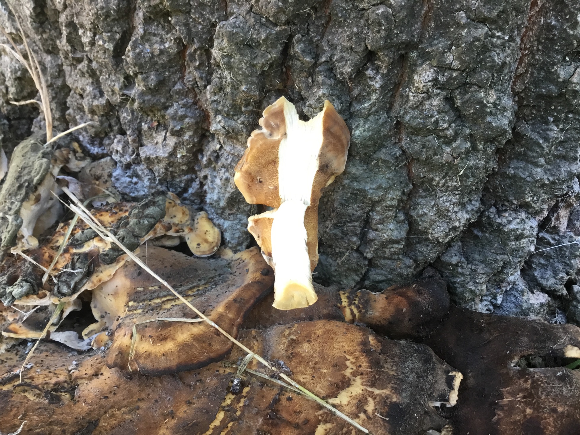 Hola, al lado de casa hay un roble Carballo solitario de unos 90 años, hace dos semanas aprecie que en la base del tronco nacían un grupo de setas, que ceñían una corona alrededor de aproximadamente dos tercios del perimetro del árbol. Hoy aún están allí, parece que tuvieran varios pies, 4 o 5, algunos están ya muy maduros, pero otros aún conservan una textura húmeda, a pesar de la sequía en Galicia, con la carne consistente, flexible y fibrosa. Tiene tubos. El tamaño es bastante grande como pareciereis en las fotos.