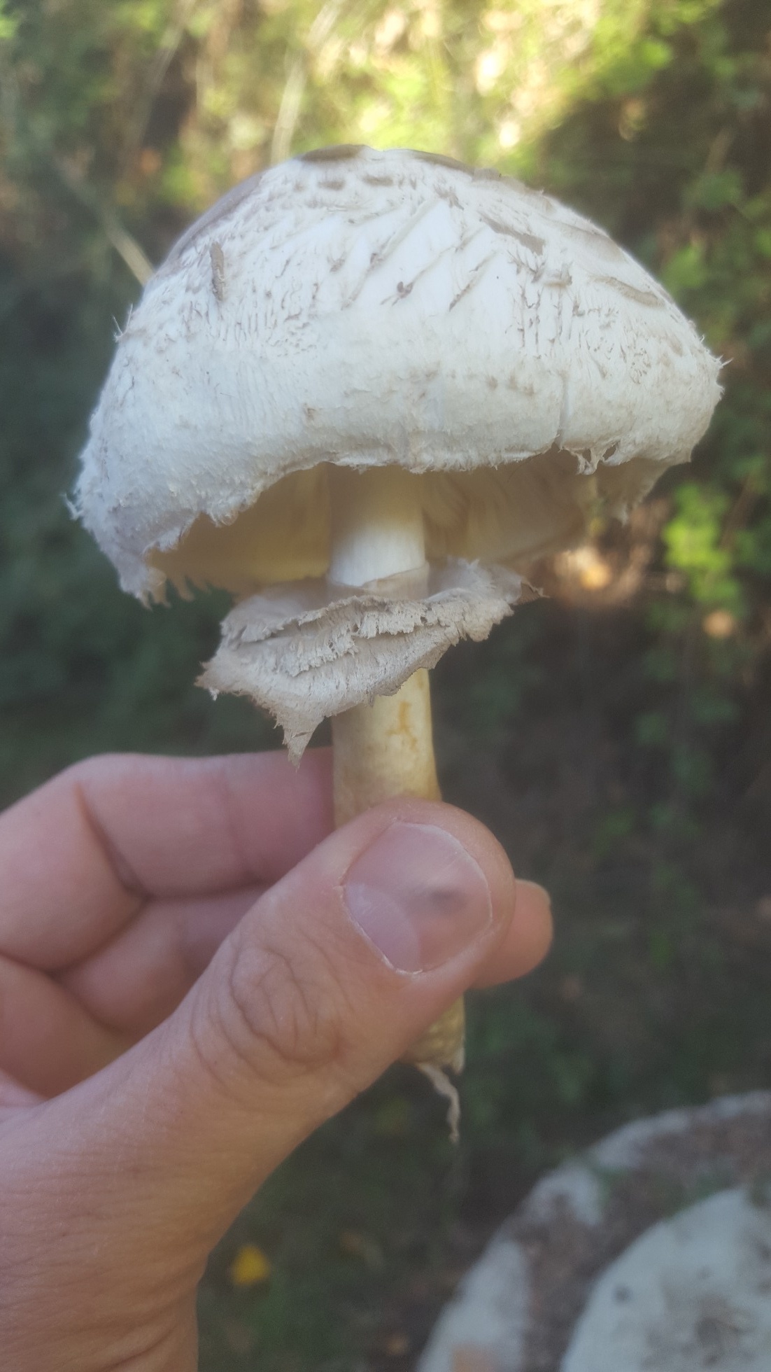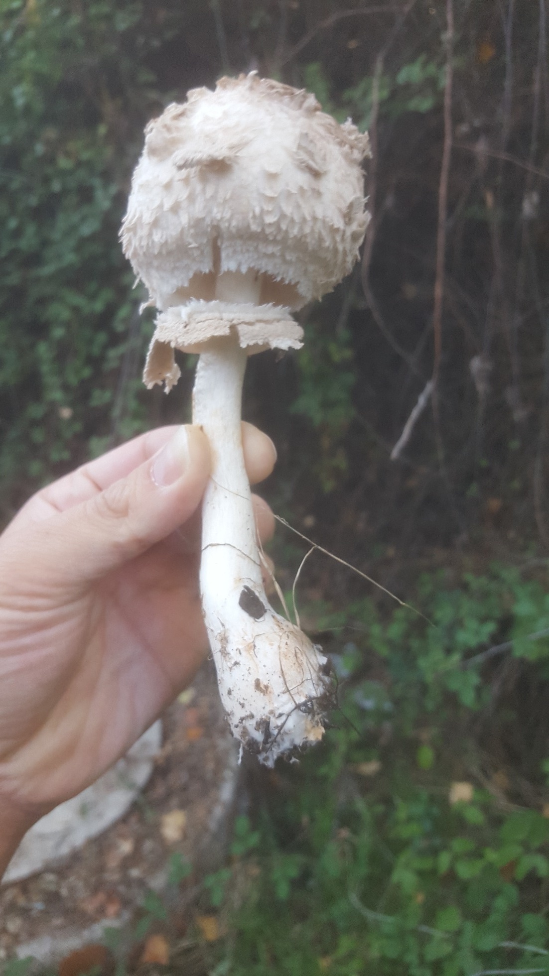 Hola amigos . Esta setita que me he encontrado en una zona muy humeda parece una Chlorophyllum rachodes verdad? . Tiene anillo movil doble, Pie que engrosa progresivamente, enrojece al roce y corte, pie no atigrado. Lo que me ha llamado la atencion es qie el pie es un poco hueco. He leido que a algunas personas les es indigesto. Teneis constancia de esto?