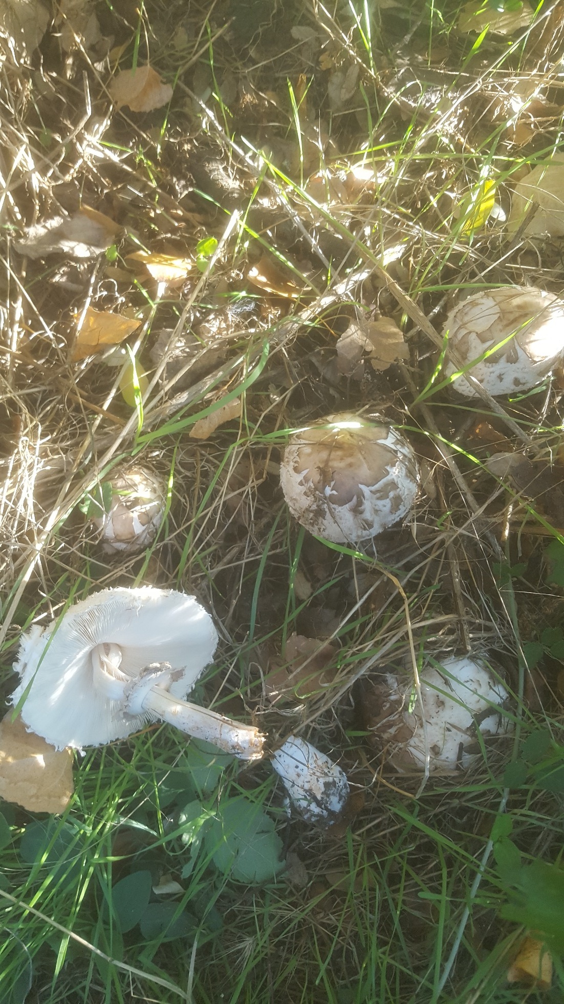 La Macrolepiota venenata proviene de la Macrolepiota rhacodes var. venenata, según Index Fungorum actualmente deberíamos denominarla Chlorophyllum venenatum, y según Mycobank, simplemente Macrolepiota venenata. Además según Index Fungorum se llama Chlorophyllum rachodes, a esta denominación actualmente según Mycobank se le debe denominar Chlorophyllum rhacodes, quedando la denominación de C. rachodes en deshuso. A mi modo de ver la Macrolepiota venenata se diferencía del Chlorophyllum rhacodes por las escamas en forma de aspa bien visibles en tu imágen (sobre todo la del ejemplar de la izquierda) y la base del pié bulbosa, lo que no me encaja es el anillo doble que en el caso de la Macrolepiota venenata debería ser simple.