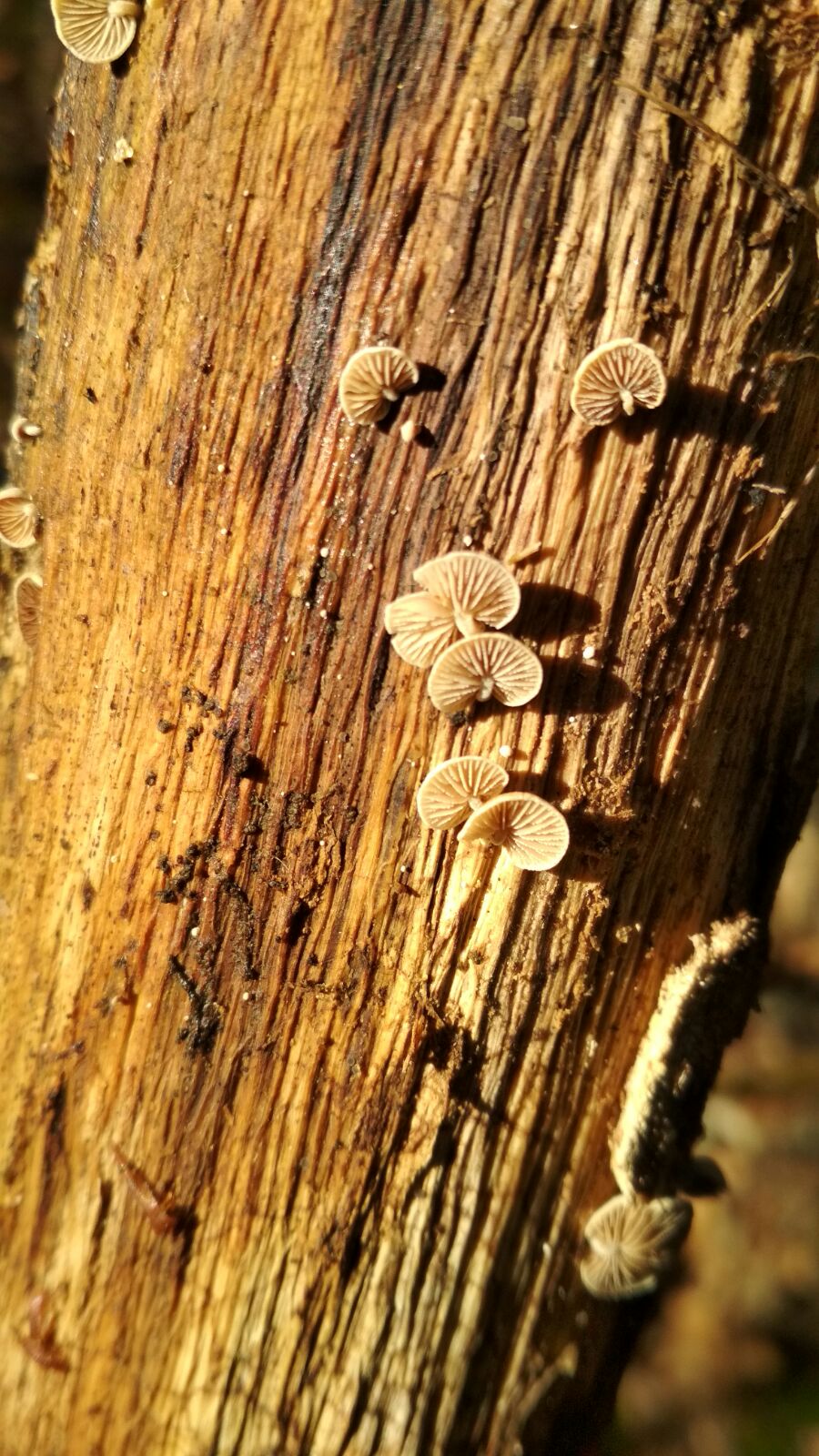el primero no consigo identificar la especie, supongo que un Crepidotus o un Resupinatus, pero el pequeño pie que es bien visible me despista.