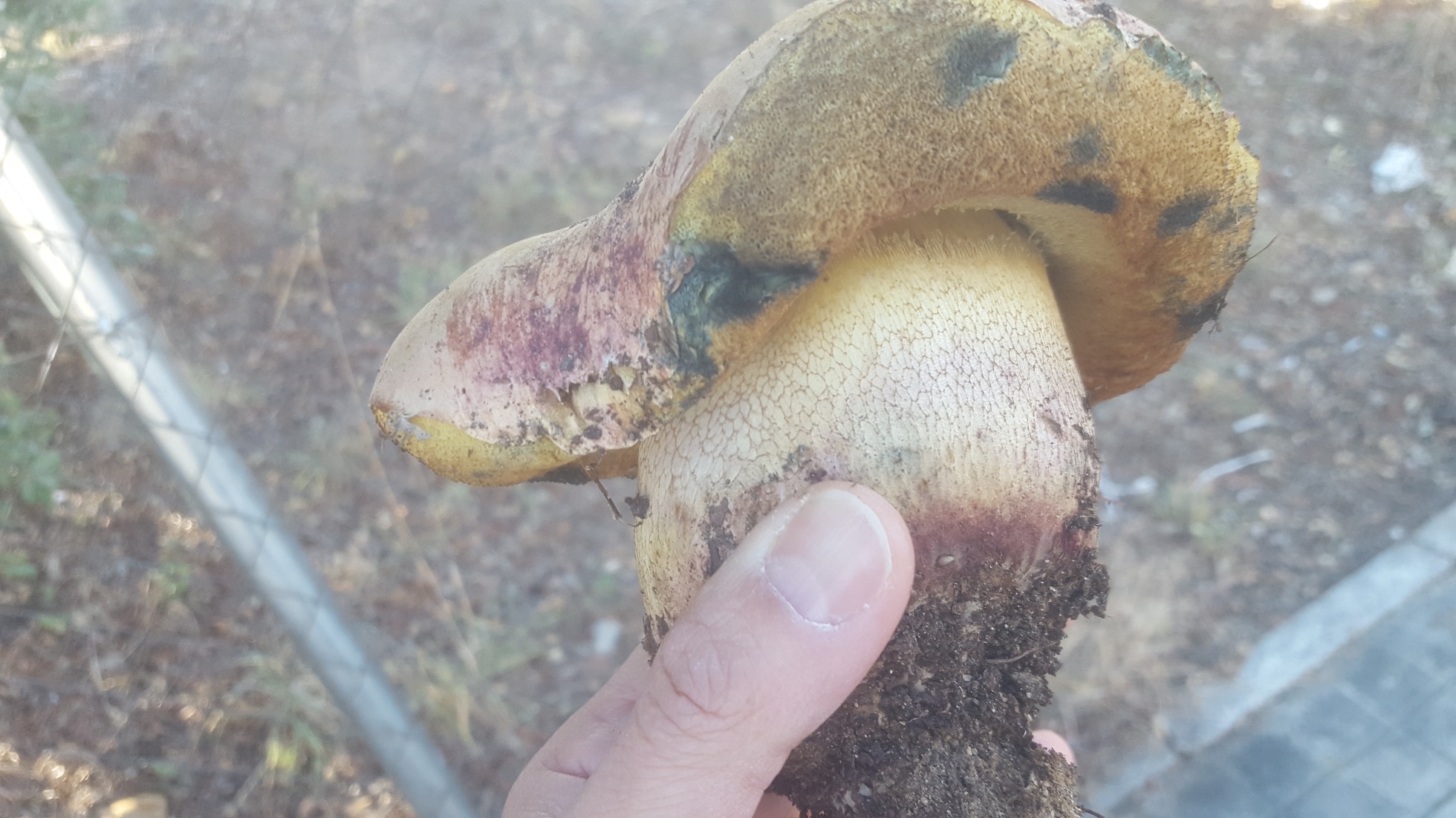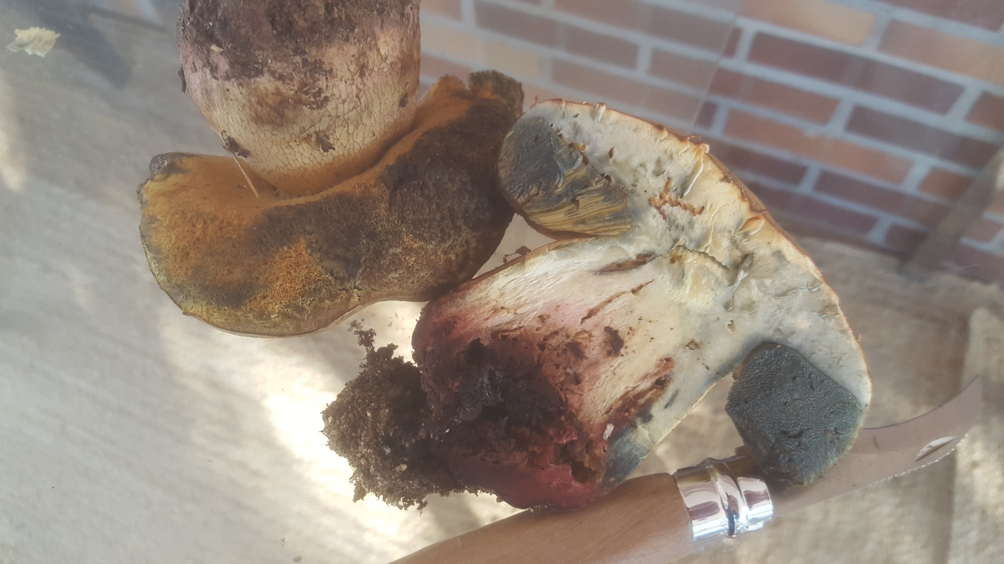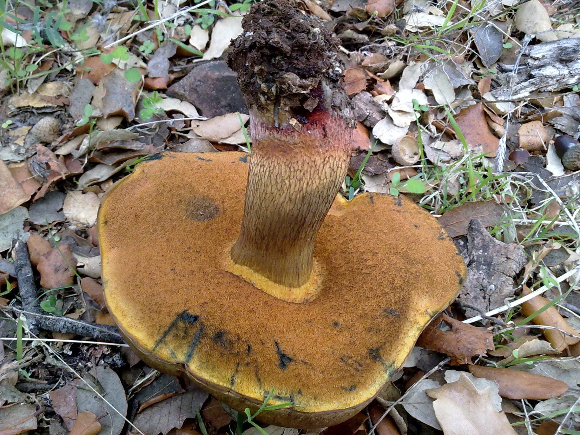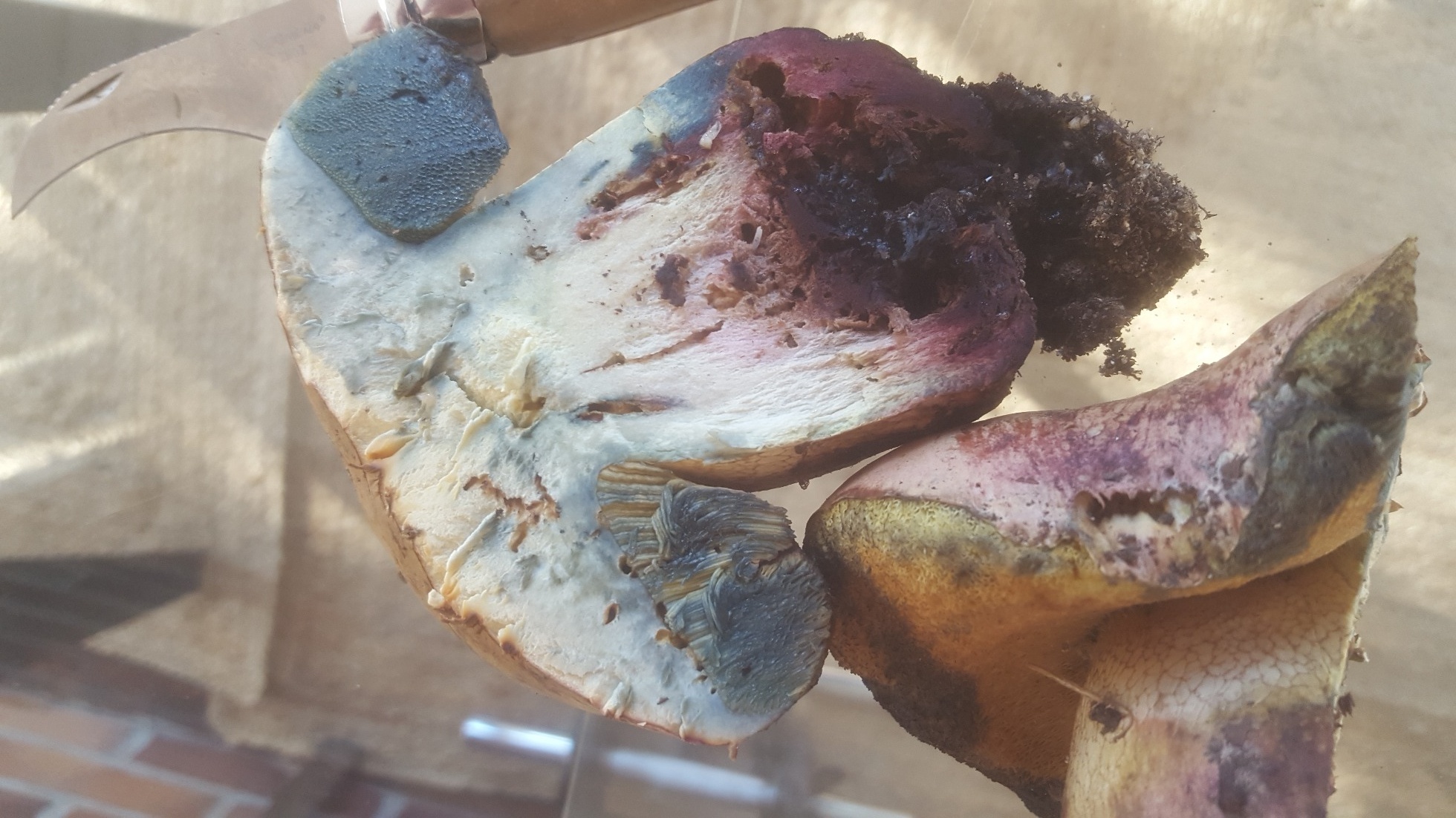 Hola amiguetes hoy me he encontrado un par de preciosos suillellus bajo una gran encina. He cazado uno y le he hecho el tercer grado. Huele bien. Carne amarilla que azulea un poco al corte. Pie entero reticulado. Pense que era el luridus pero al ver que la superficie subhimenial era amarilla y no rojiza-anaranjado pienso que podria ser suillelus caucasicus...