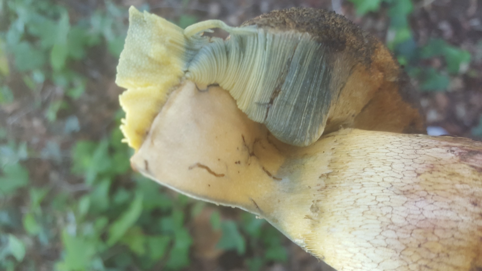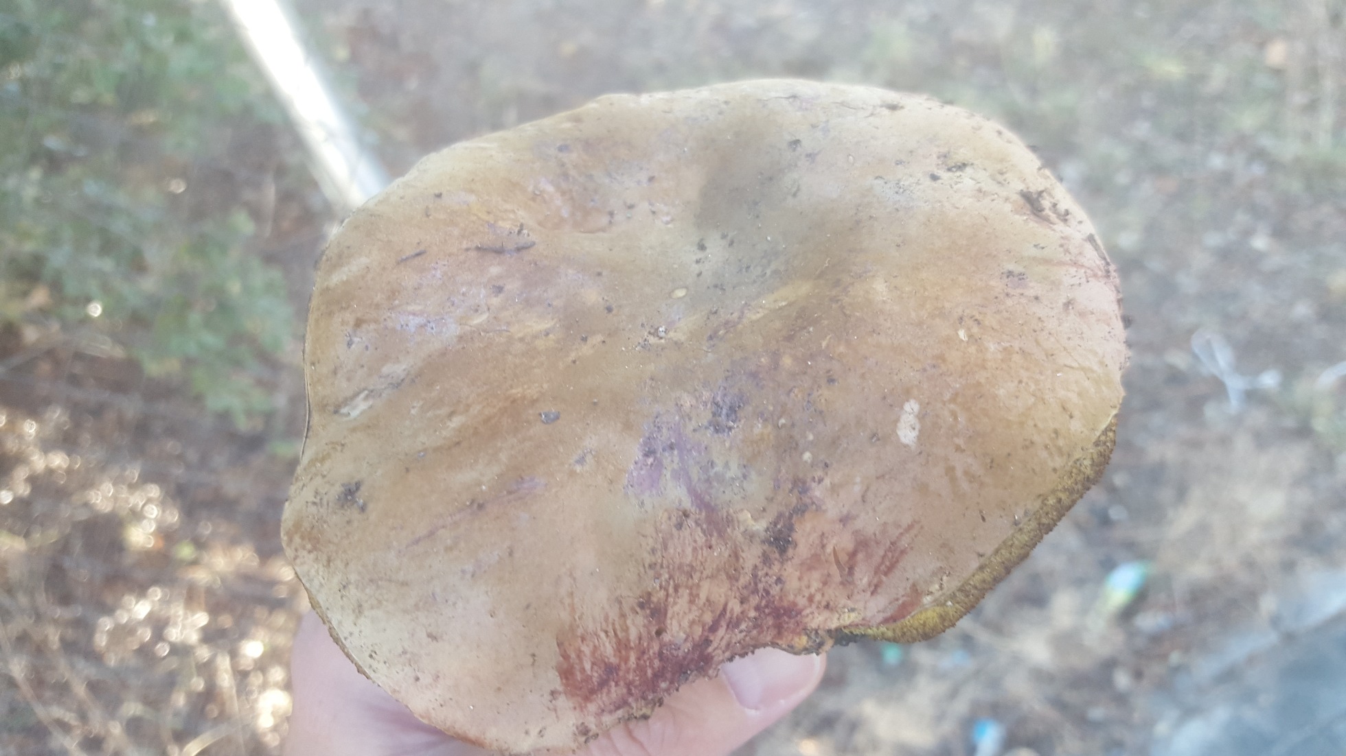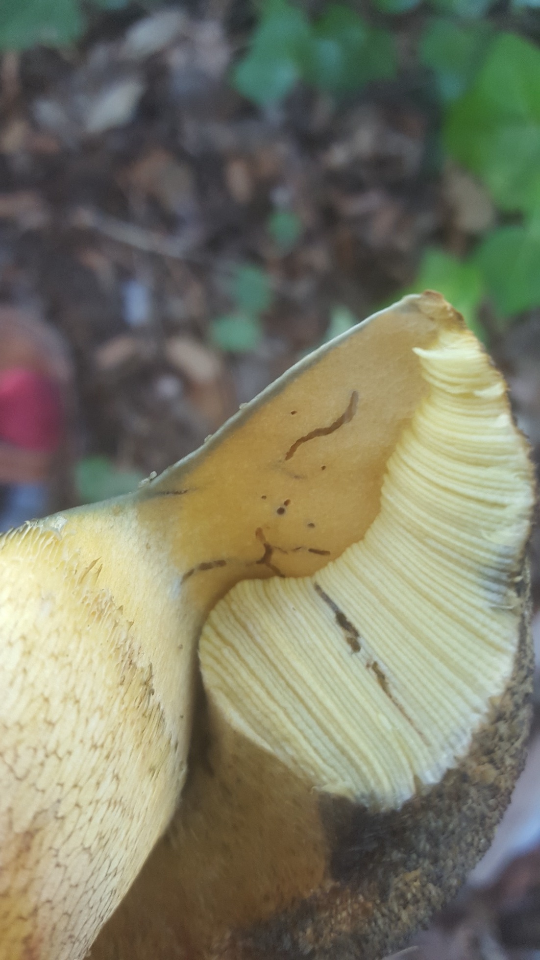 Que curioso Javier, y tiene el Himenio bastante anaranjado. No me había fijado que en una foto de Alfonso también se ve la carne amarillenta bajo el himenio. Aunque hay otras variedades de Luridus con la carne bajo el himenio amarillenta todos tienen diferentes coloraciones de sombrero. Pues como señalaba Josep todo parece apuntar hacia el Caucasicus.