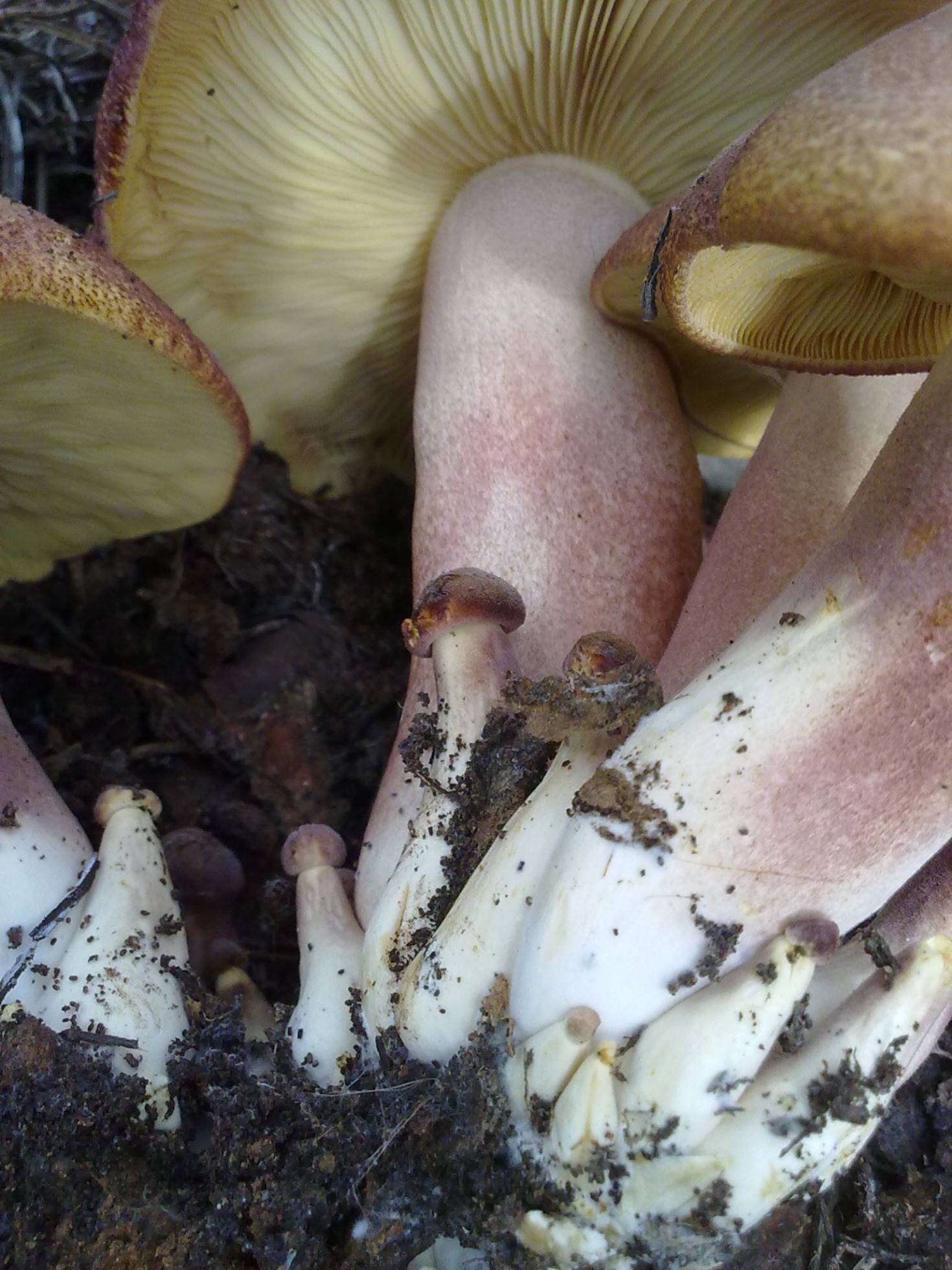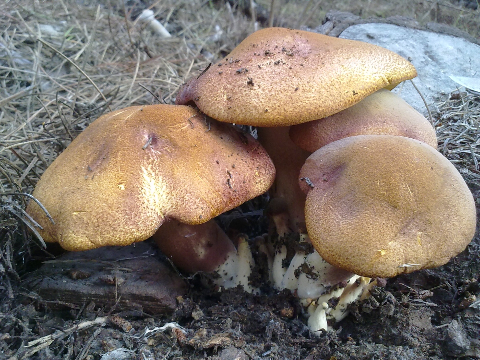Yo lo mas parecido que tengo son estas fotos de Tricholomopsis rutilans se encontraban en bosque de pinos y partían del suelo y que debían haber raíces muertas de los mismos.