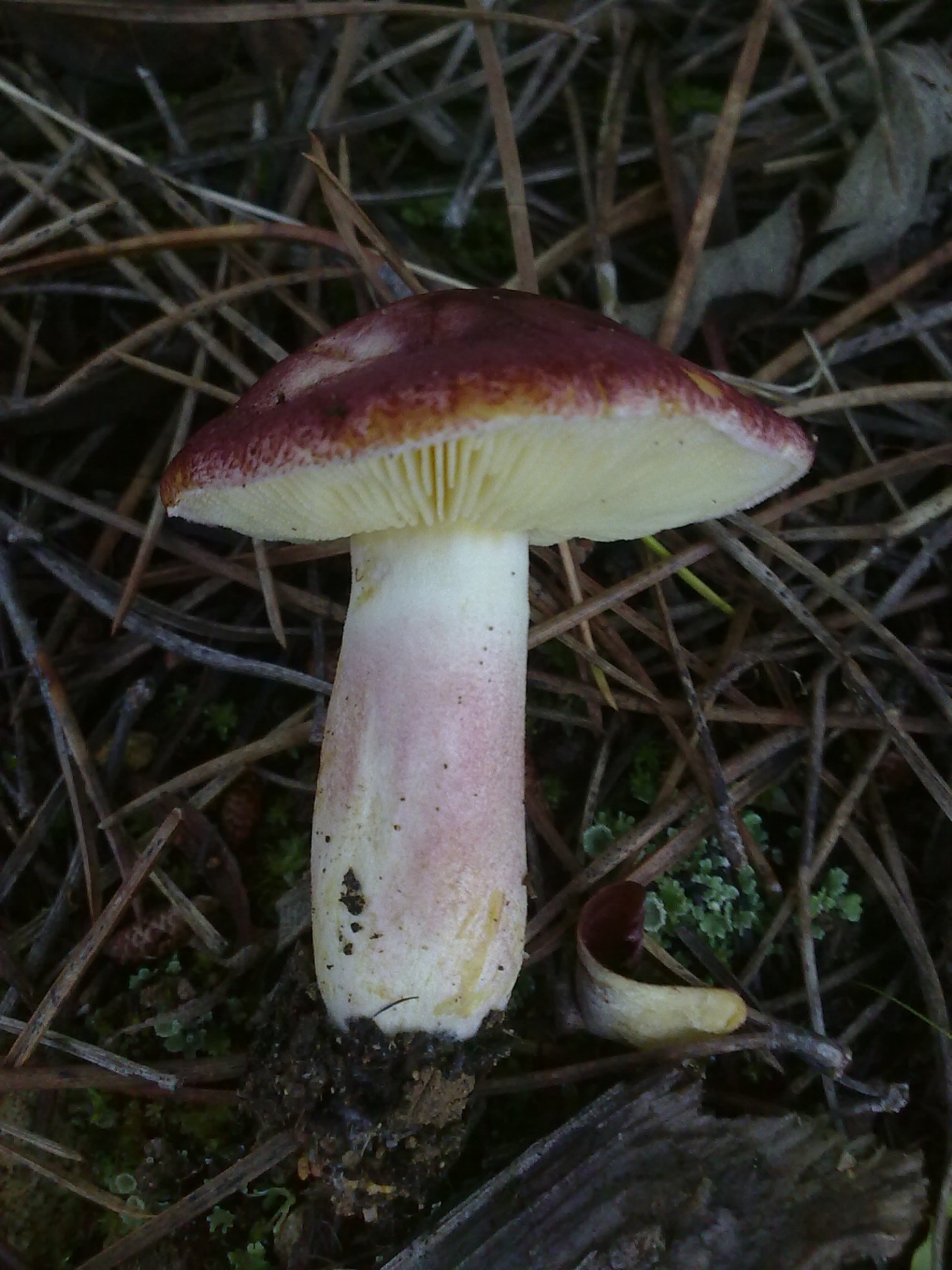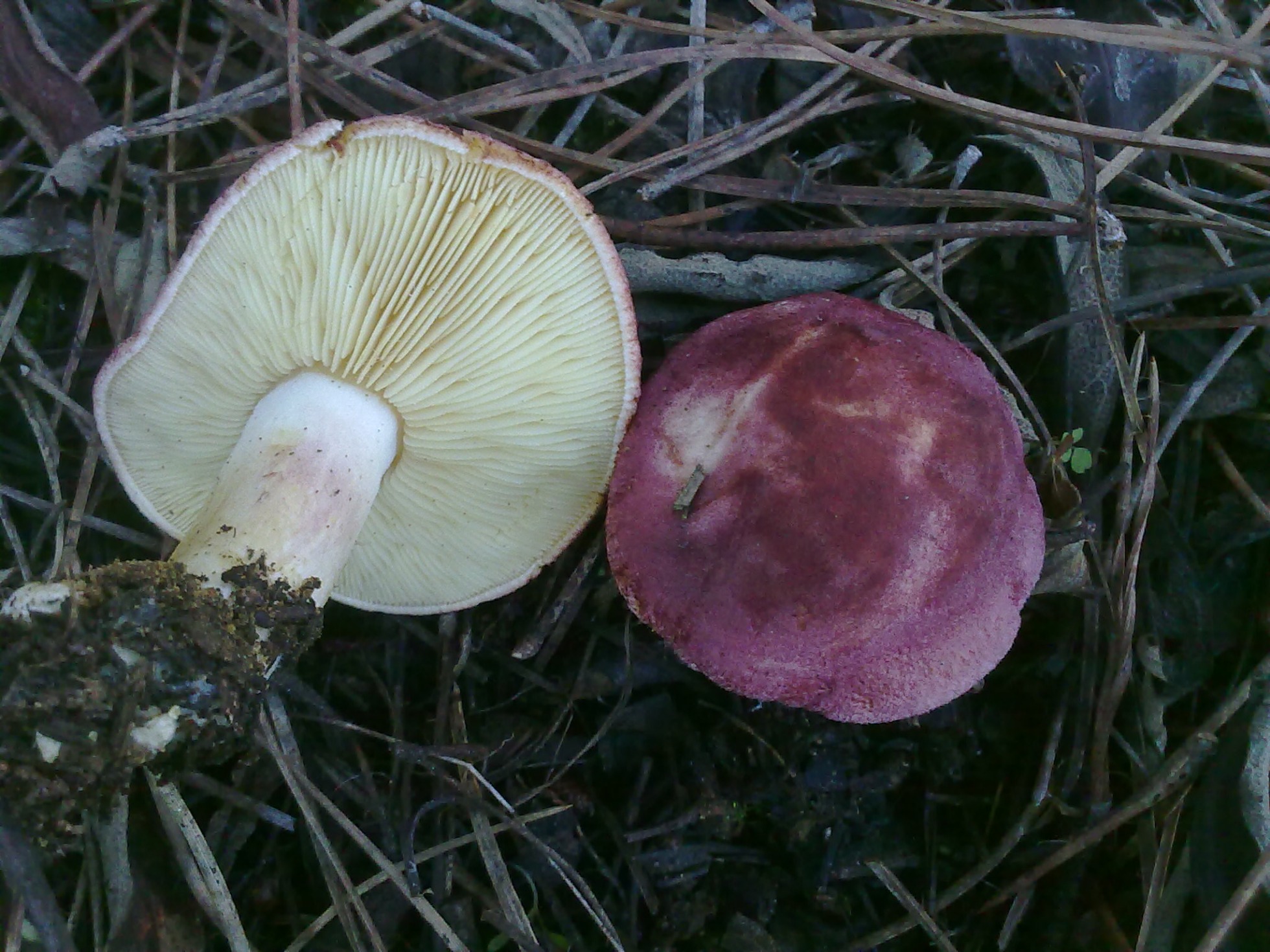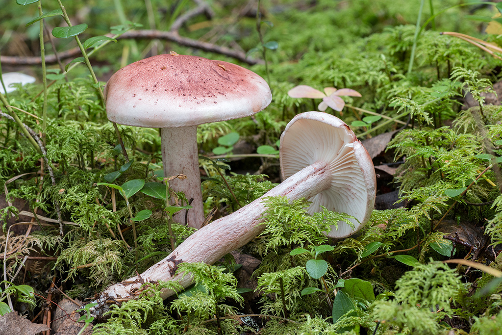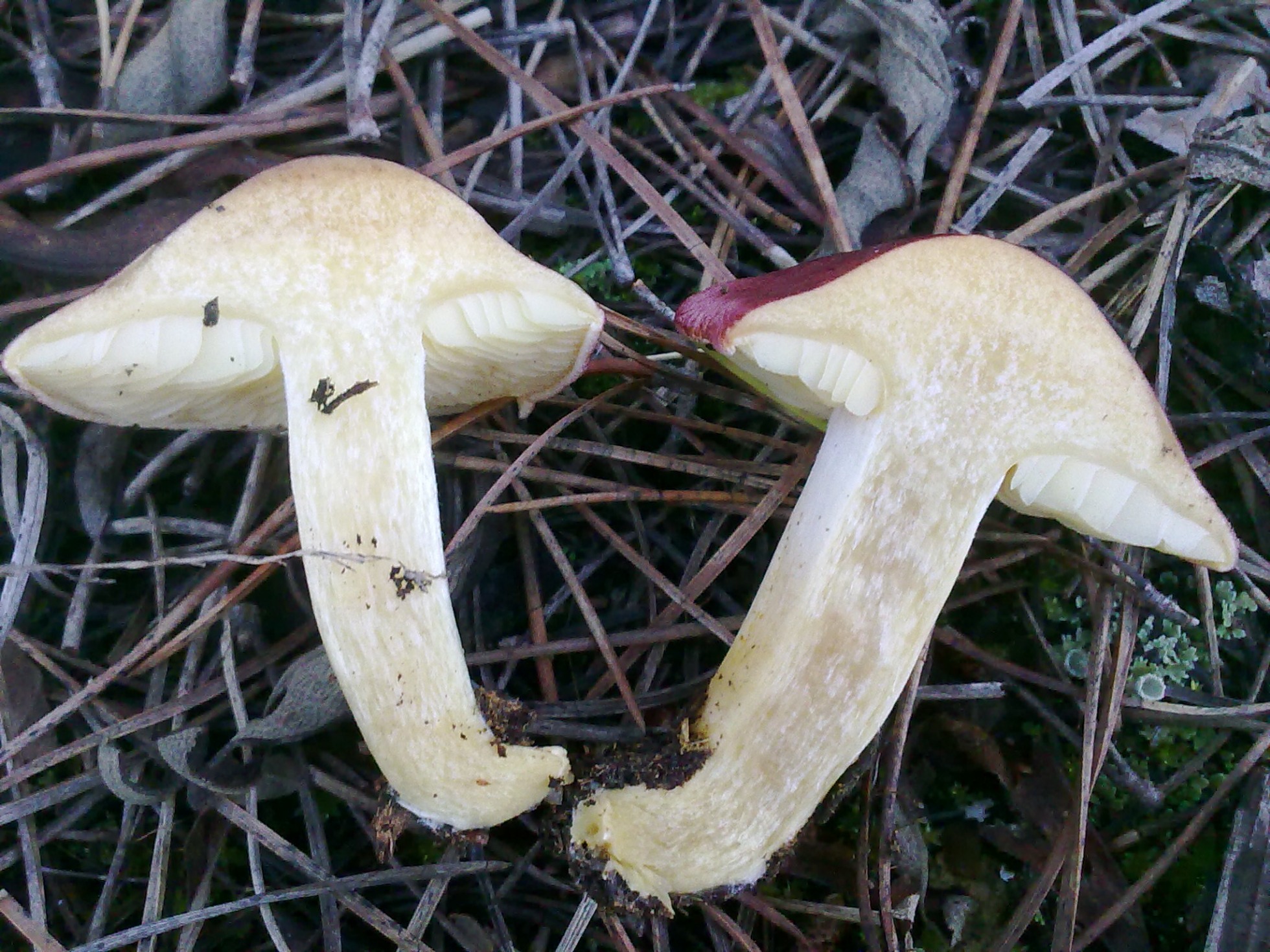Ciertamente la que propone Joseba es la que más se ajusta. Sin embargo en la foto no logro apreciar las escamas y textura del sombrero de la Tricholomopsis, posiblemente por la iluminación de los blancos en la imagen. Quizá Iñigo que la observó físicamente pueda sacarnos de dudas. No obstante os dejo una imagen del hygrophorus erubescens, muy similar, y aunque las láminas son adnatas y no escotadas, hay especies que se caracterizan por disponer de ambas posibilidades, aunque no he encontrado documentación de que esta especie las tenga . Y por otro lado la pigmentación puede aparecer más uniforme como en la fotografía, al igual que sucede con el hygrophorus russula.