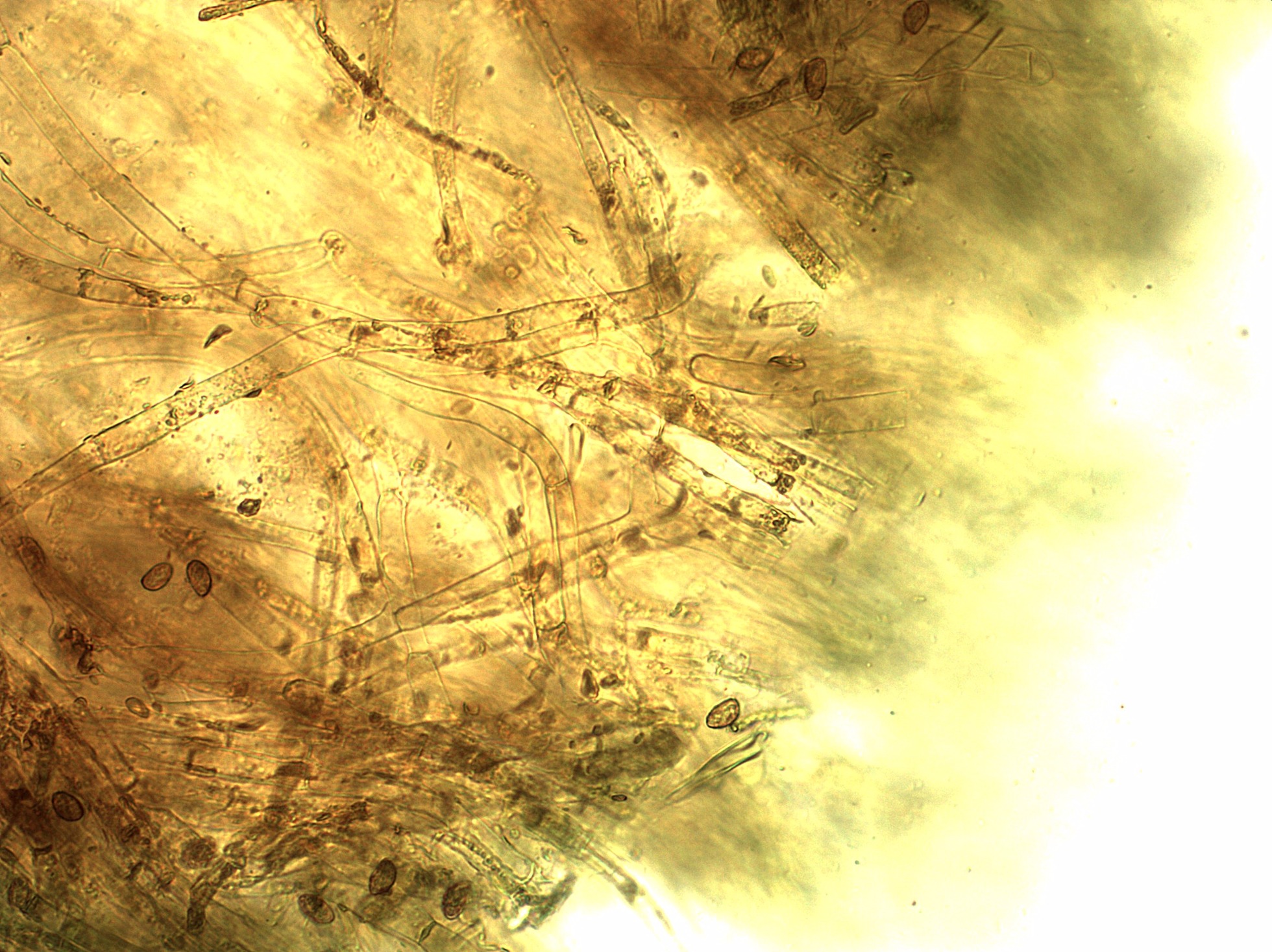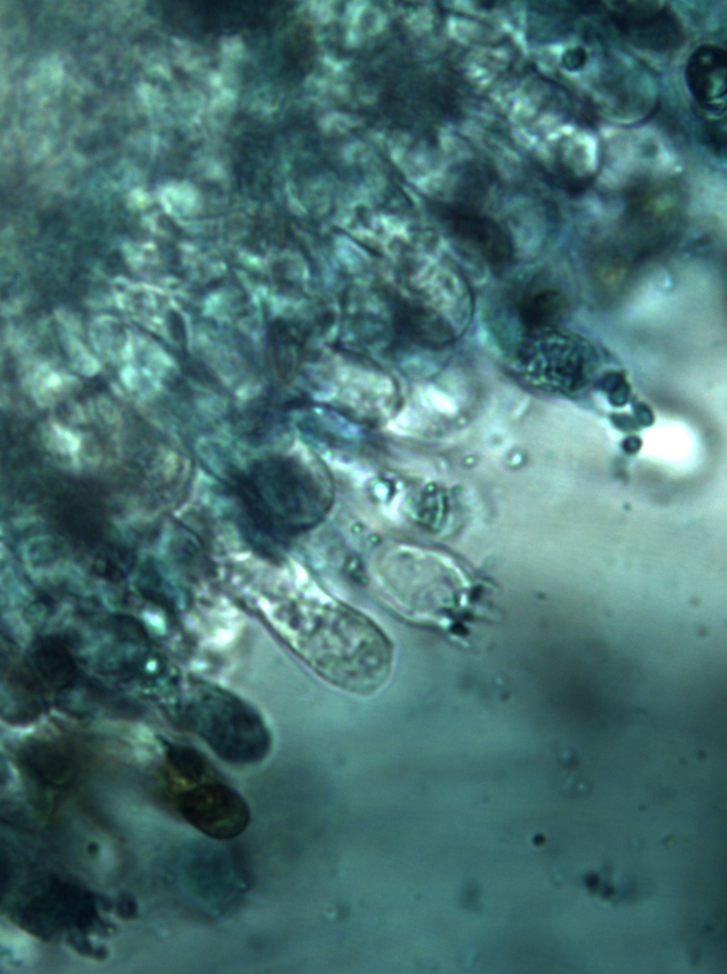 , cuando paso cualquier especie con láminas por el micro lo primero que hago es observar la arista laminar, la presencia o no de queilocistidios y la morfología de estos nos aporta muchos datos que son determinantes para una correcta identificación, en el caso del Gymnopilus junonius los queilocistidios son alargados y capitados, muy bien con la Pileipellis y los basidios