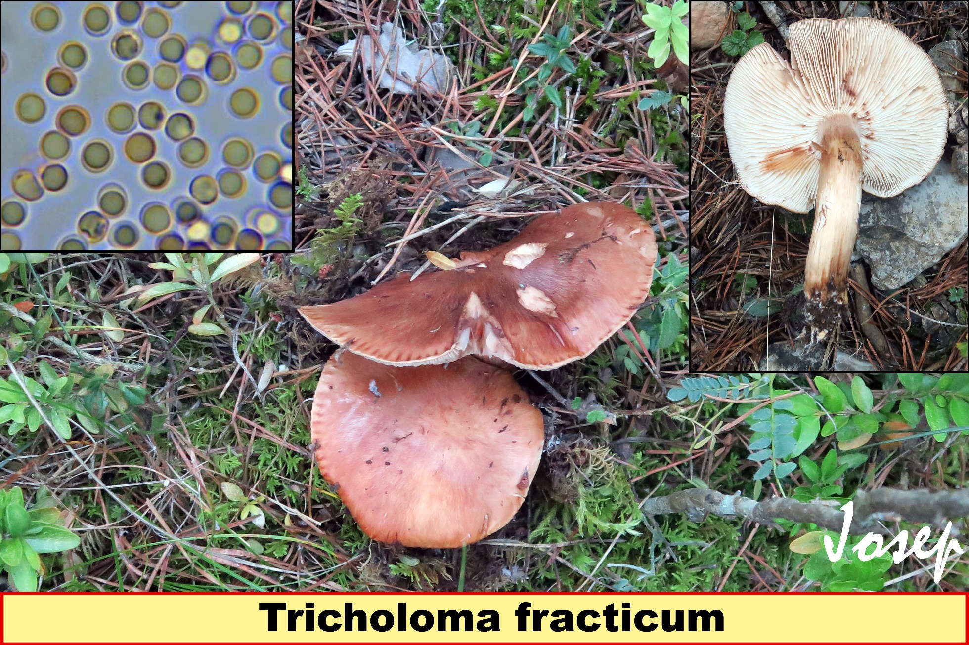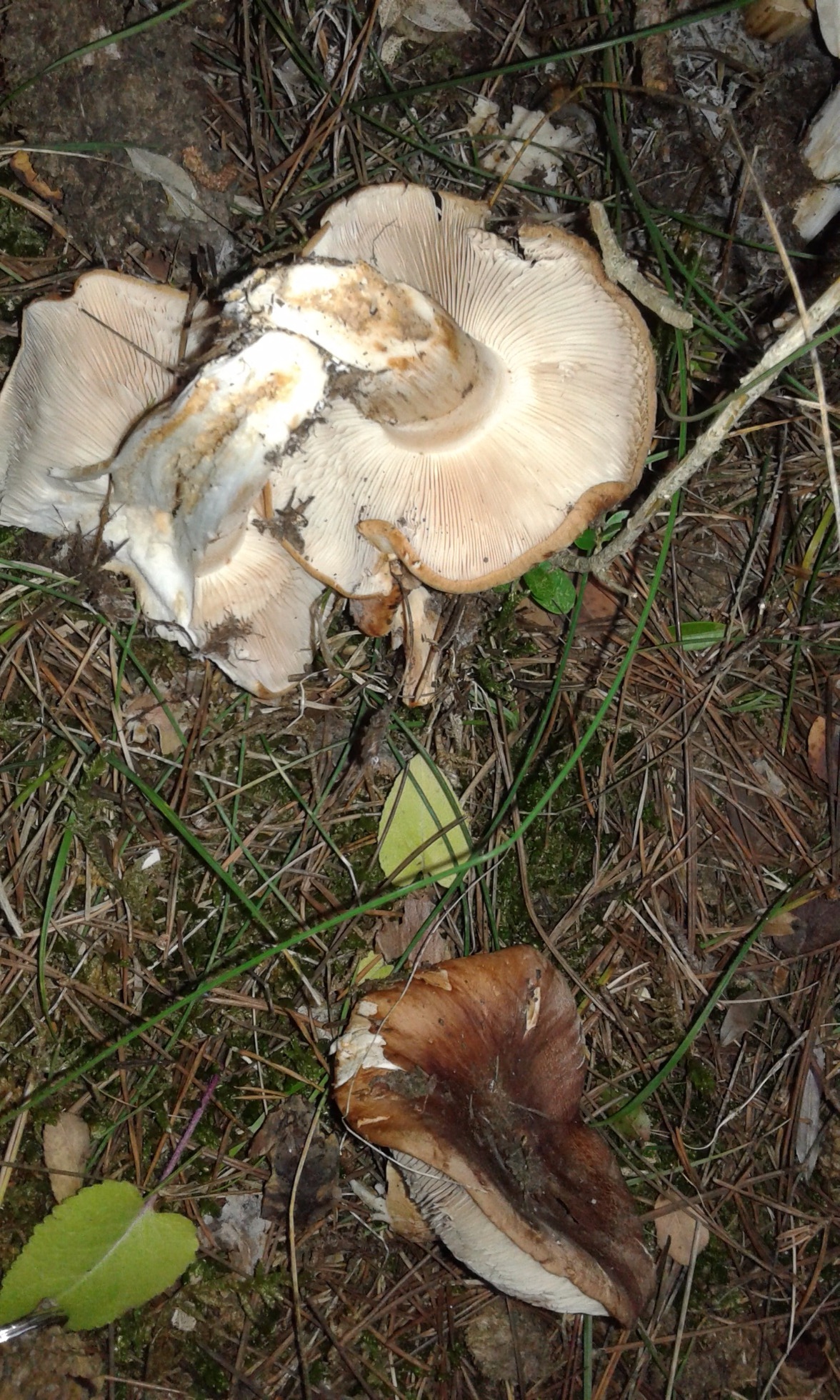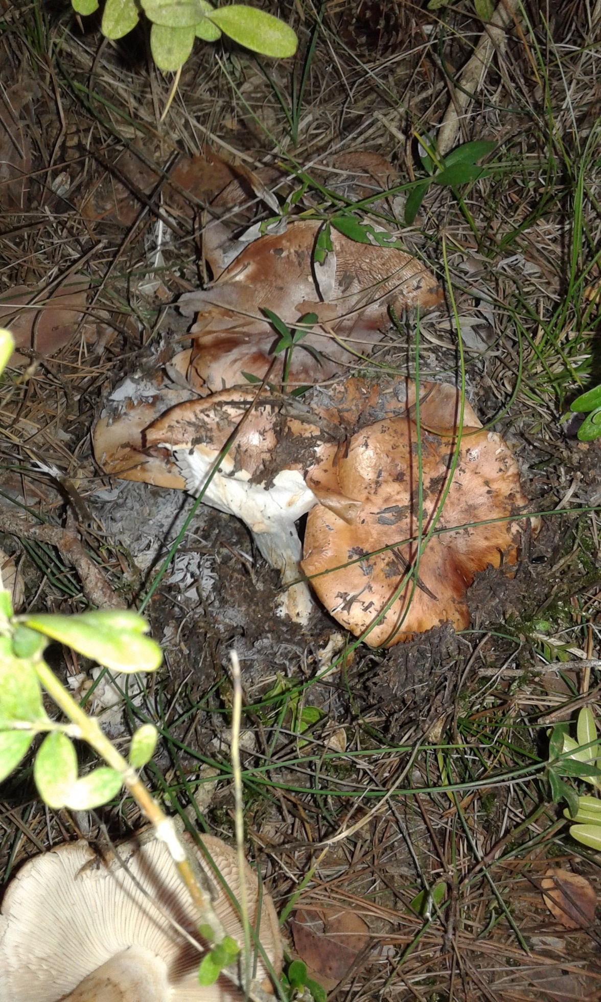 De acuerdo con Joseba, aunque viendo la banda anular blanca en la parte superior del pié, en la tercera de tus imágenes, tampoco descartaría el Tricholoma fracticum, en mi caso y bajo pinos la mayoría de las veces que he pasado por el micro algún Tricholoma parecido al que nos muestras ha resultado ser Tricholoma fracticum y solo en una ocasión ha resultado ser el Tricholoma pessundatum.
