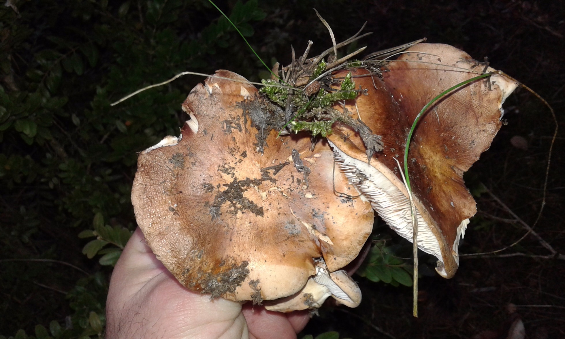 Hola Antonio, aunque hay unos cuantos Tricholomas marrones, por el hábitat que comentas y las características me da por Tricholoma pessundatum, a ver que te parece.