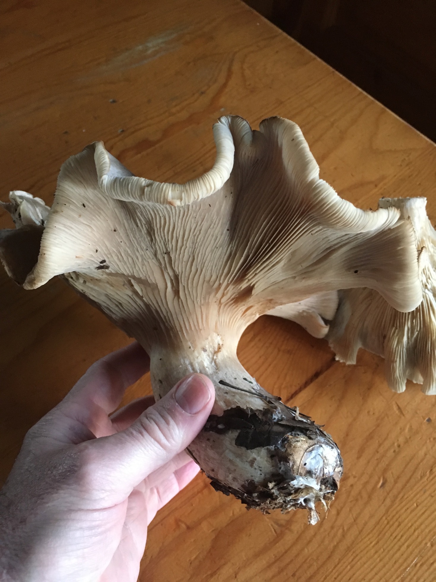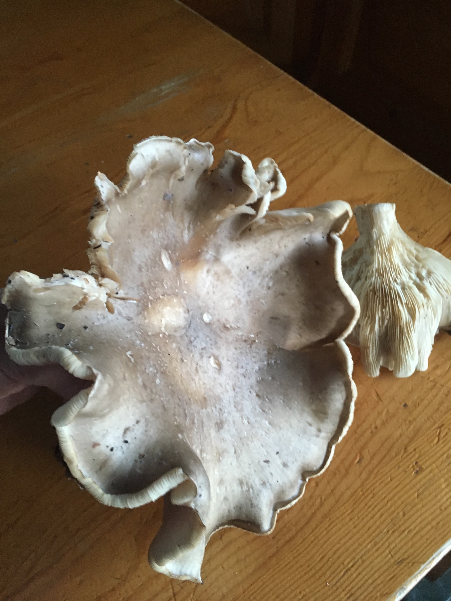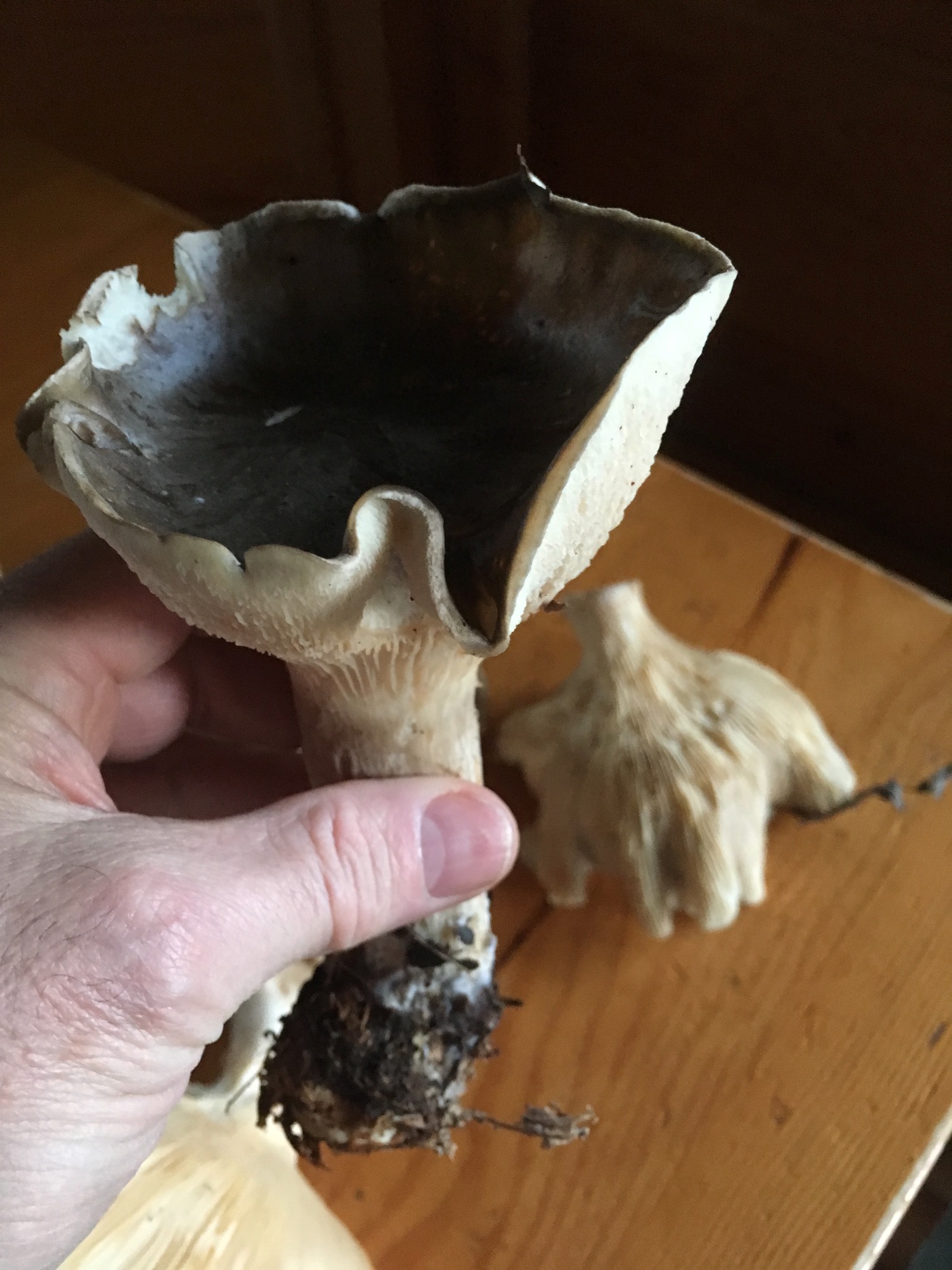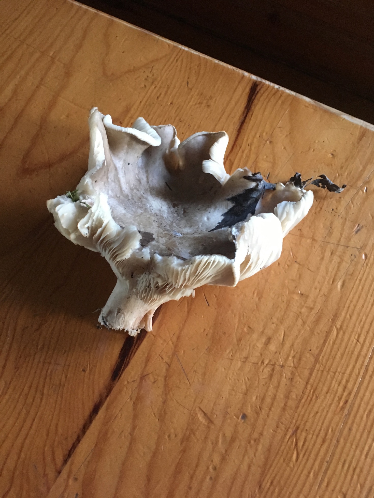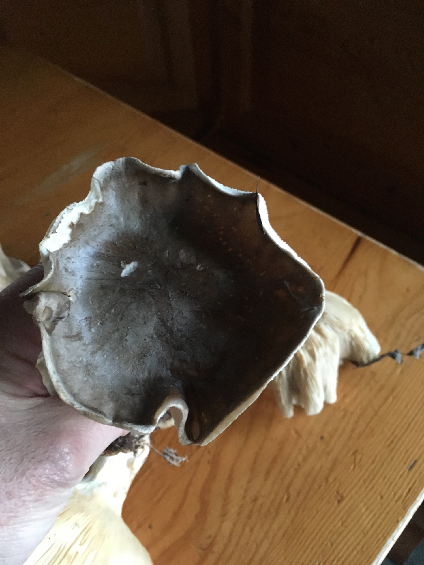 Otra opción sería la de Clitocybe nebularis un tanto especial, últimamente están saliendo muchas.