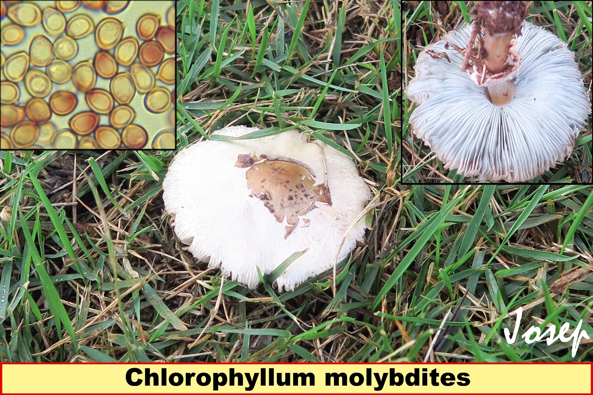 Hola Lucas, yo en tus imágenes veo claramente tres especies. La Macrolepiota molybdites, actualmente denominada Chlorophyllum molybdites, es una especie que conozco perfectamente y nunca me la he encontrado en nuestra Península, las veces que la he visto y estudiado ha sido en el Continente Americano, se caracteriza por la esporada de color verde. Tus imágenes no son muy buenas y las dos únicas que se parecen remotamente al Chlorophyllum molybdites son las dos primeras y solo por el pié que se ve rojizo, el Chlorophyllum molybdites es muy rubescente. La tercera de tus imágenes es de Coprinus comatus y las dos siguientes de una Volvariella, considerando sus dimensiones quizás Volvopluteus goiocephalus, se aprecia claramente la volva, la ausencia de anillo y las láminas rosadas por el efecto de la esporada.
