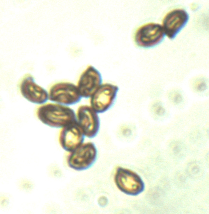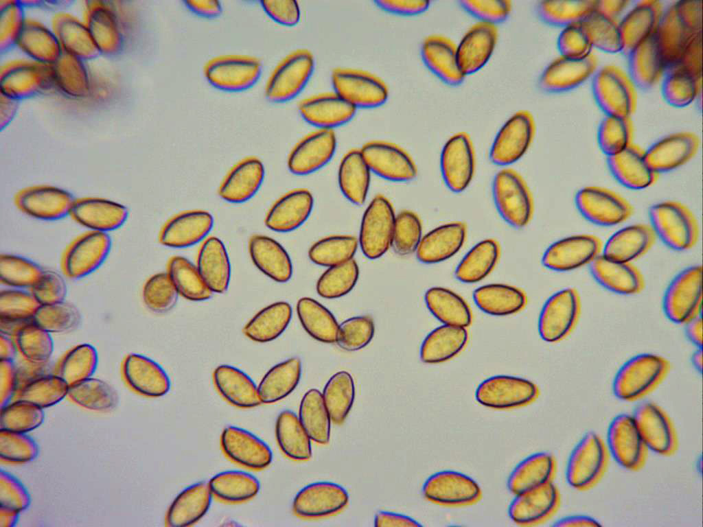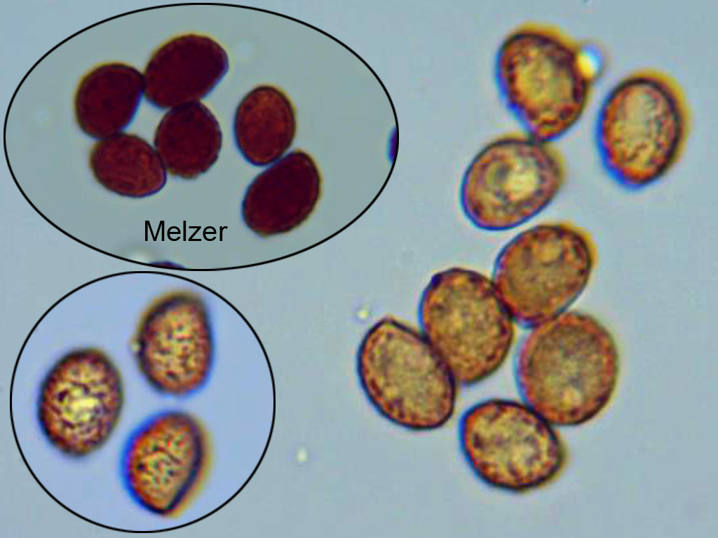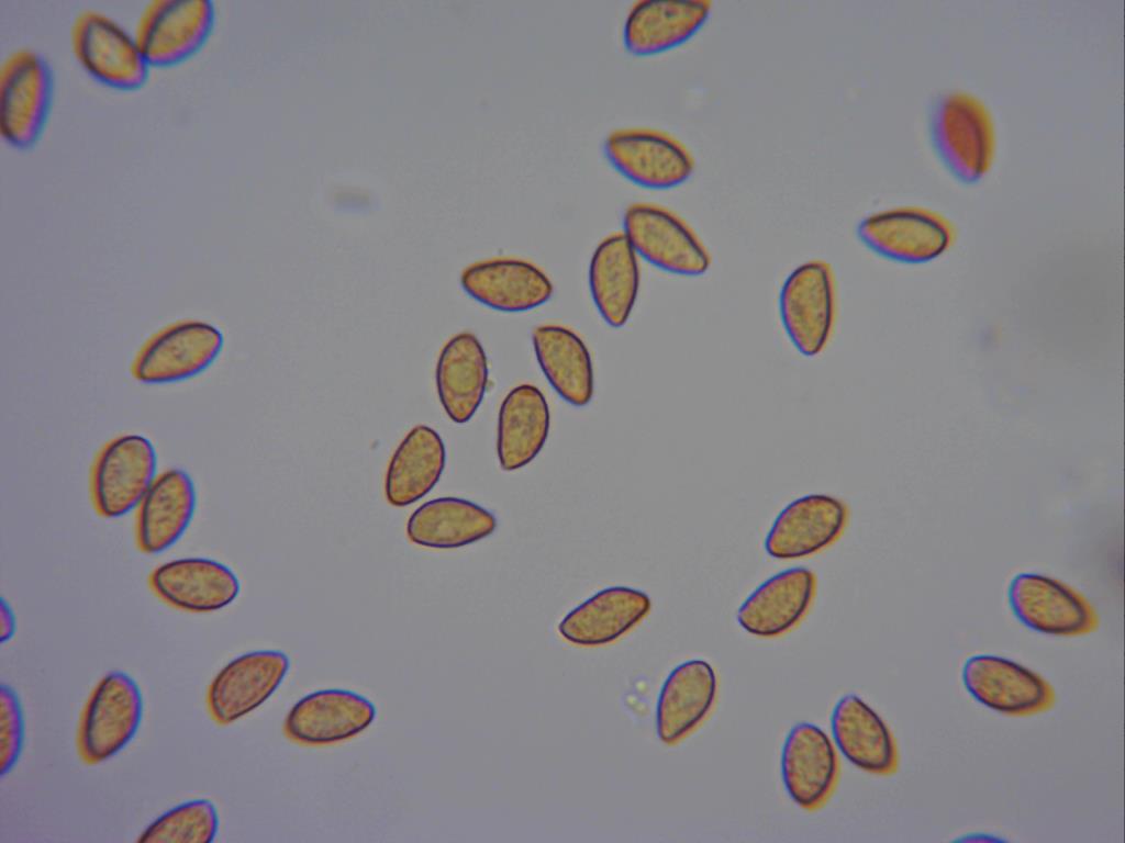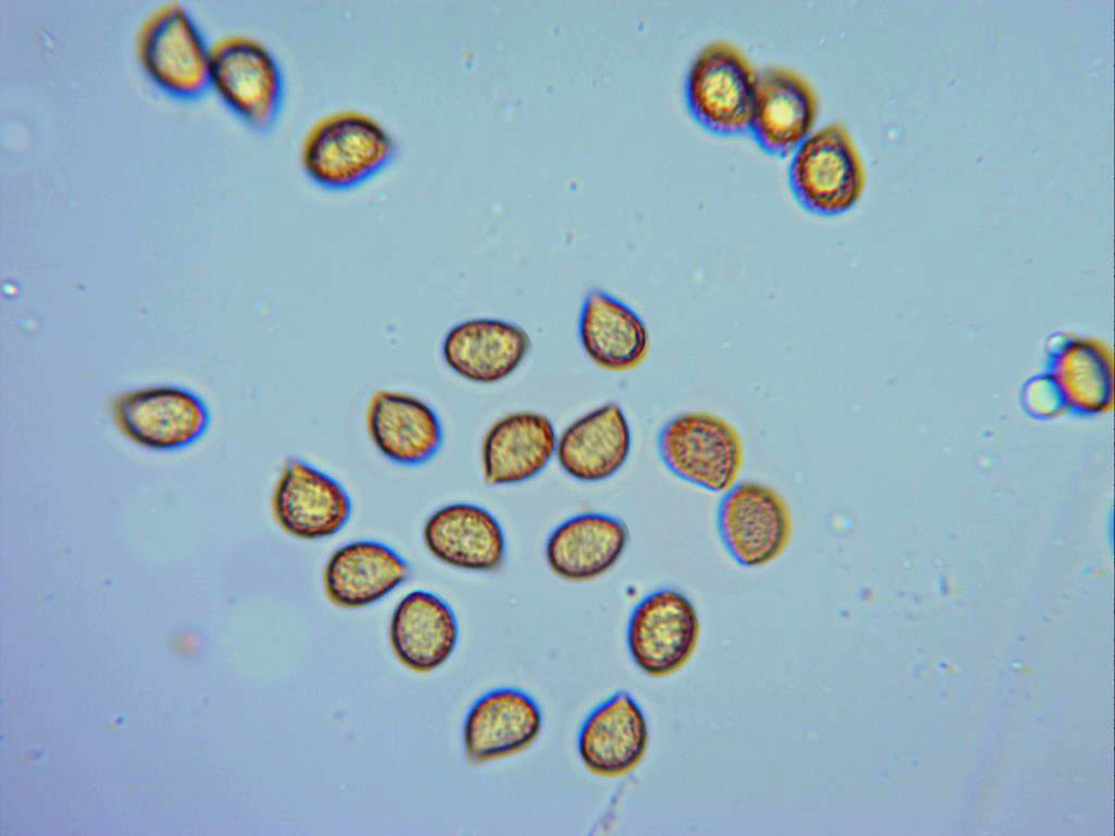 Hola Jon Ander, estos son complicados aún con toda su micro. En primer lugar felicitarte por la micro, estás avanzando a pasos agigantados. Este que nos muestras se trata de un Cortinarius que proviene del grupo "Dermocybe", de estos y que me haya encontrado bajo pinos el más parecido a lo que nos muestras es el Cortinarius cinnamomeus, aunque hay otros de muy parecidos que no me he encontrado aún, como el Cortinarius croceus y el Cortinarius malicorius, aunque en los tres casos las medidas esporales que nos indicas están bastante por debajo de las que deberían presentar, asegúrate de que tienes el micro bien calibrado para las mediciones, en cuanto a las imágenes a 1000 aumentos quizás deberías utilizar algún tipo de filtro ya que parecen sobreexpuestas (con demasiada luz), este detalle puede afectar a las mediciones, la ornamentación esporal en estos casos es a menudo determinante.
