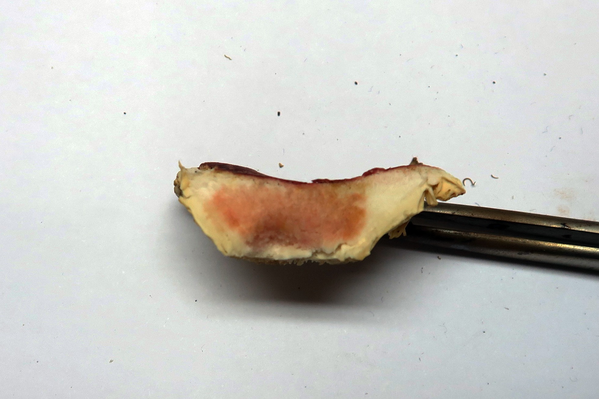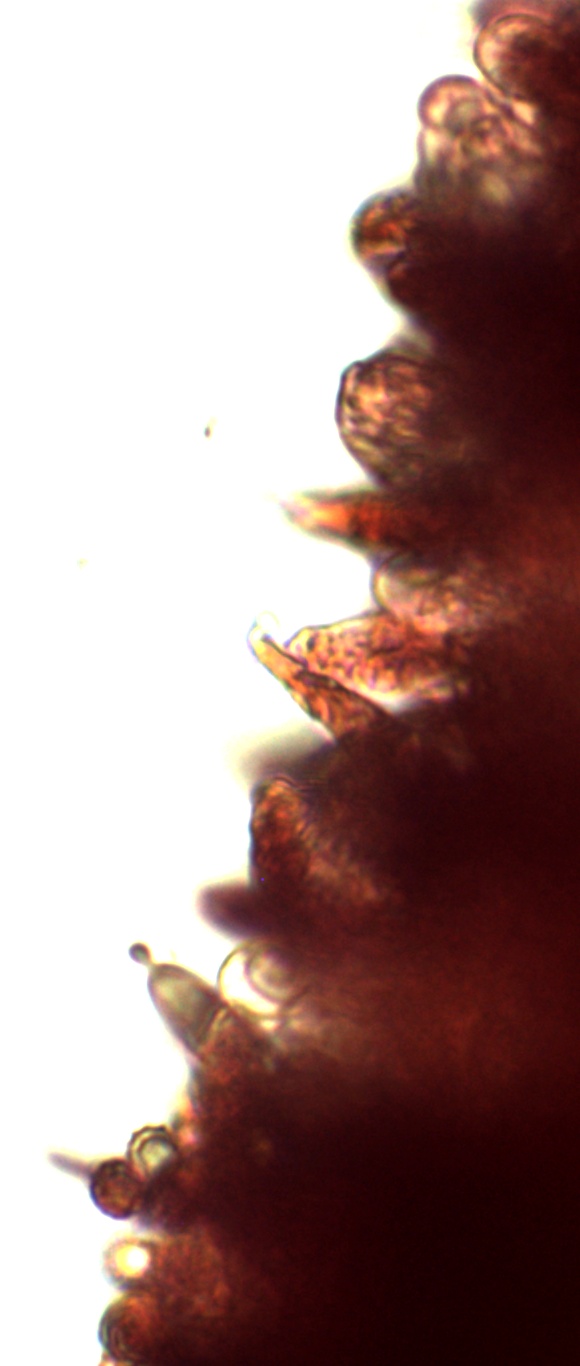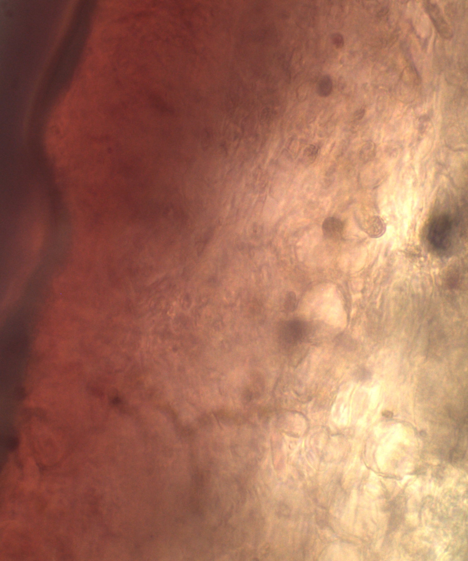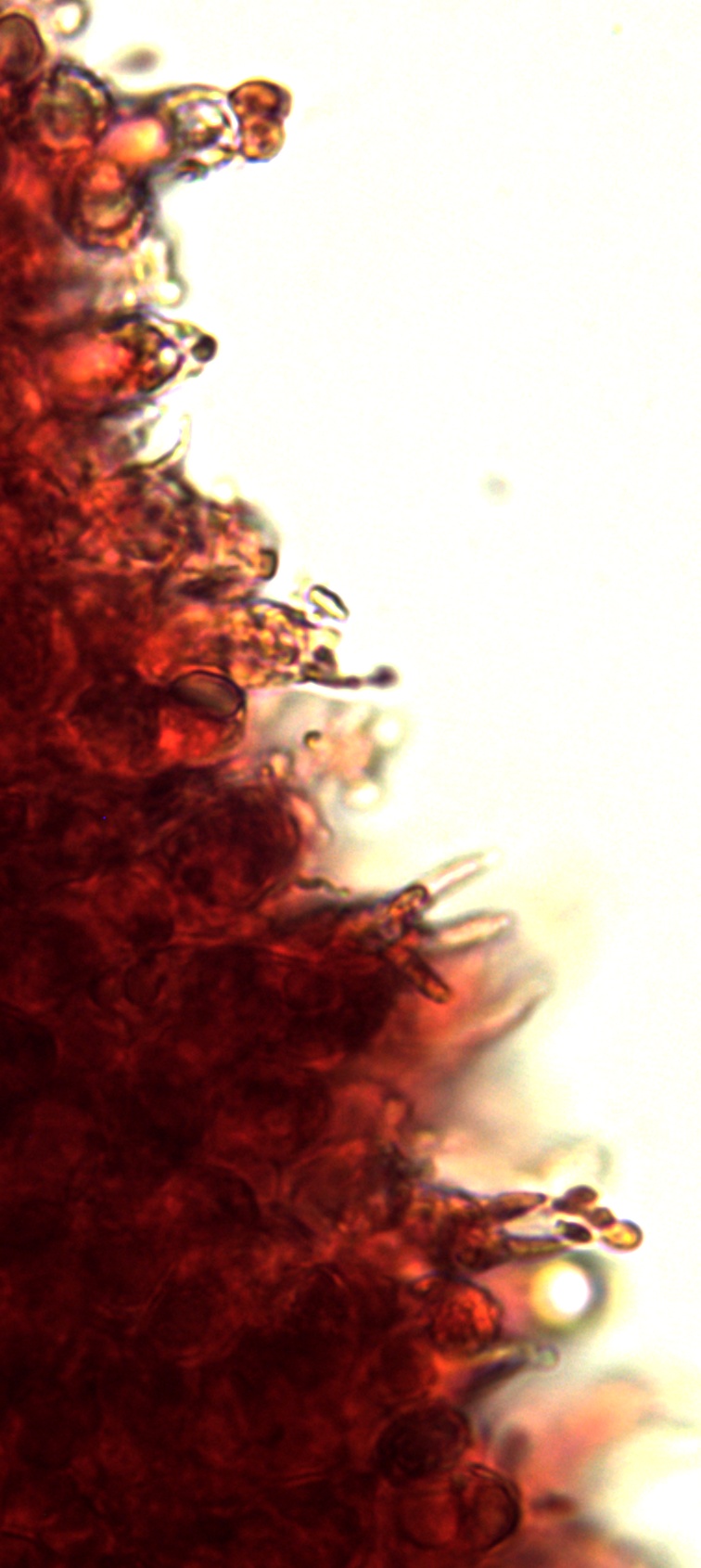 Te dejo unas imágenes de las pruebas que realicé con reactivos a una supuesta Russula sanguinea, así como una imágen de sus esporas.
