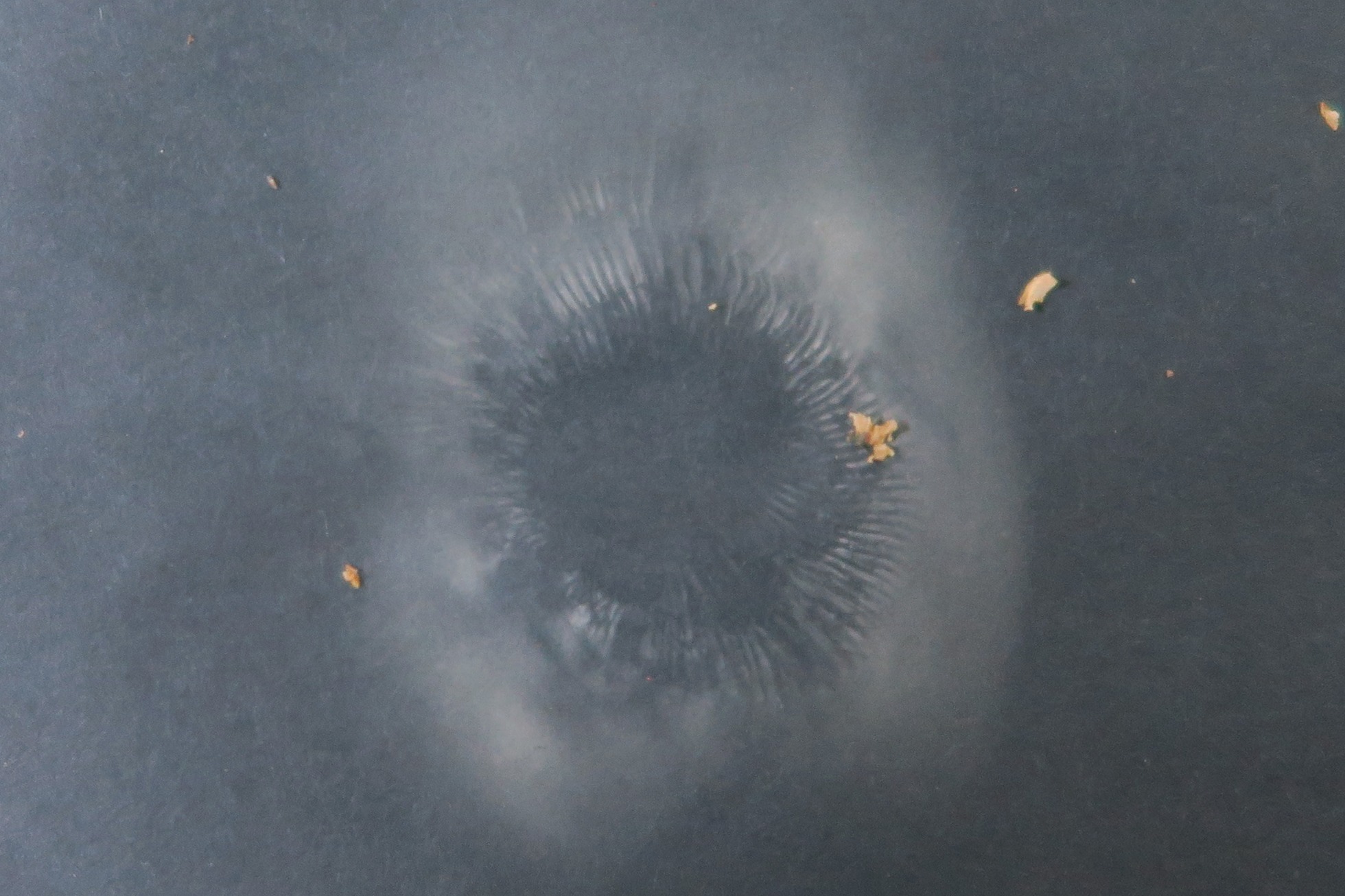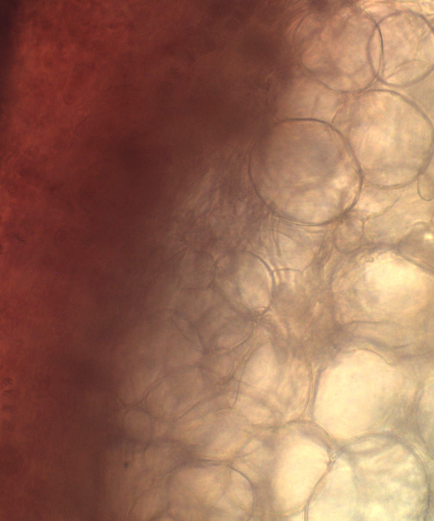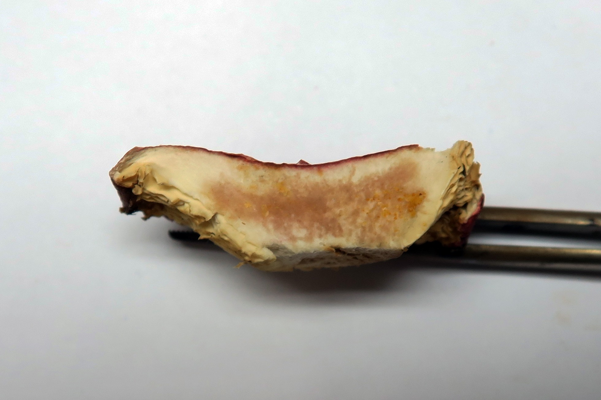 Te dejo unas imágenes de las pruebas que realicé con reactivos a una supuesta Russula sanguinea, así como una imágen de sus esporas.