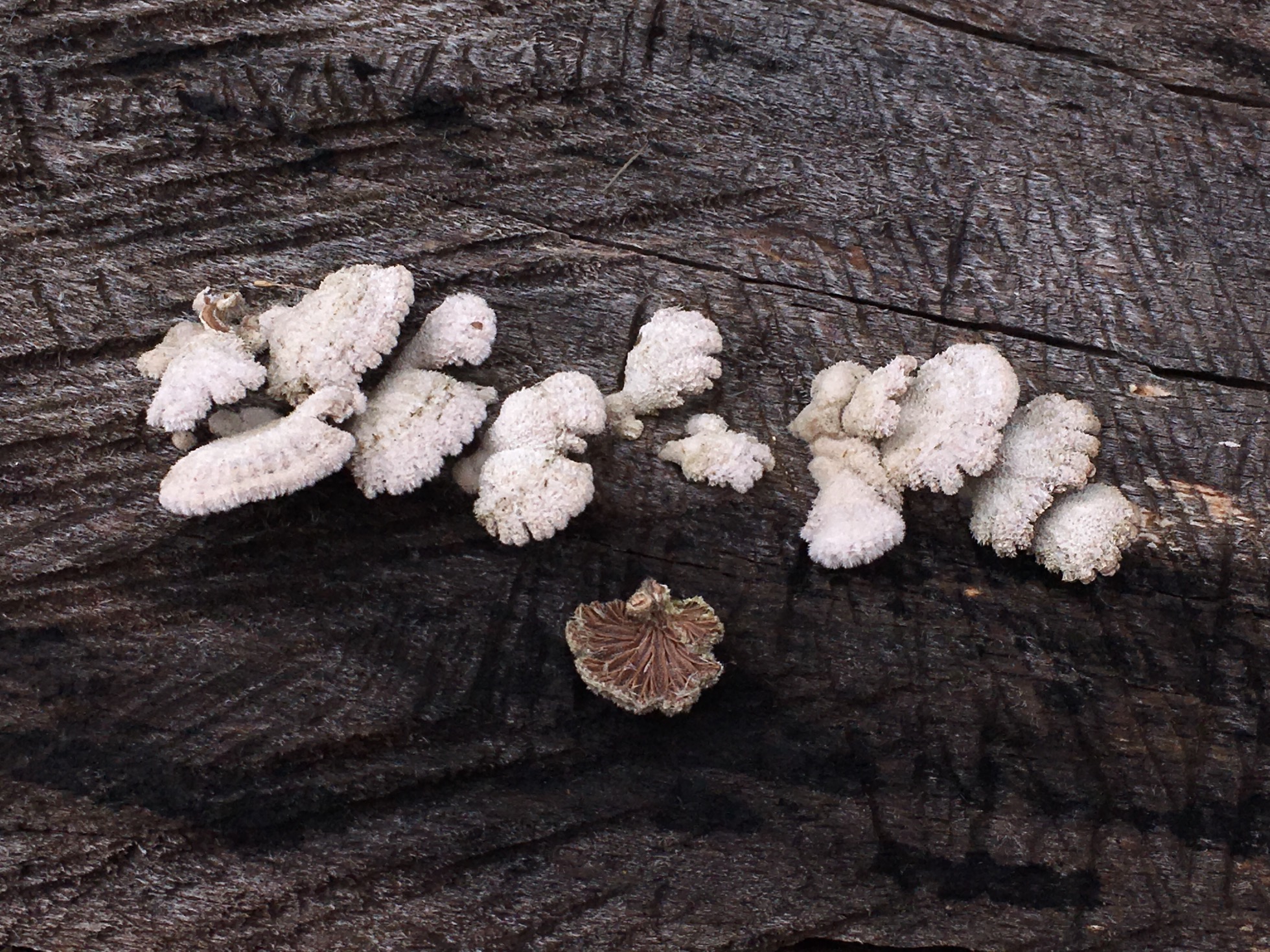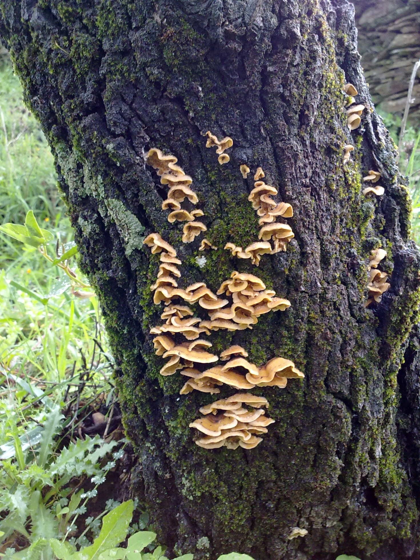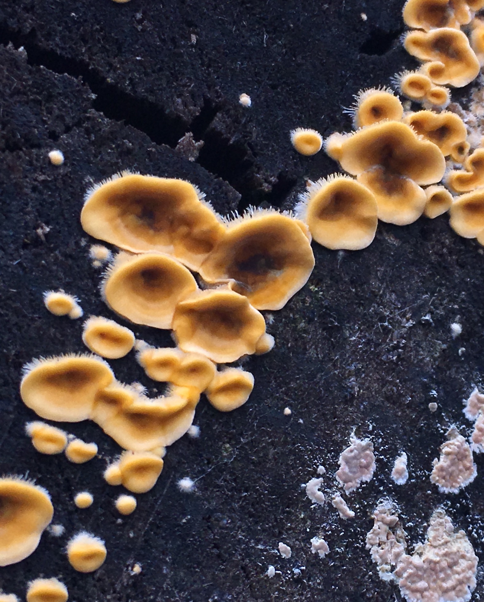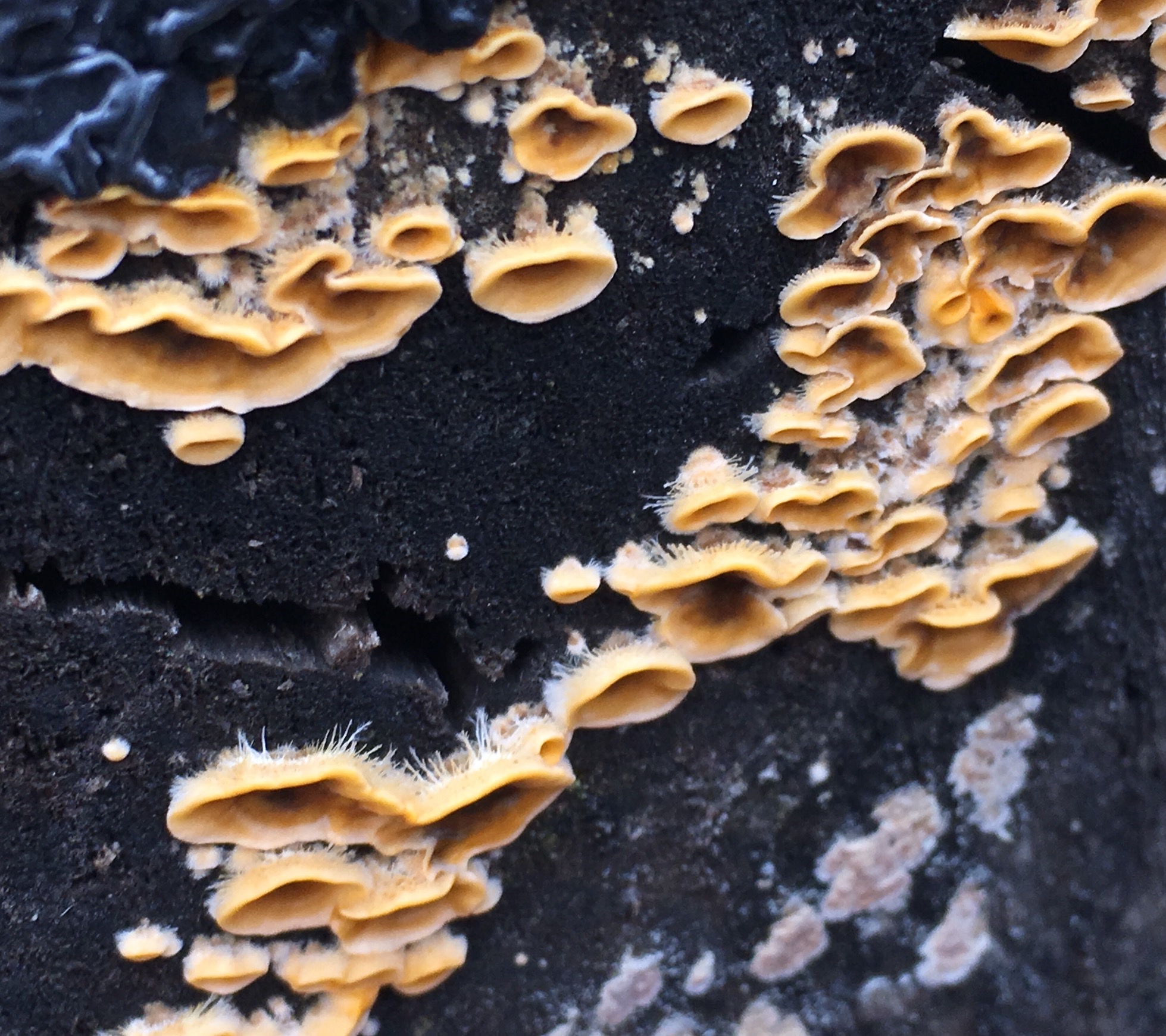 Y las de color anaranjado parecen claramente primordios de Stereum hirsutum, se aprecian con facilidad los pelos en la parte superior de muchos de los sombreros.