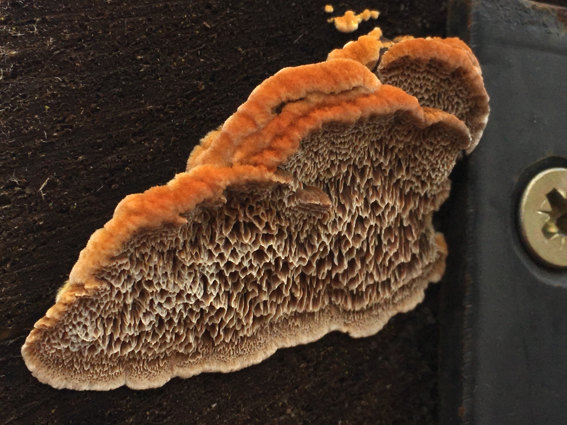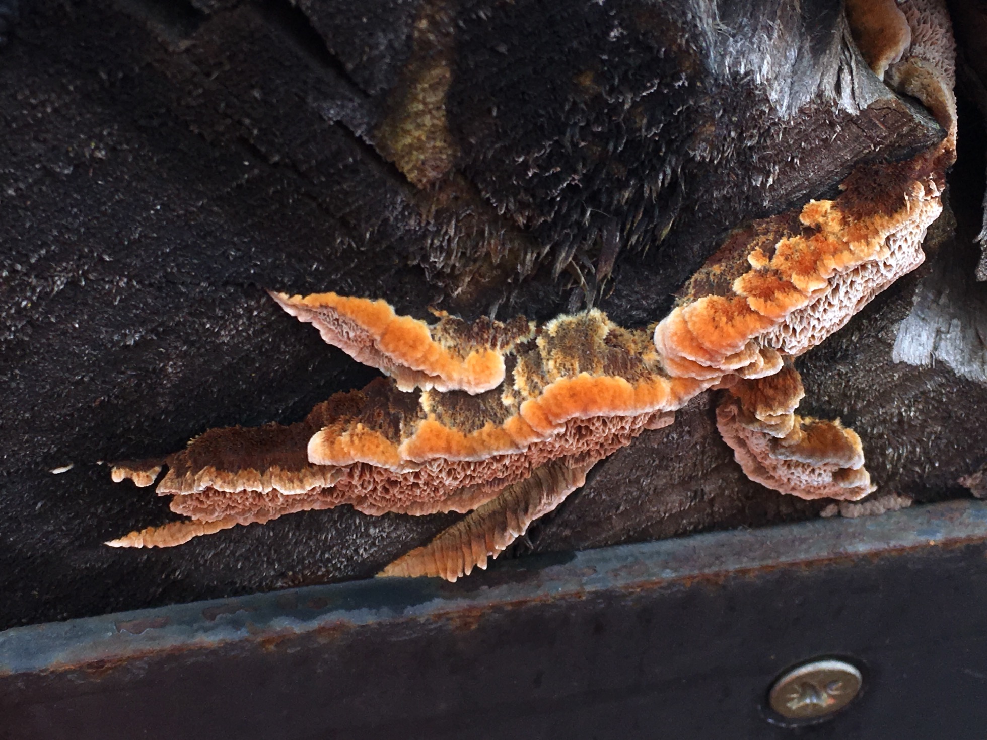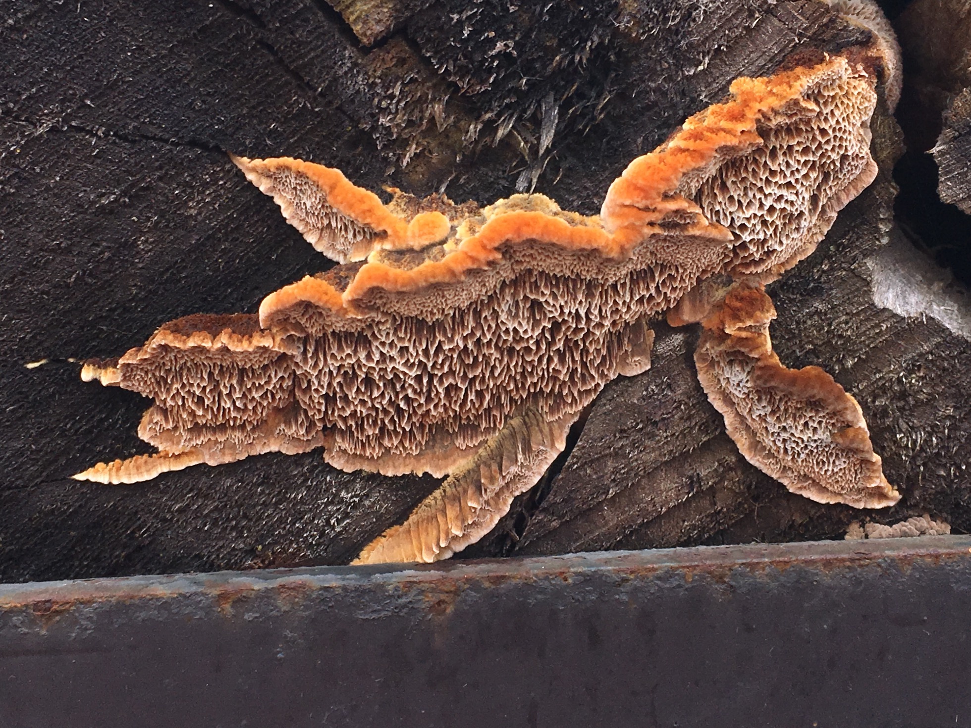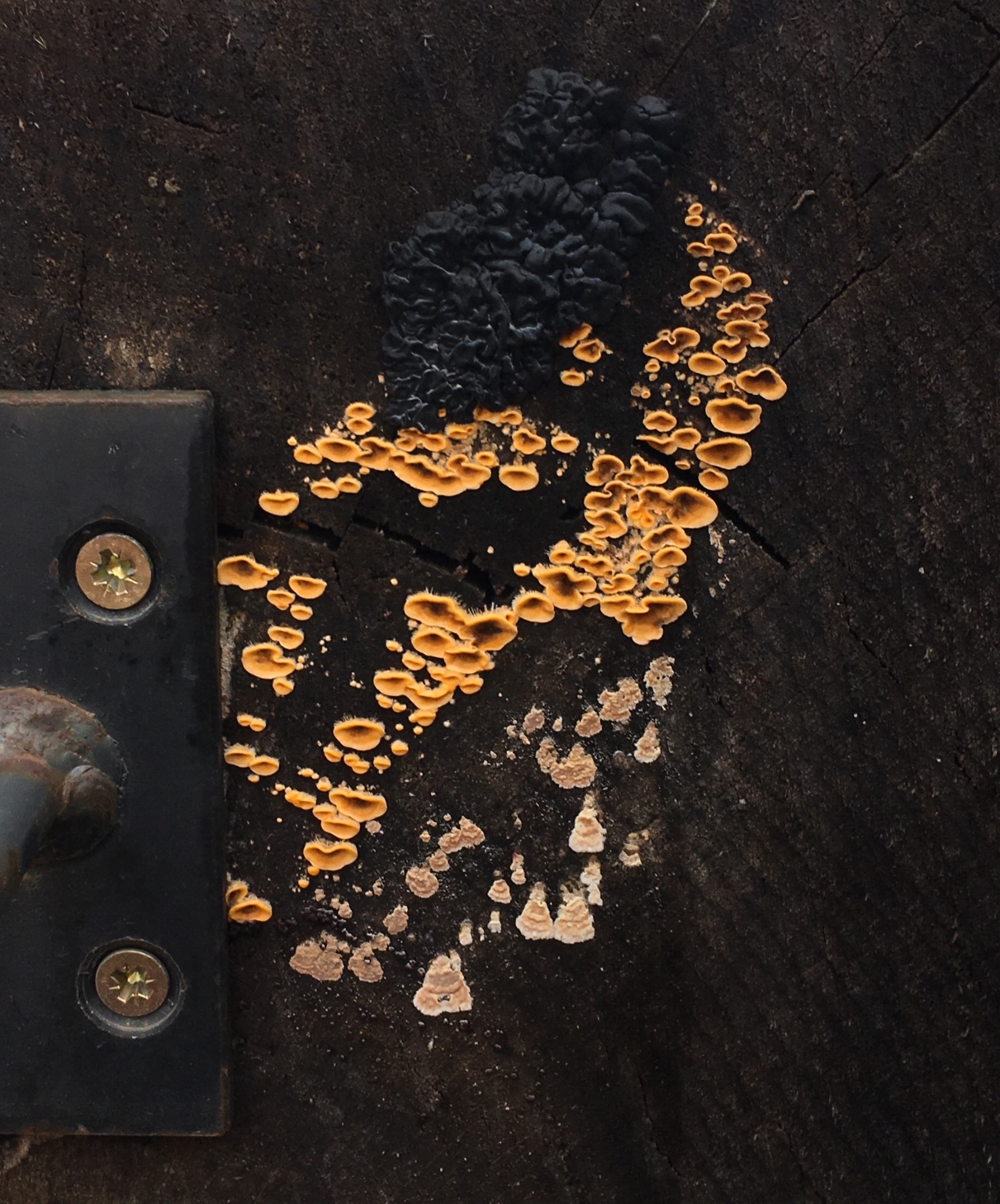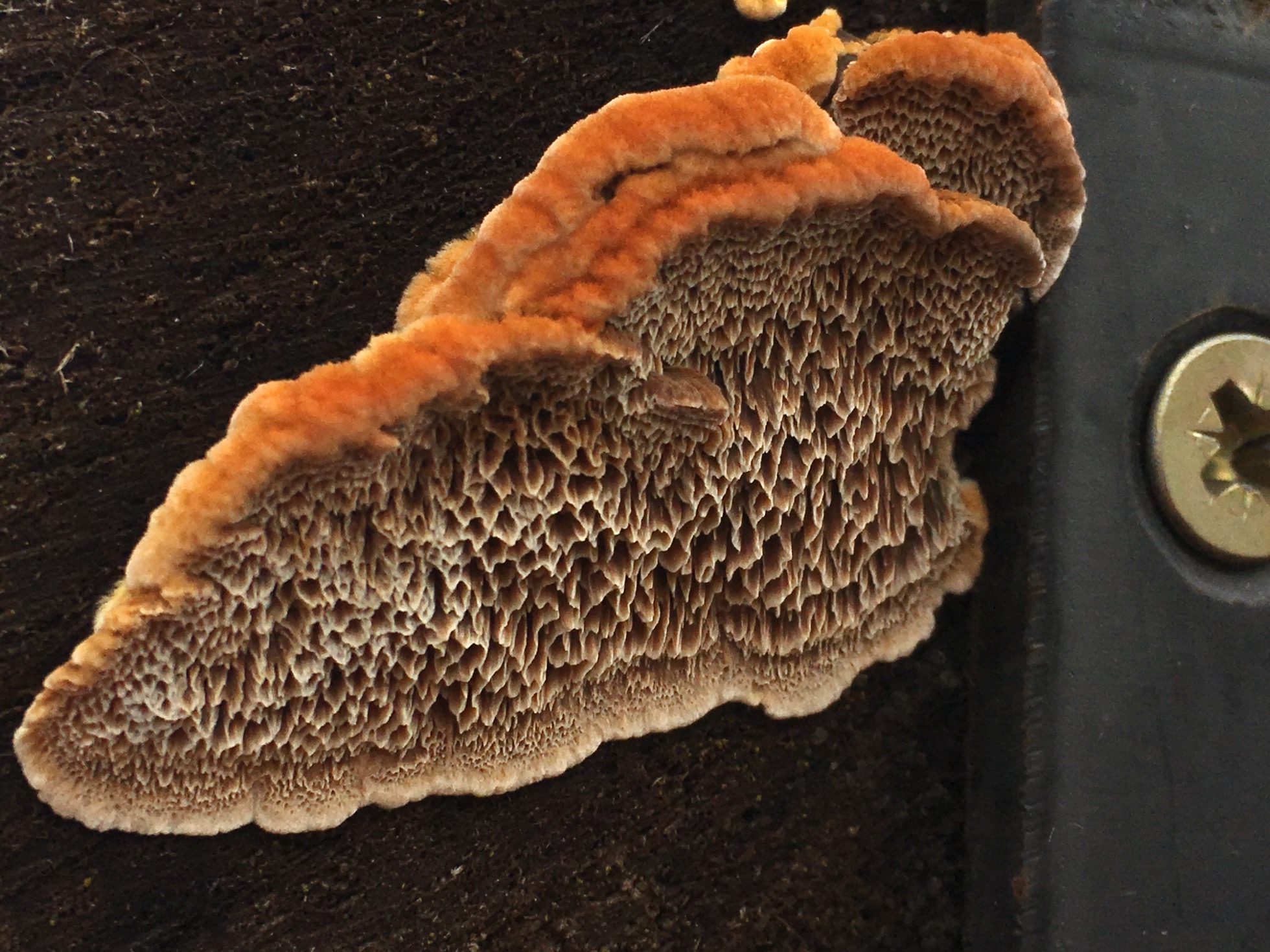 Y las de color anaranjado parecen claramente primordios de Stereum hirsutum, se aprecian con facilidad los pelos en la parte superior de muchos de los sombreros.