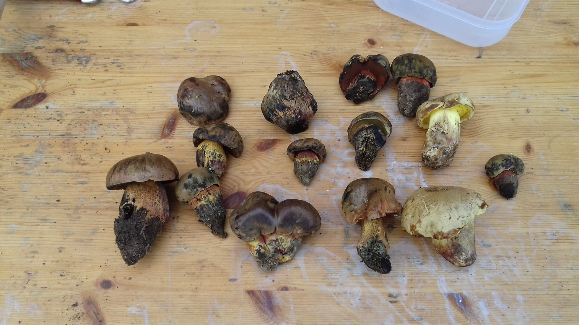 En la imagen general, el más claro con poros amarillos podría ser Caloboletus radicans.
