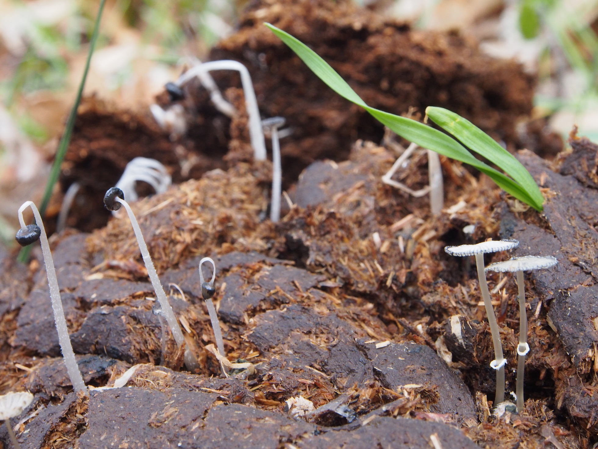 Y ya con los de boñigas de vaca. Estos dos no estoy seguro que sean lo mismo por los restos blancos en el borde de uno de ellos; encontrados en dos dias seguidos en sitios diferentes. Mi apuesta es Panaeolus sphinctrinus