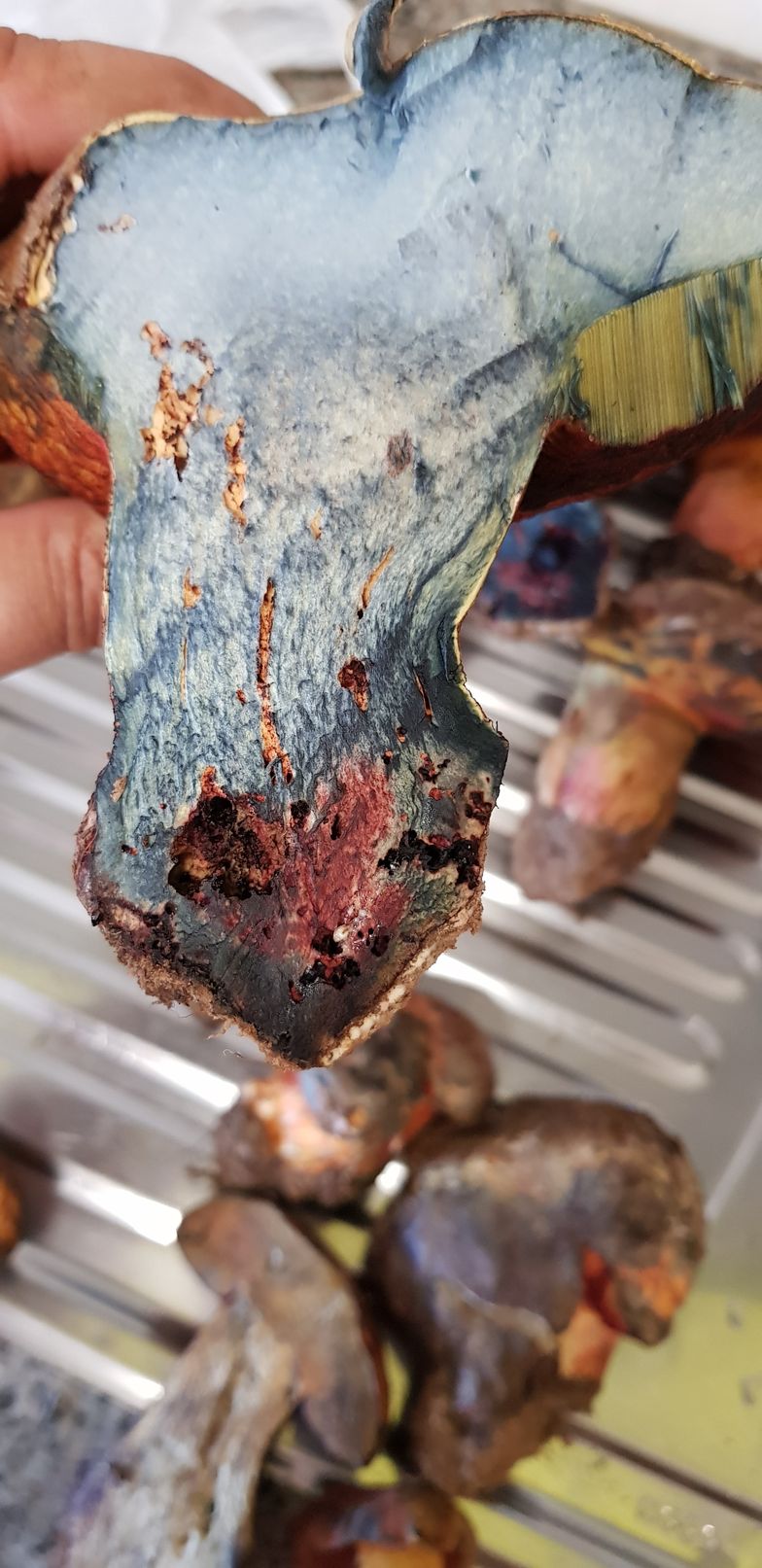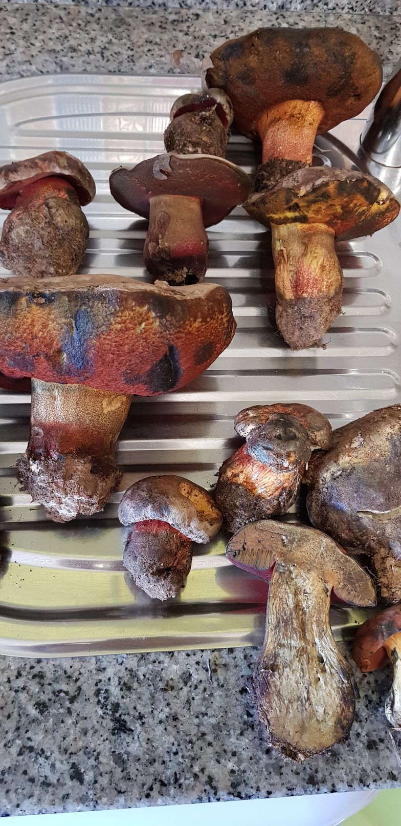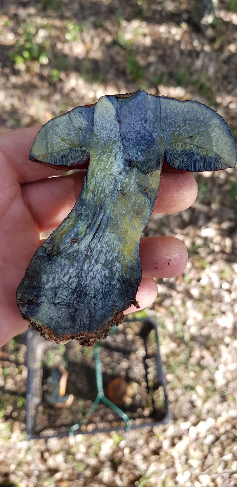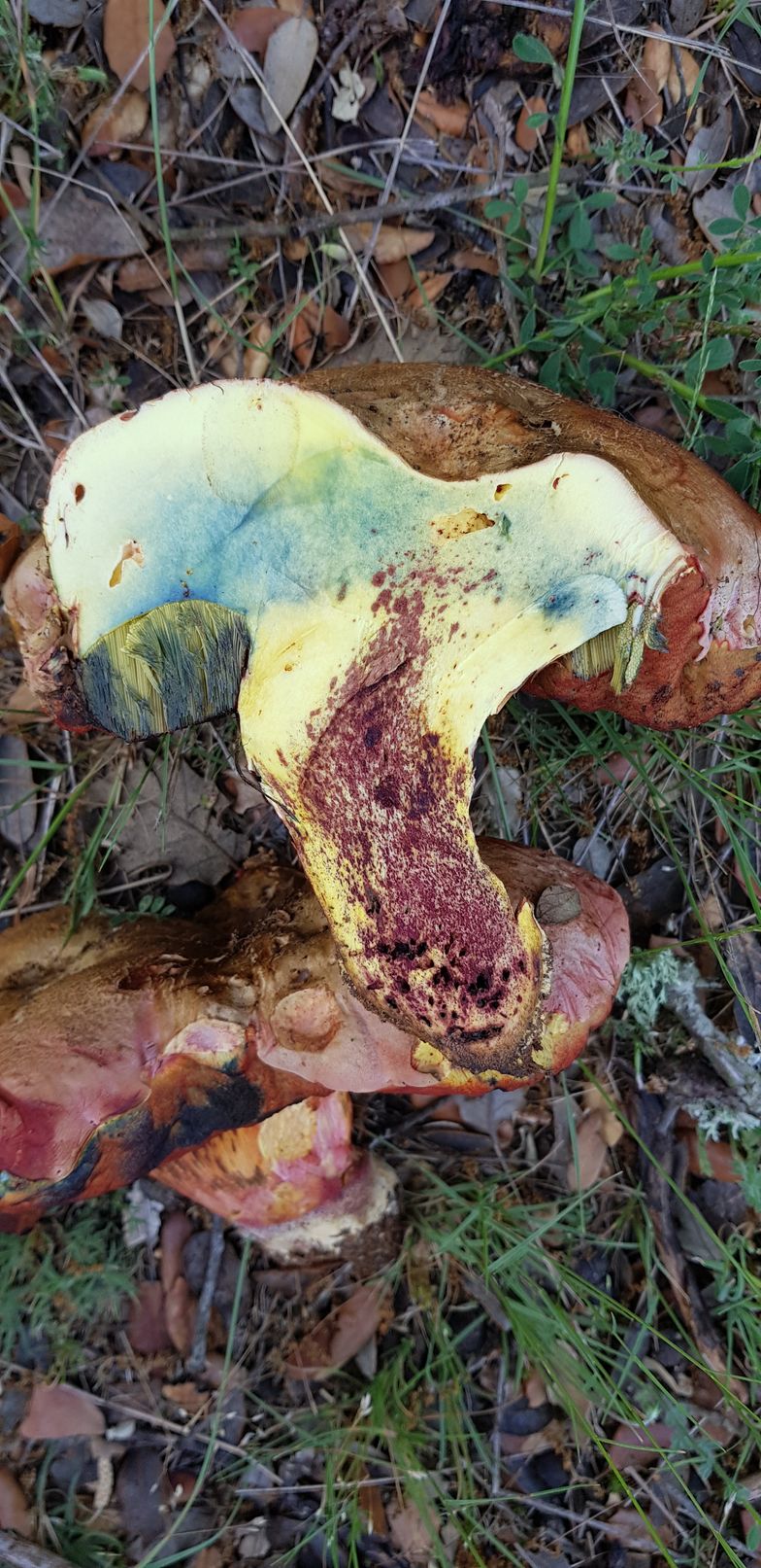 Estos ejemplares fueron recogidos bajo encinas y robles. Pienso que podría tratarse de erytropus pero como no lo tengo muy claro prefiero asegurarme. Como se puede ver azulean al corte y me llamó la tención que tras un buen rato vuelven a recuperar su color original.