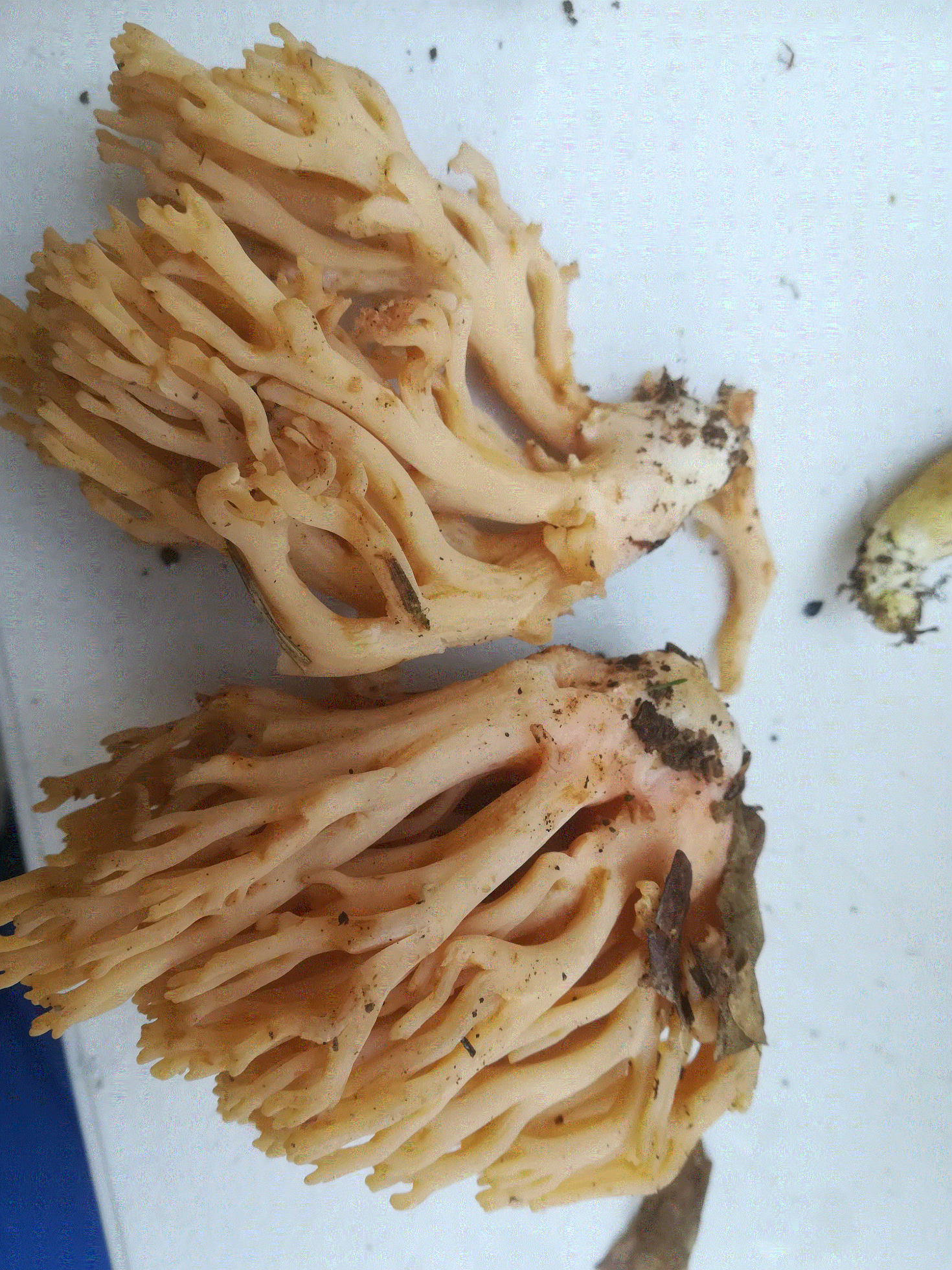 La primera es una Ramaria, sin mas datos difícil el llegar a la especie, aunque veo tonos rosados en la base y no descarto a la Ramaria formosa, especie tóxica.