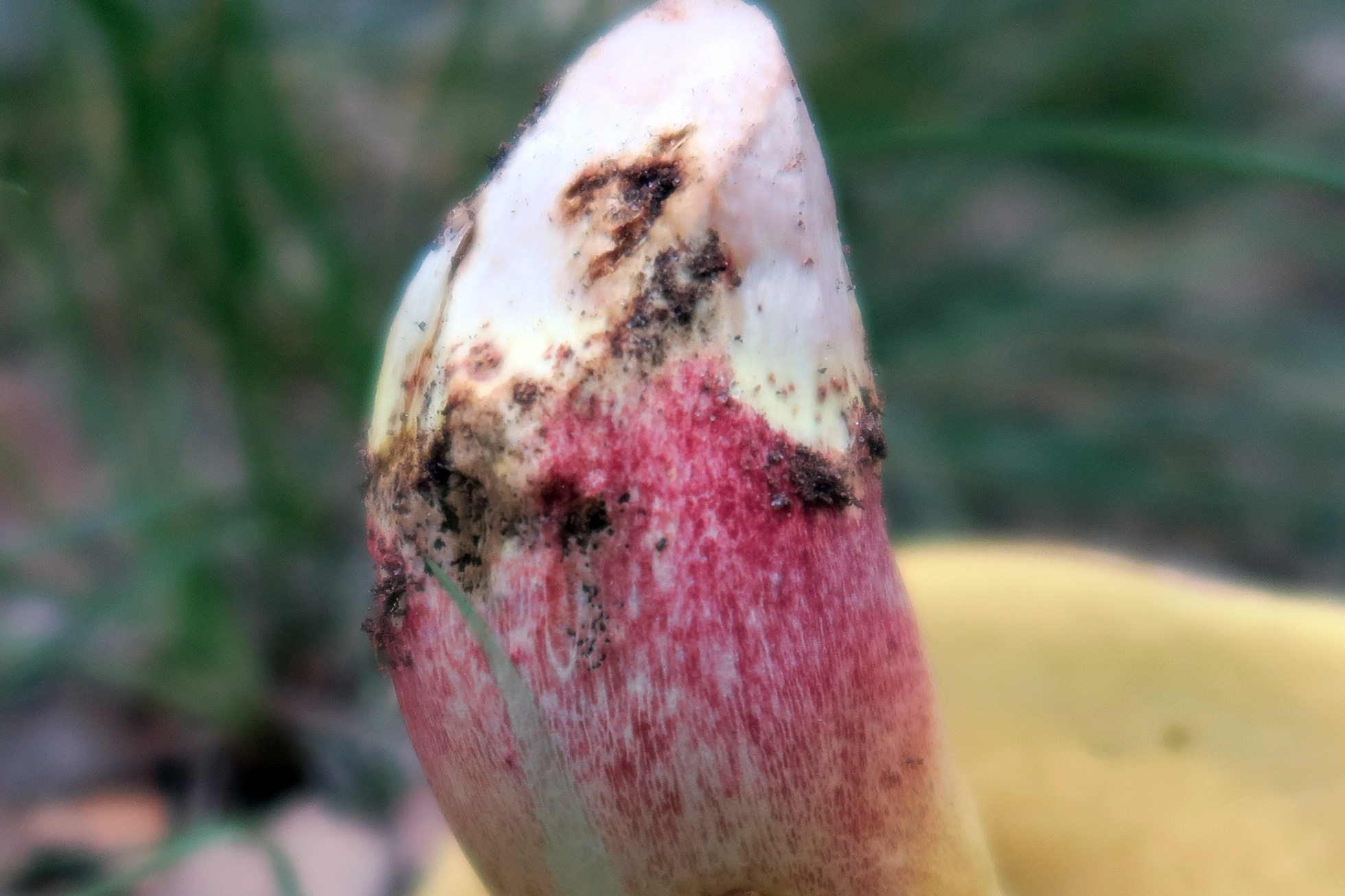 Su sombrero era de color marrón/mostaza, pié estriado de color de fondo amarillo con evidentes matices anaranjados, pero lo que mas me ha descolocado es su base lisa y de color remolacha en su tercio inferior.