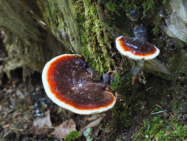 La primera podría ser una Ganoderma, se encontraba en el tocón de una pícea.