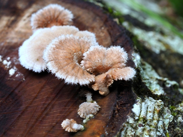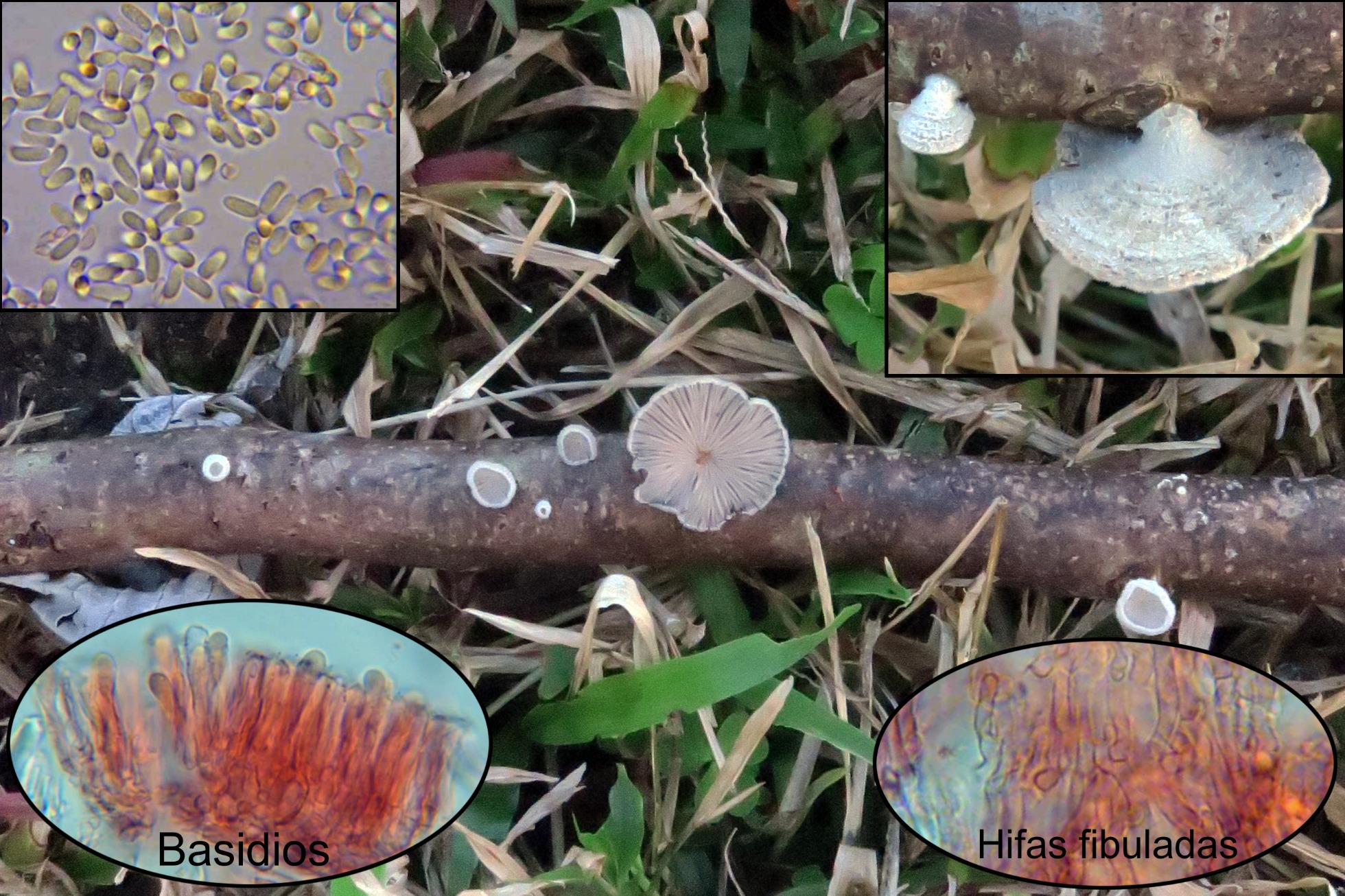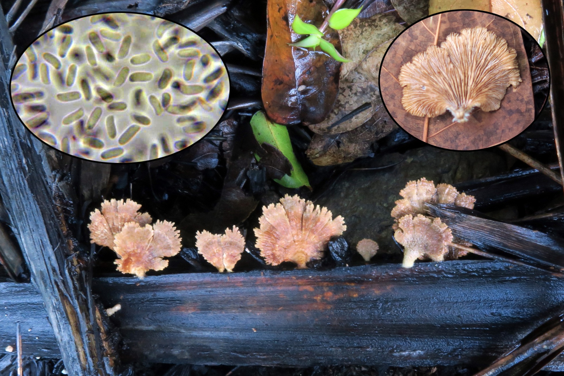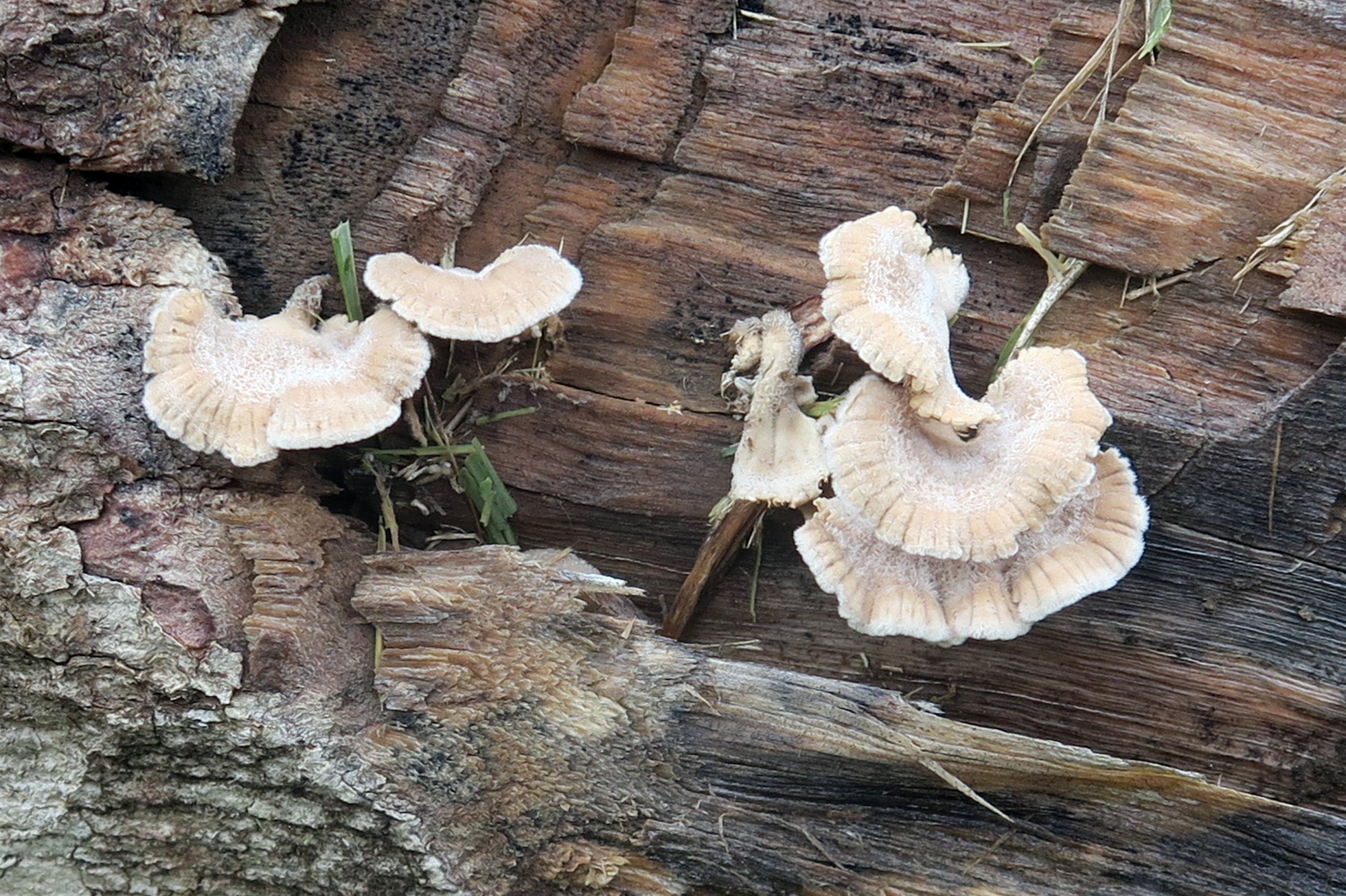 La primera parece un primordio de Fomitopsis pinicola, sobre la segunda es bien sencilla y ni hace falta fotos del himenio, pues se trata de la muy abundante Schizophyllum commune.