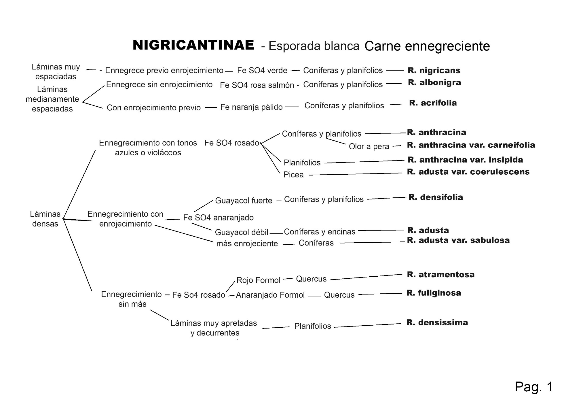 Como con las Russulas siempre he tenido muchas dificultades para su identificación ya hace un par de años confeccioné unas chuletas para simplificar un poco el proceso. Dejo un pantallazo en formato de imagen de la chuleta que se corresponde con las Nigricantinae (carne ennegreciente al corte o roce) por si puede ayudar en algo.