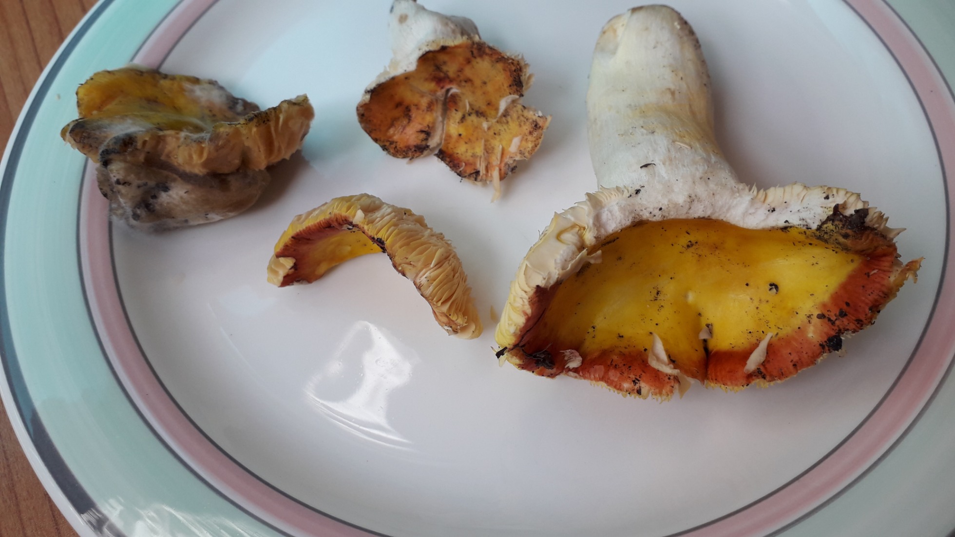 Adjunto fotos de los que creo es una russula aurea. Podeis confirmarlo?. Sombrero de color amarillo con bordes rojos, carne blanca, láminas ligeramente amarillentas. Pie robusto con ligeros tonos amarillentos. Bajo coniferas.