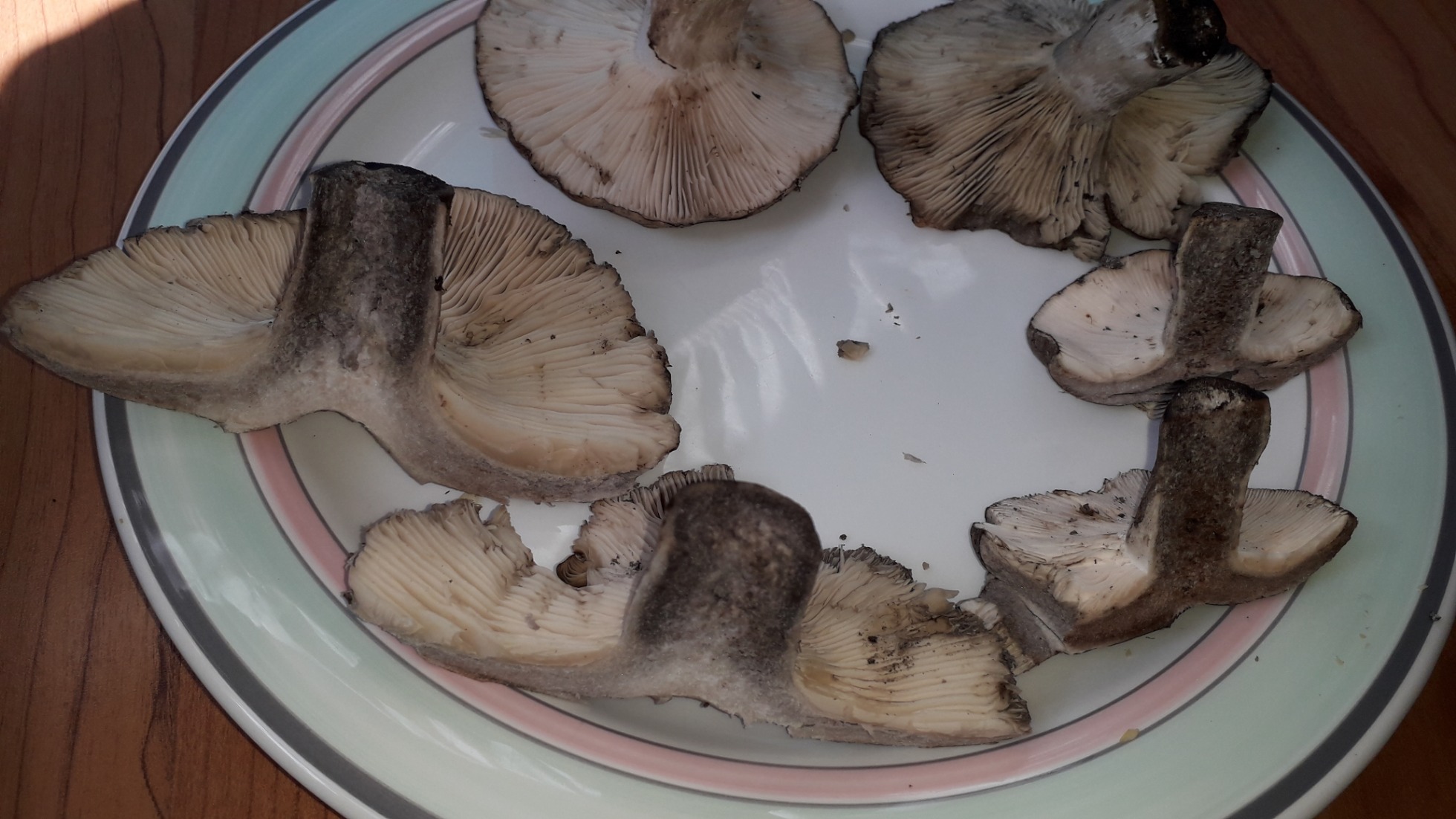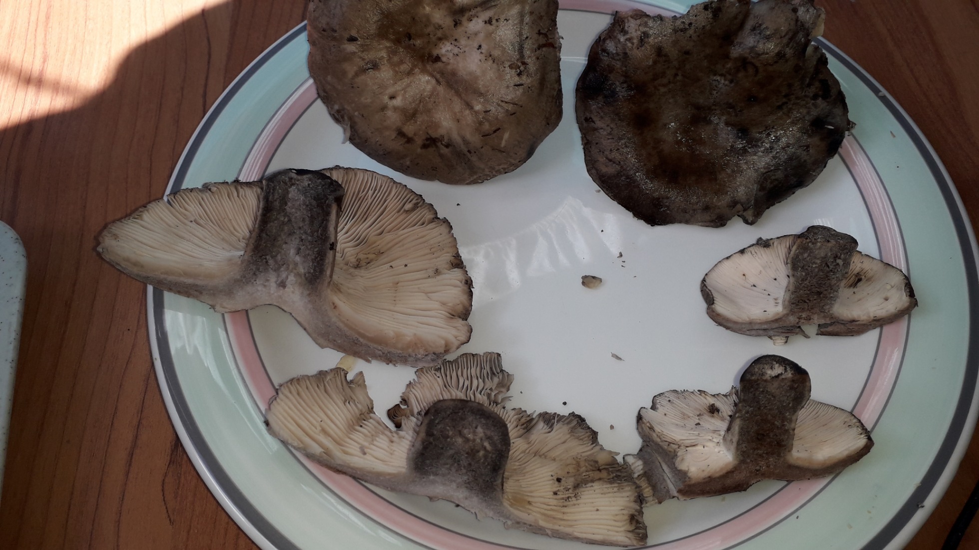 Por otra parte adjunto otras fotos de otro especimen de color gris parduzco con láminas blancas, pie tambien blanco. La carne va del blanco al gris y al corte aparecen tonos granates que luego desaparecen quedando tonos gris oscuros.