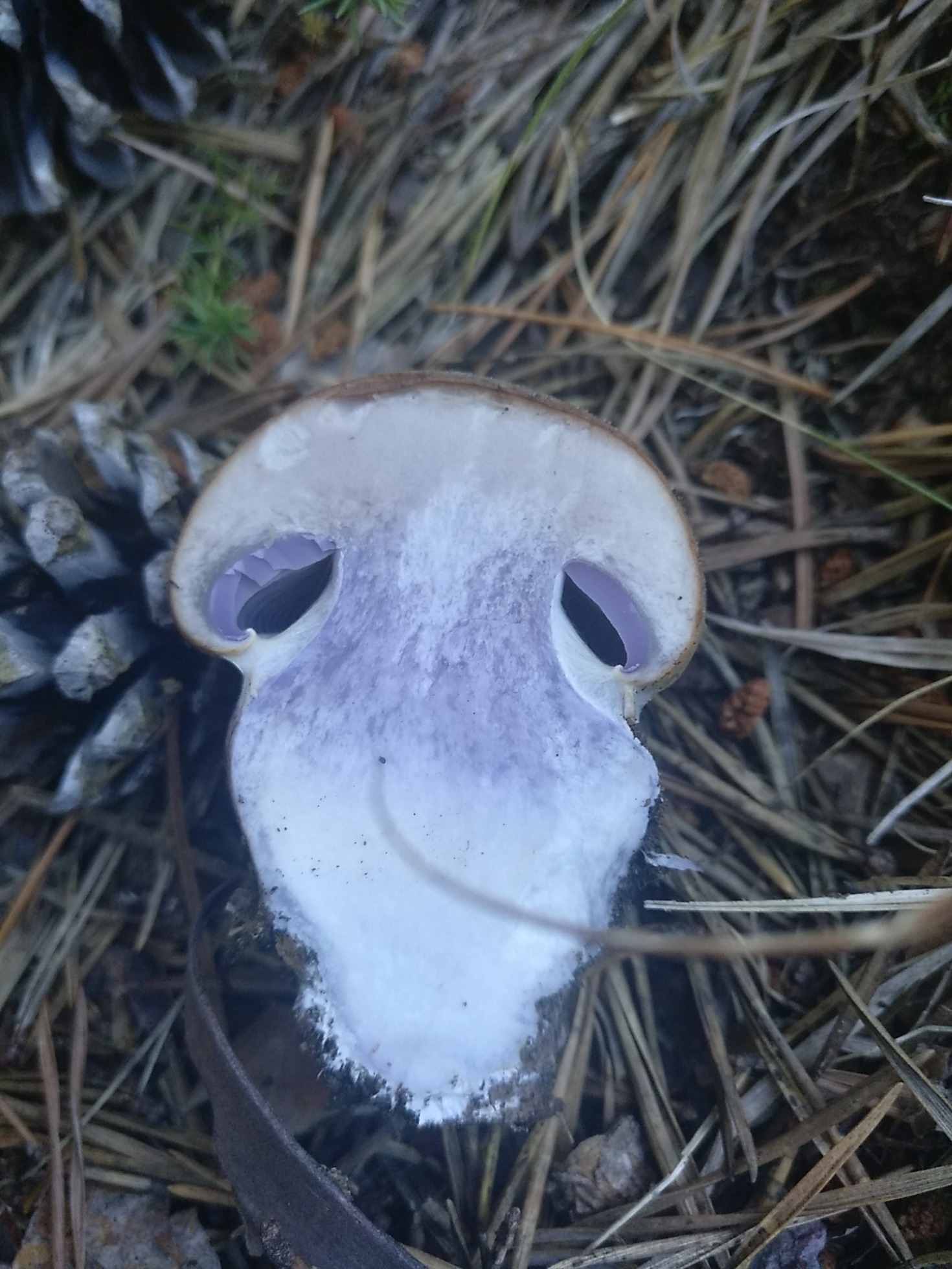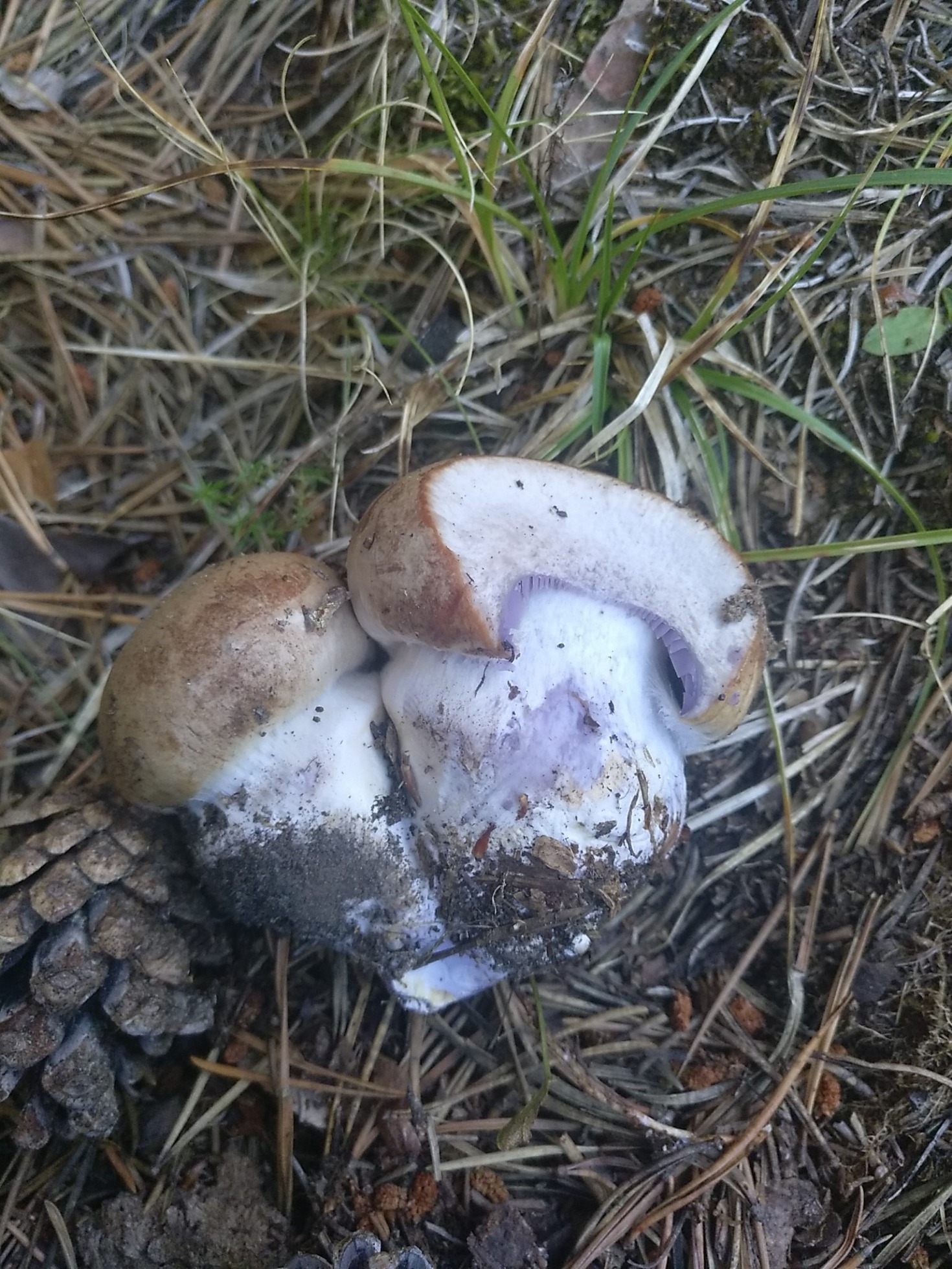 La siguiente seta me parece un Cortinario Púrpura. Son ejemplares muy jóvenes, de unos 5 cm de altura, láminas en tonos violeta. Bulbo en la base del pie.